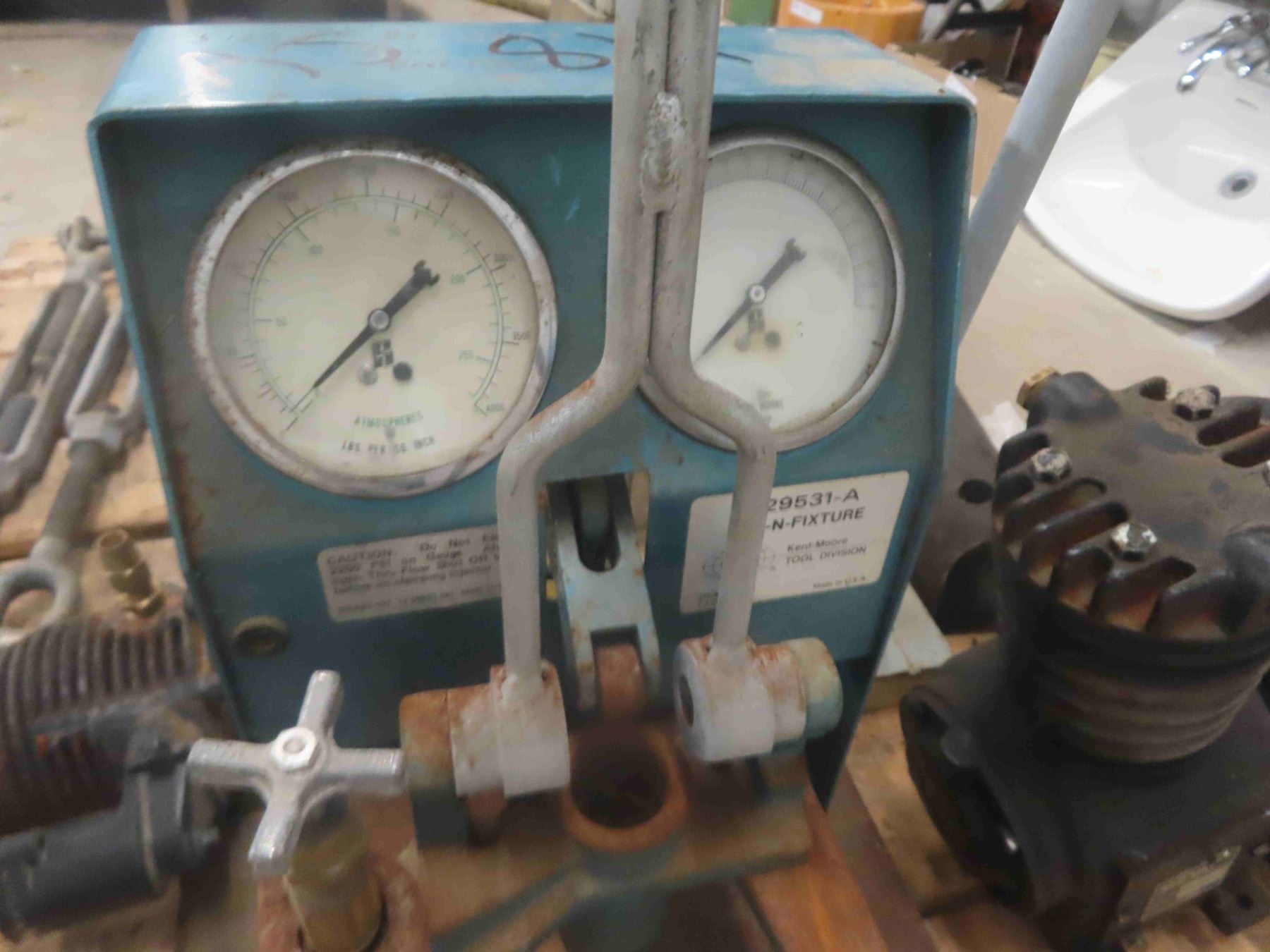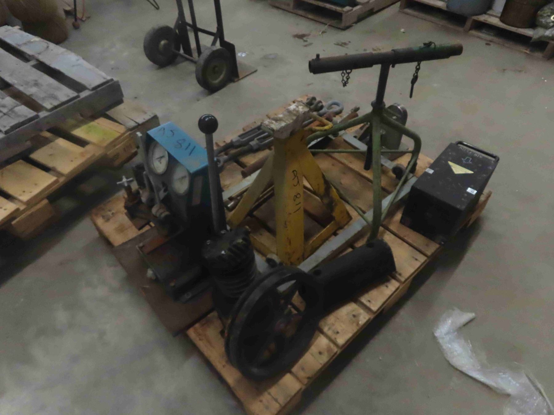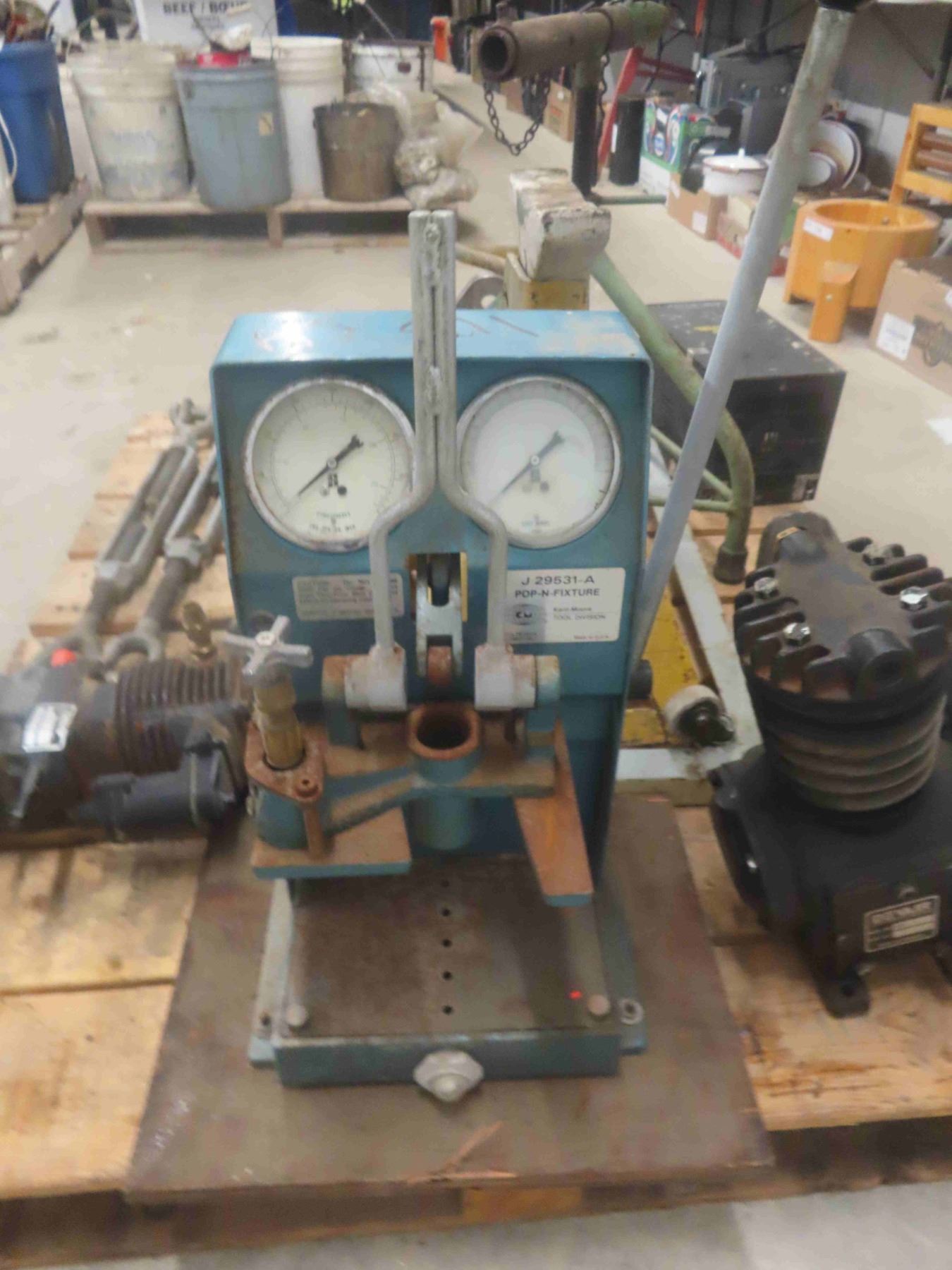 Pallet Lot ; Air Compressor Head, Heavy Duty Stabilizer Jack, Cable Tightener, Solid Rid, Platform Dolly Frame, Hitch, Pop n Fixture - Kent Moore