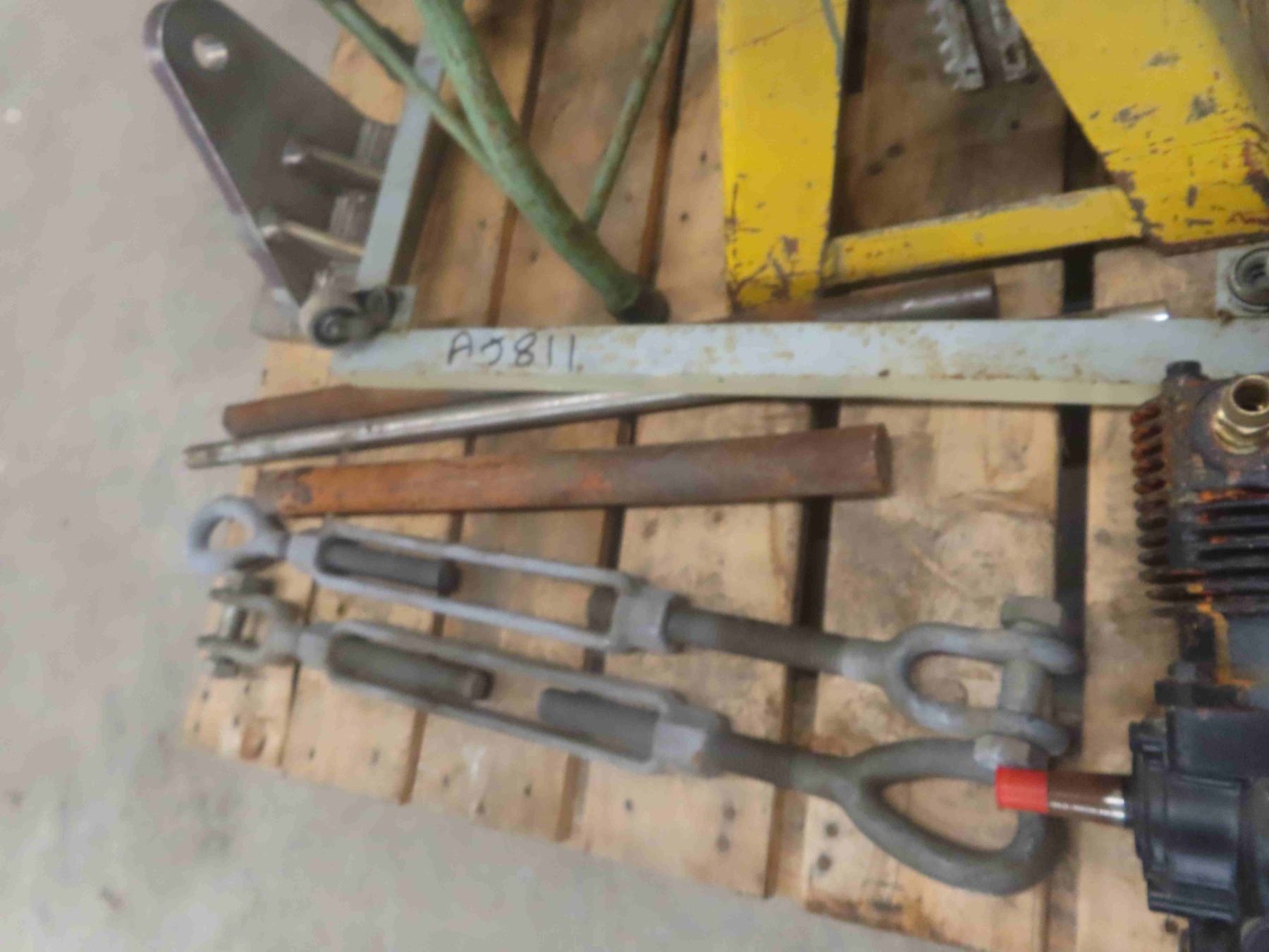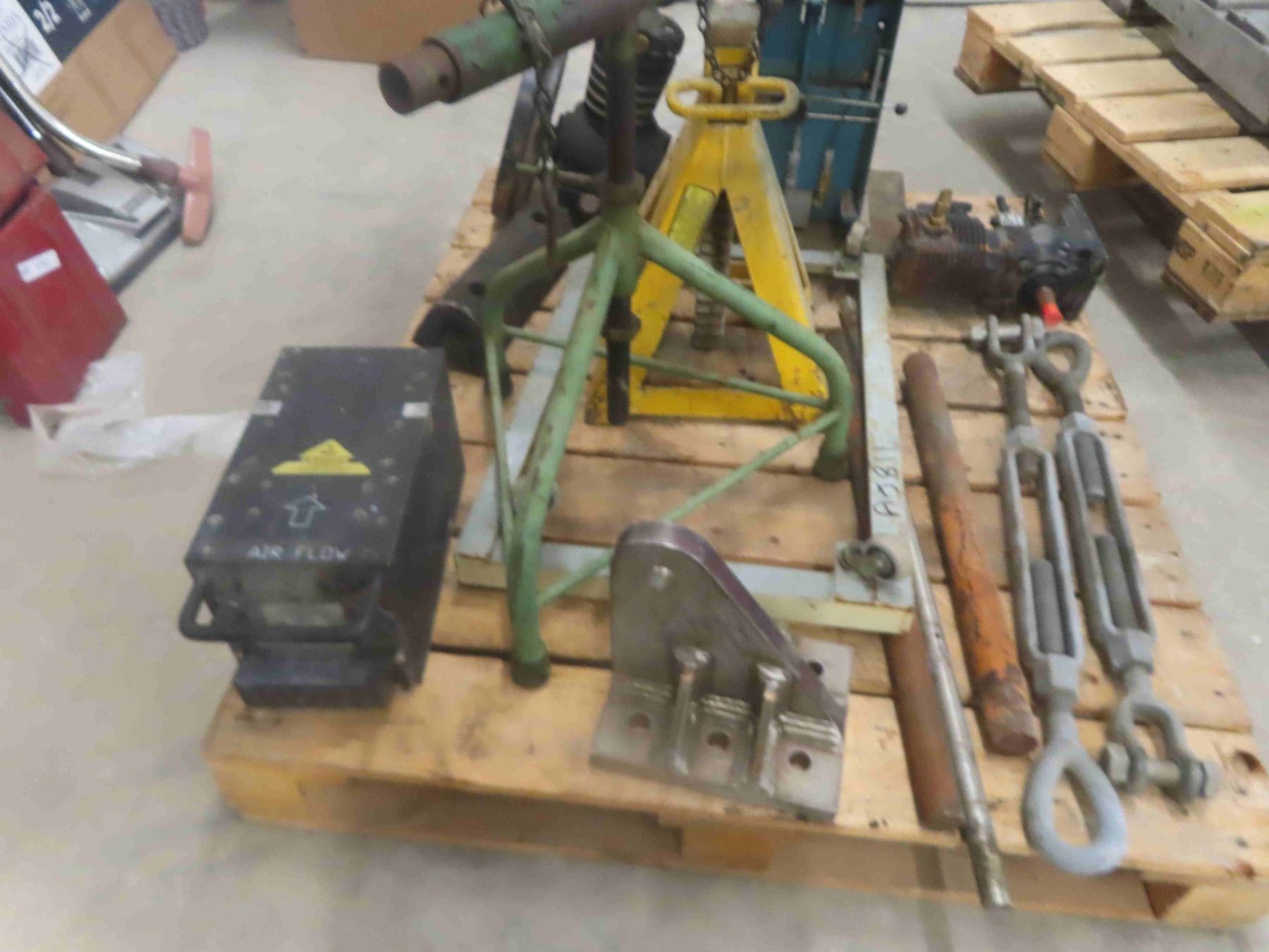 Pallet Lot ; Air Compressor Head, Heavy Duty Stabilizer Jack, Cable Tightener, Solid Rid,
