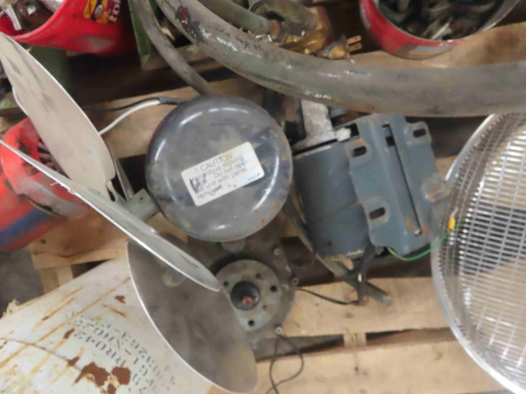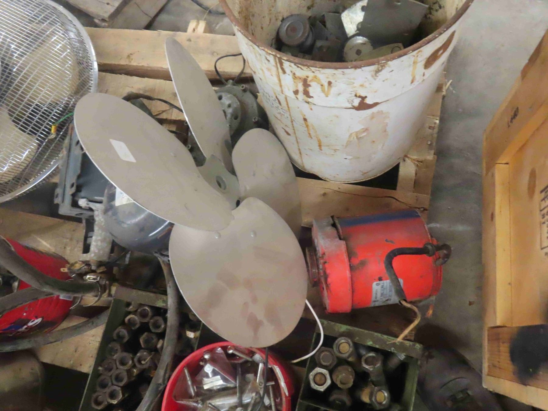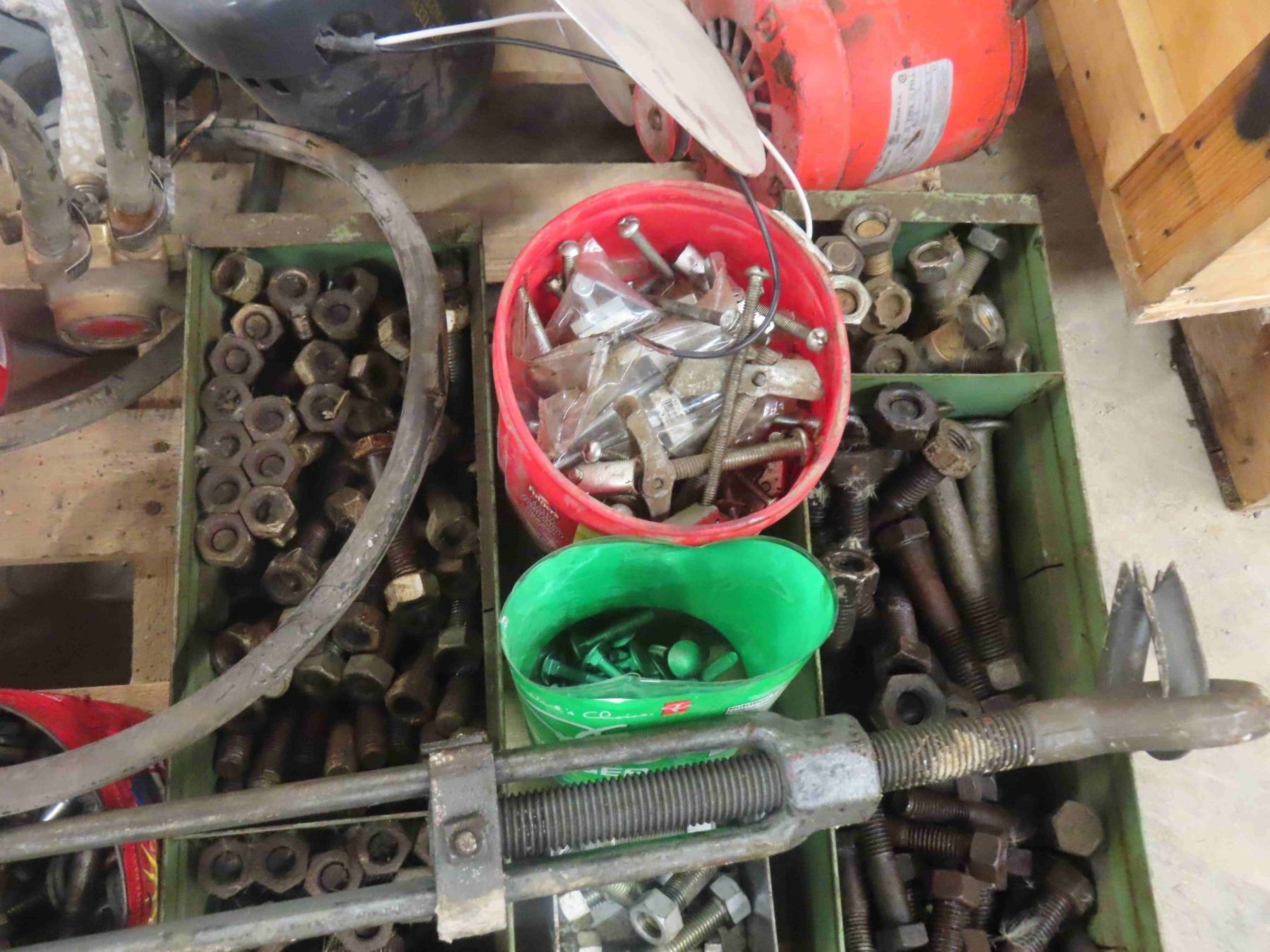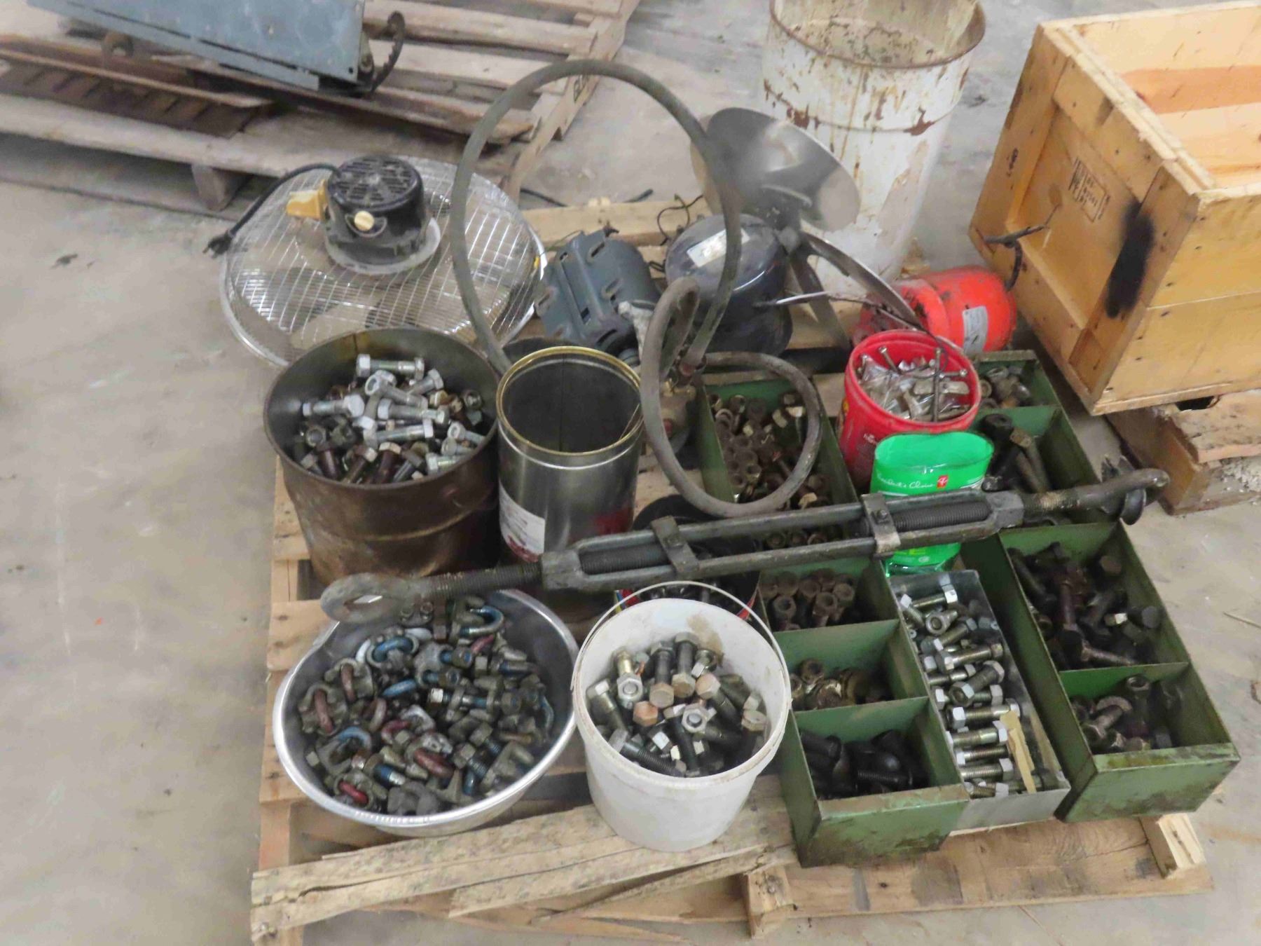 Pallet Lot of Bolts, Nuts, Cable Clamps, Cable Tighteners, 3 Electric Motors, Fan, Rolling Slide Door Hardware