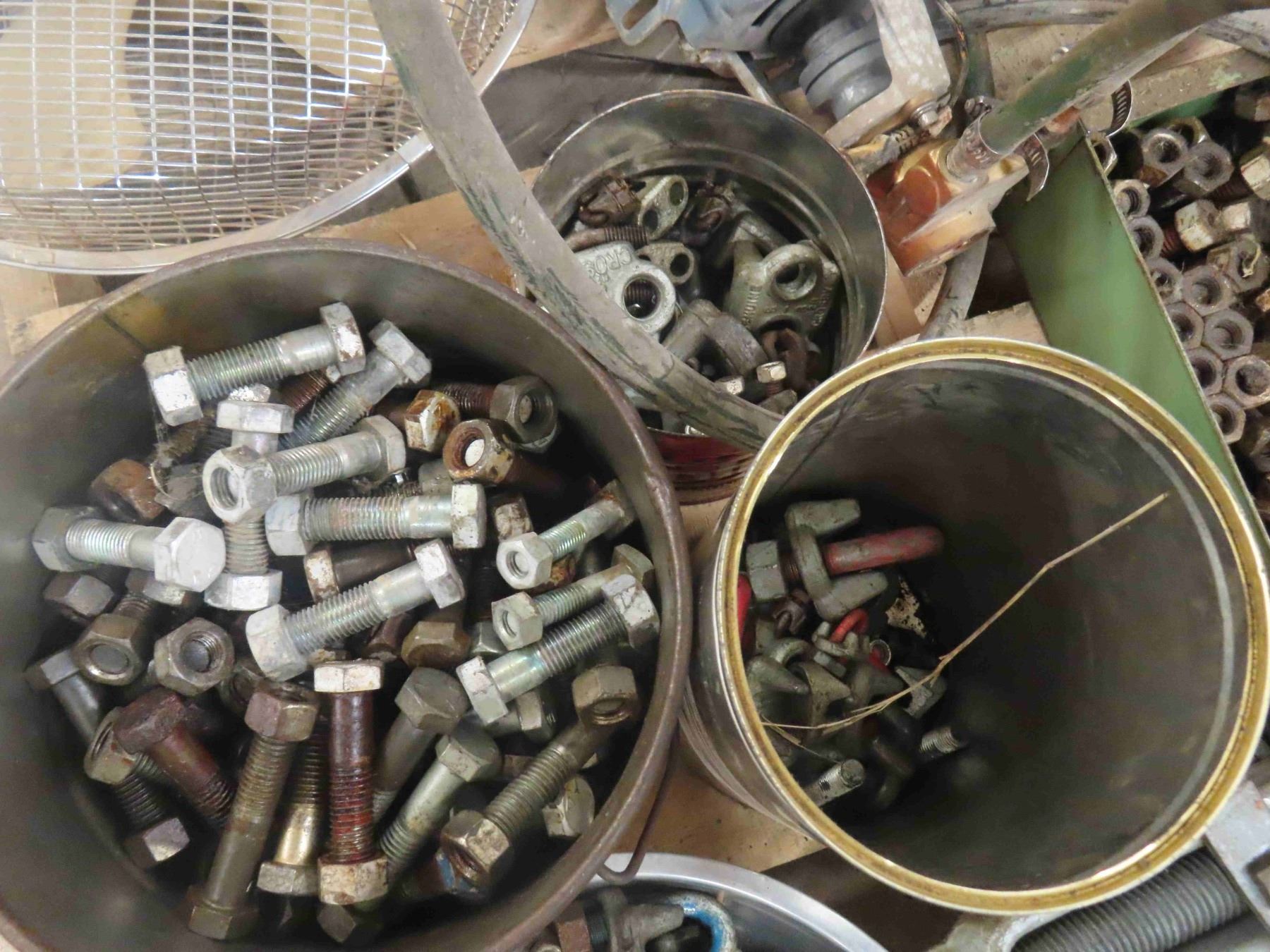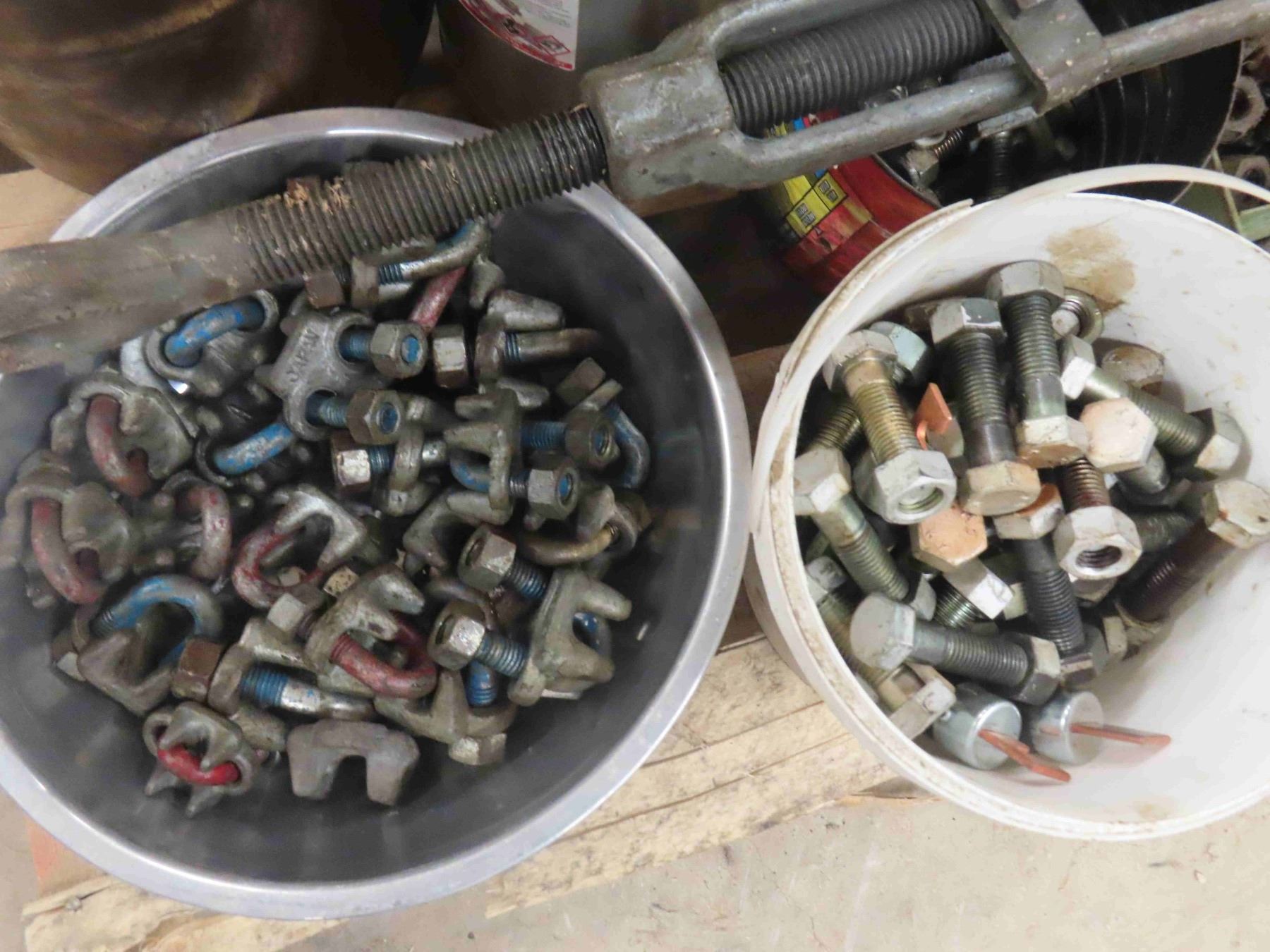 Pallet Lot of Bolts, Nuts, Cable Clamps, Cable Tighteners, 3 Electric Motors