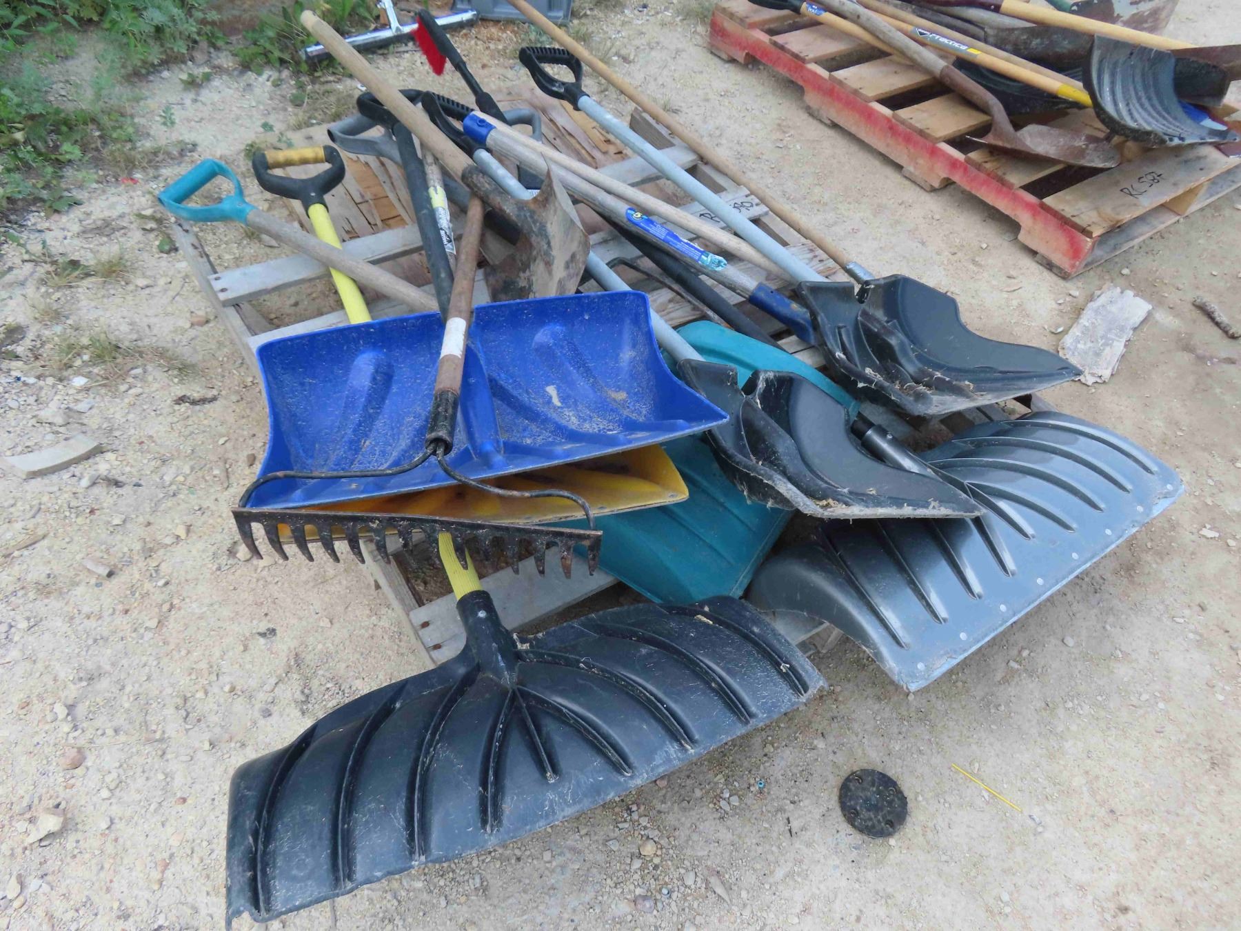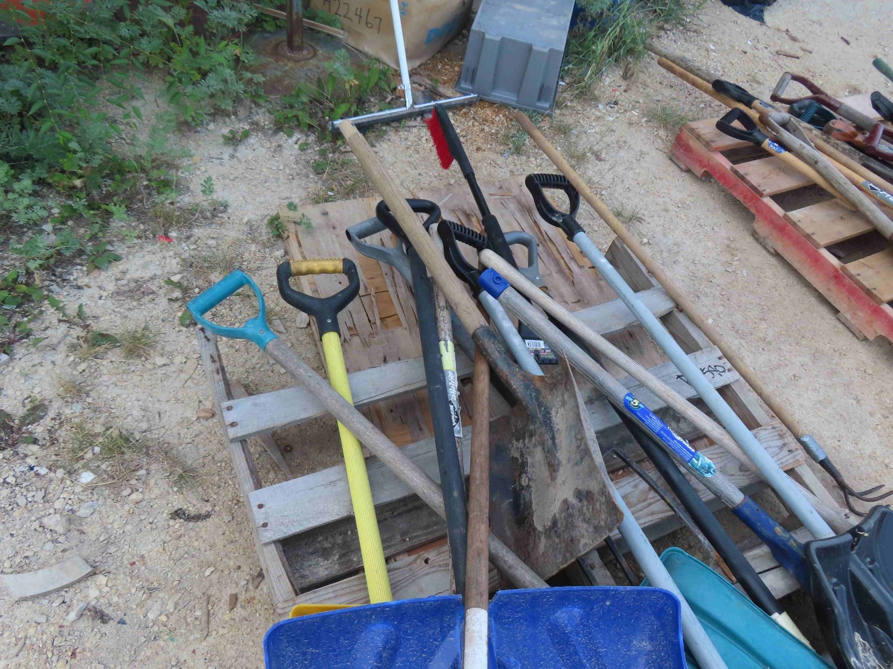 Pallet with Mostly ; Shovels, Potato Fork, chopper, Cultivator, Rake