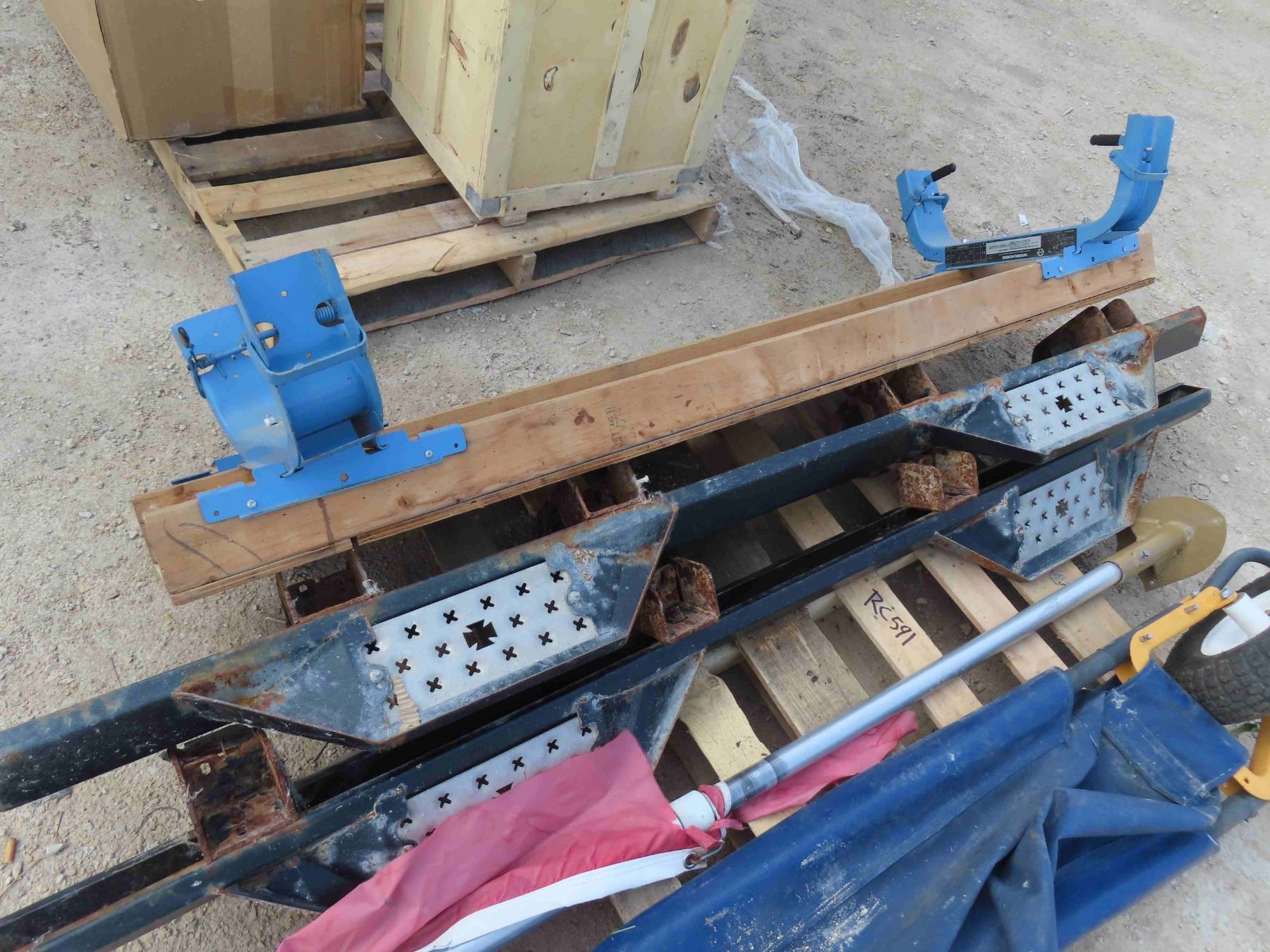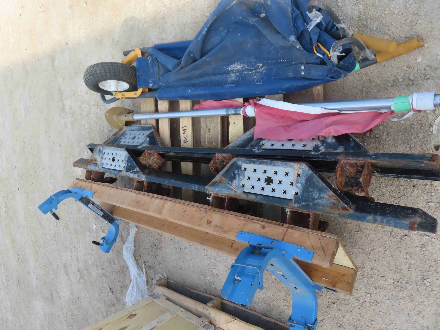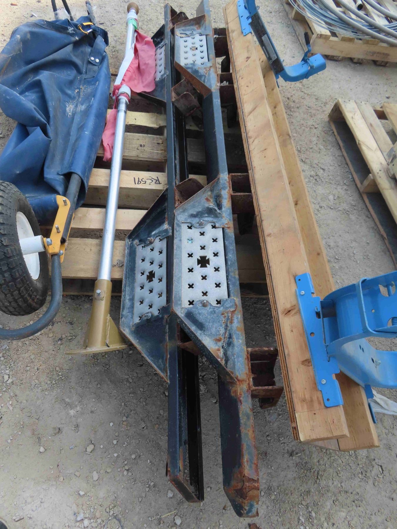 Pallet with Scaffolding Top + Brackets, Pair of Running Boards, Flag Pole, Collapsible Wheel Barrow