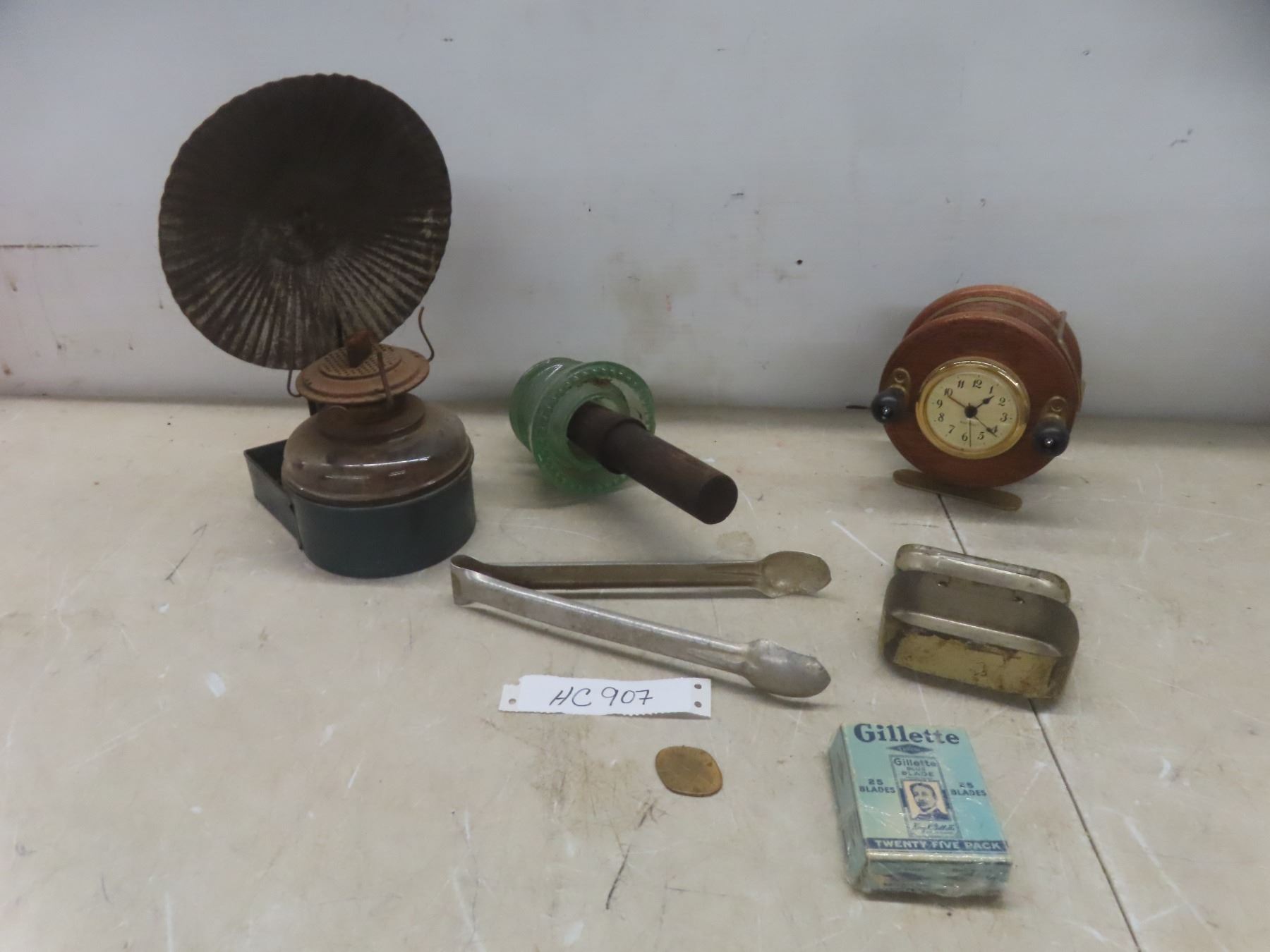Peetz Reel Time Clock, Oil Lantern, Insulator, Gillette Blades