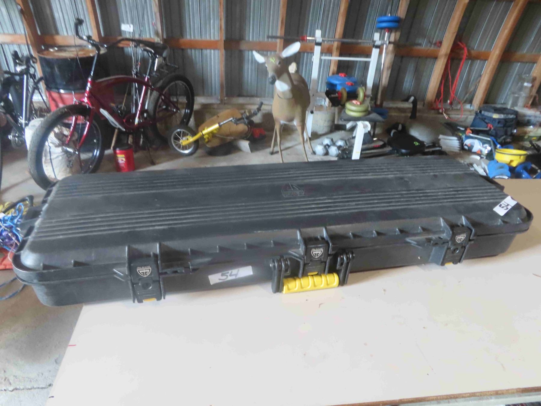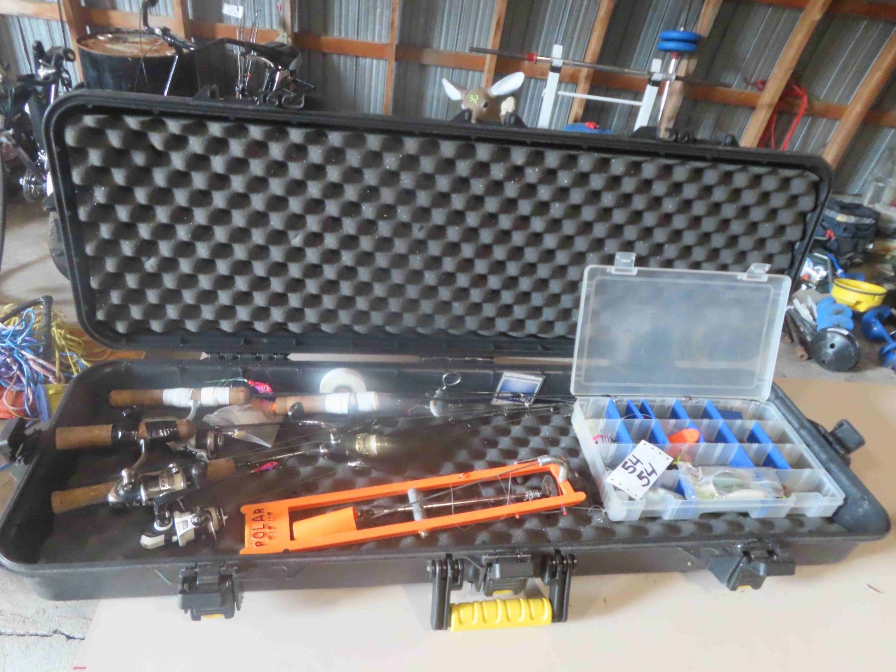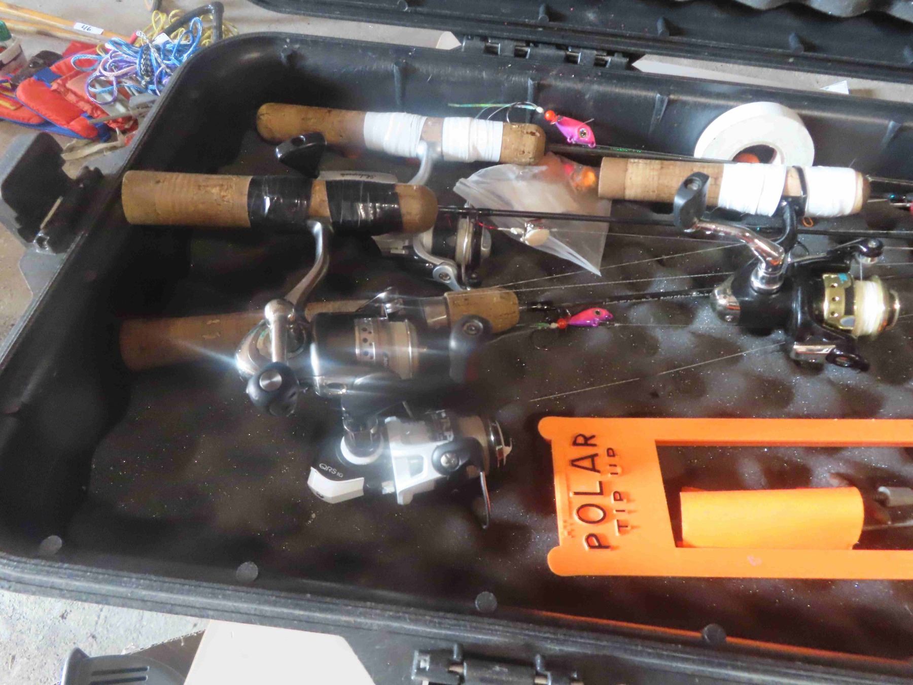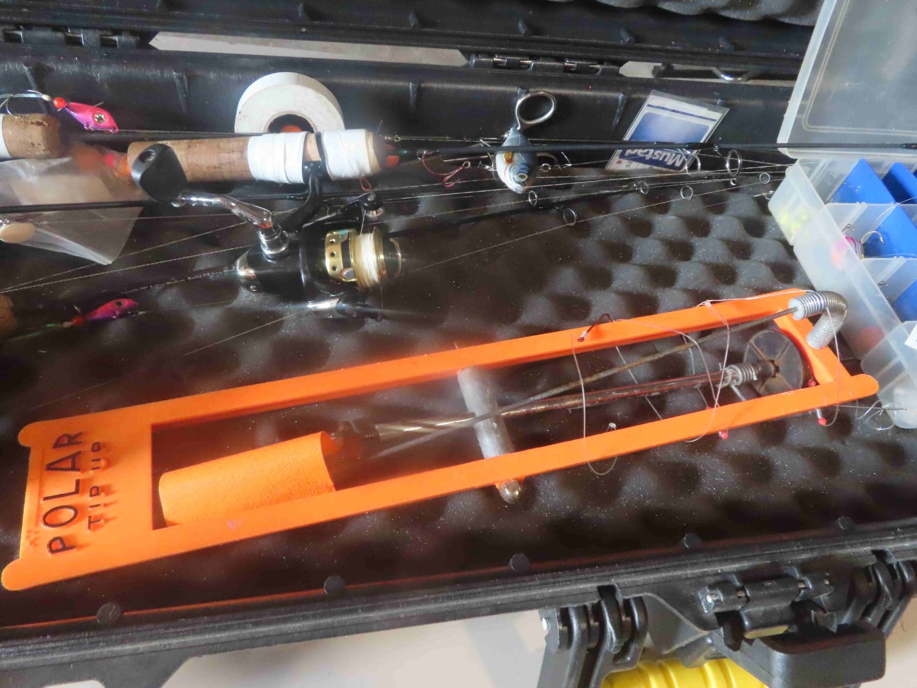 Piano Gun Guard Hard Case with 4 Ice Fishing Rods and Reels, Hooks and Weights, Tip Up