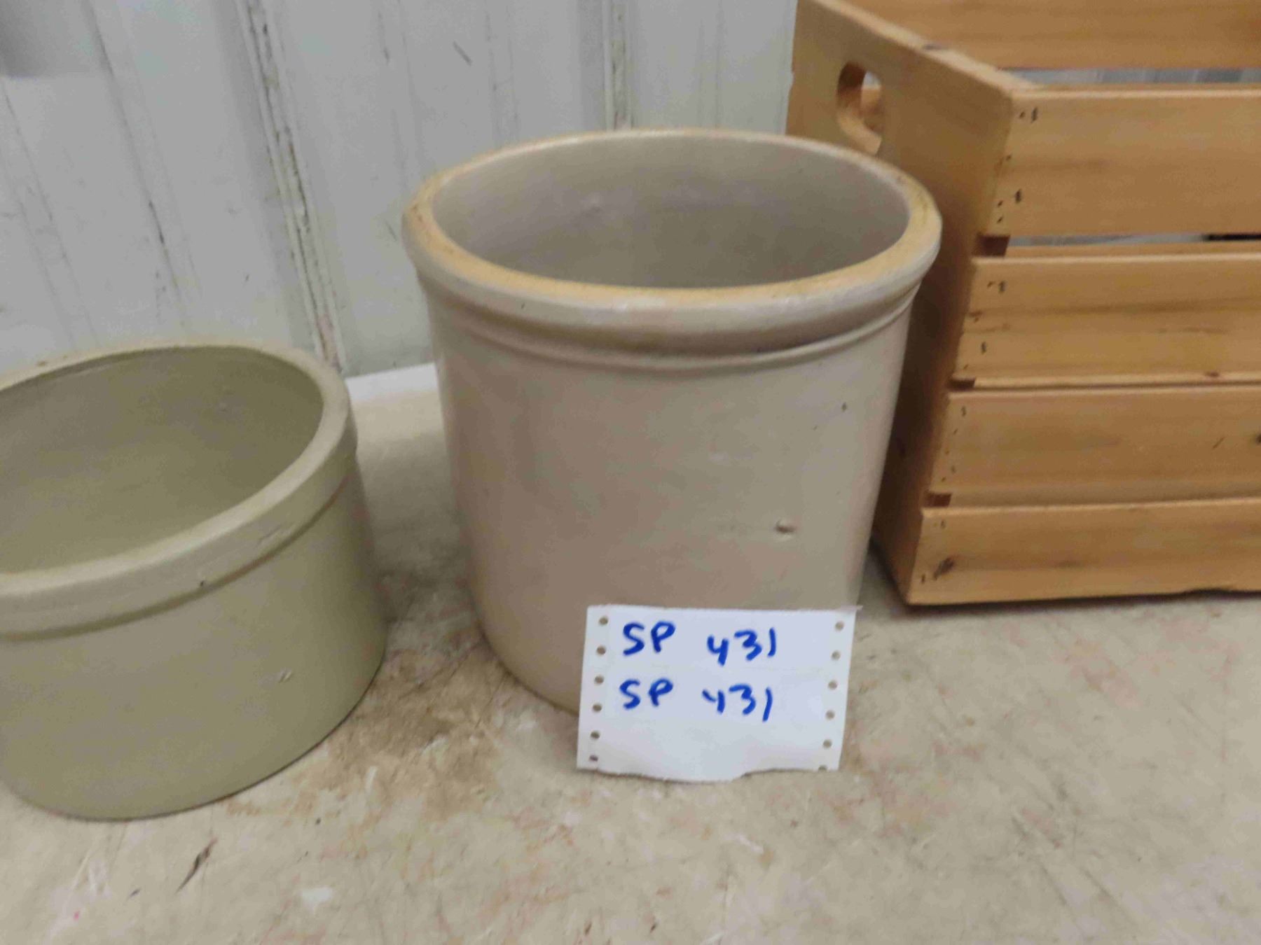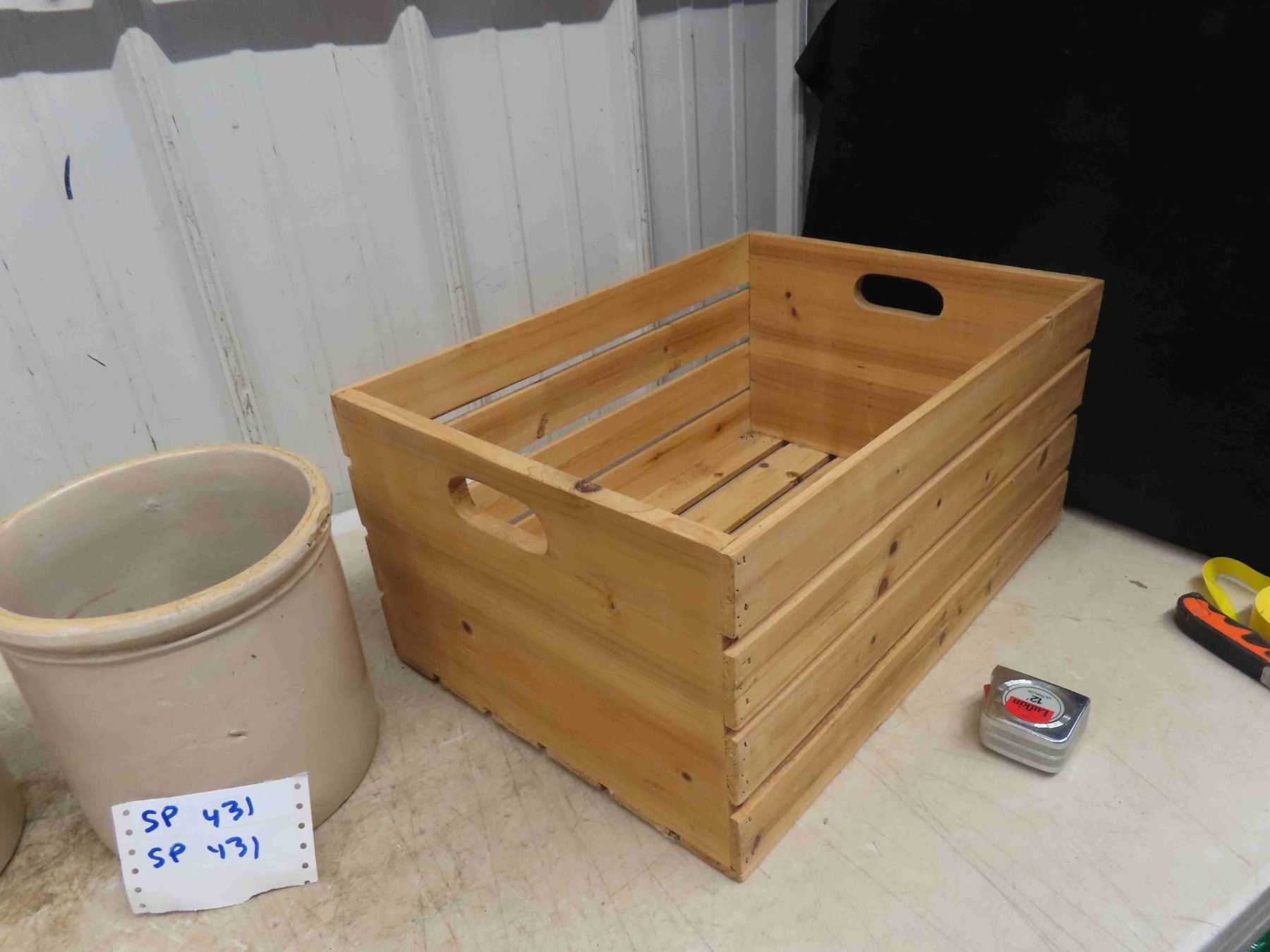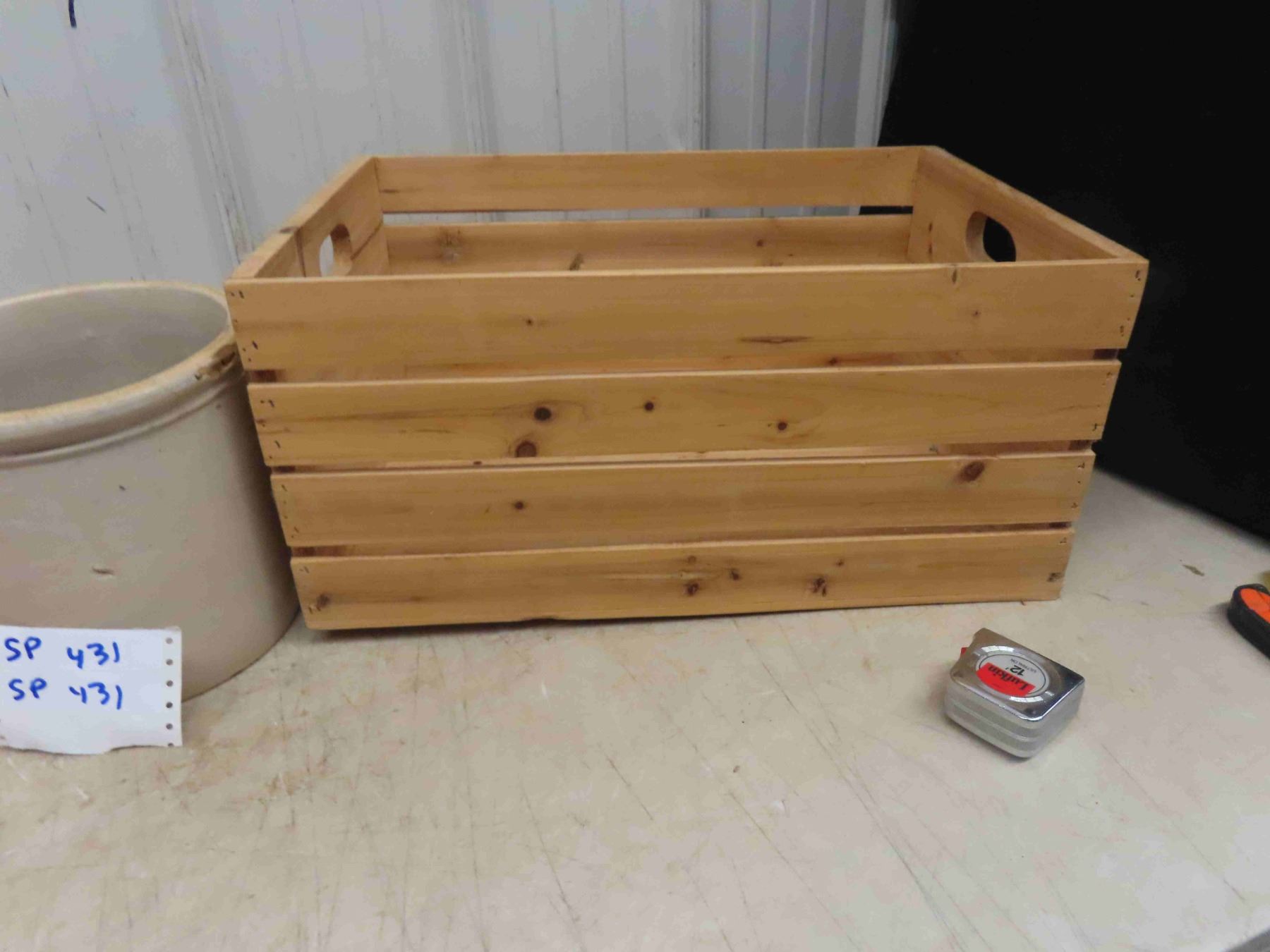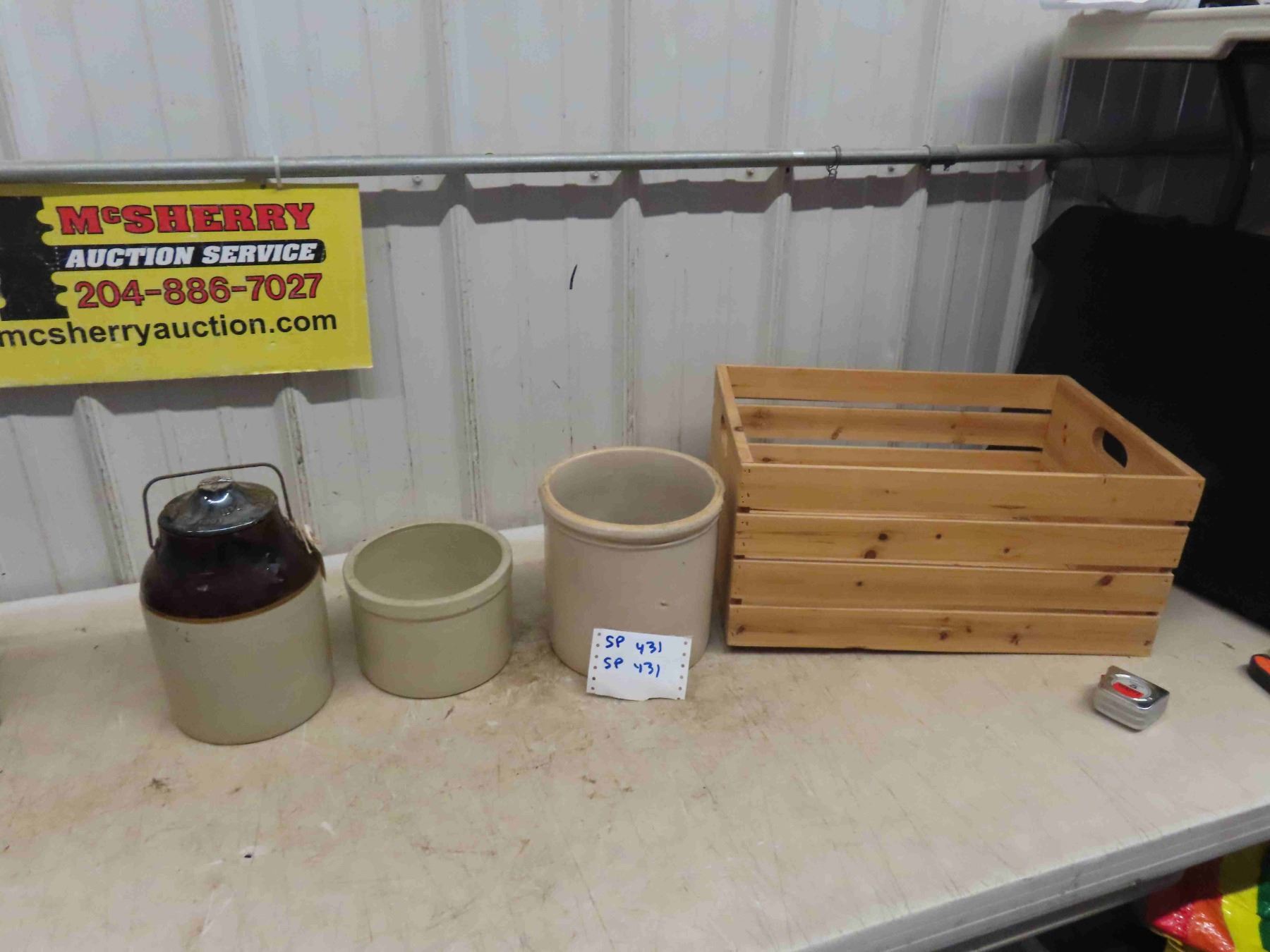 Pickle Crock , 1/2 Gal Butter Crock , 1 Gal Crock (Has Chip) , Wood Crate