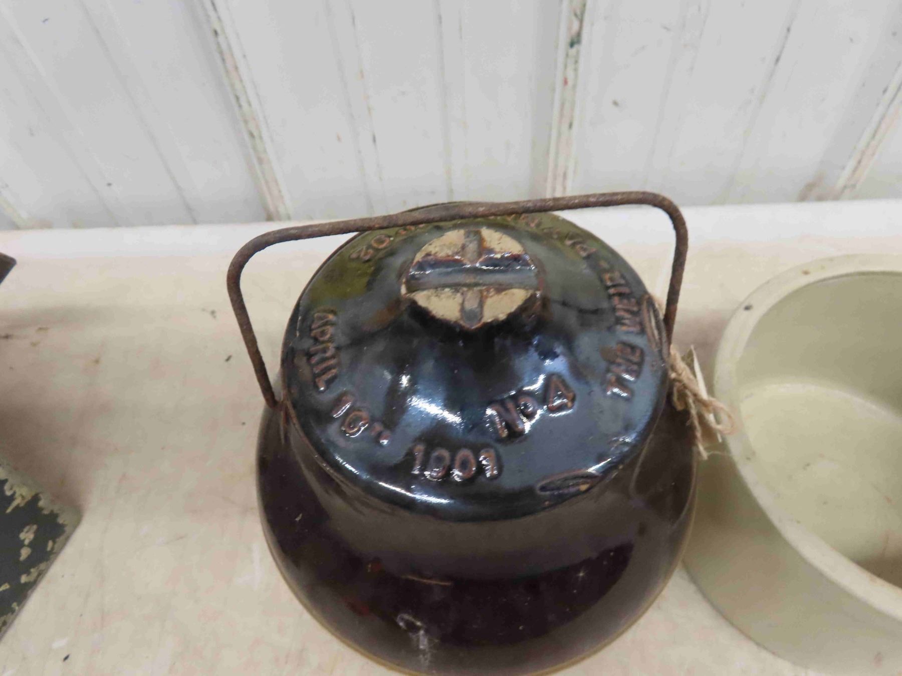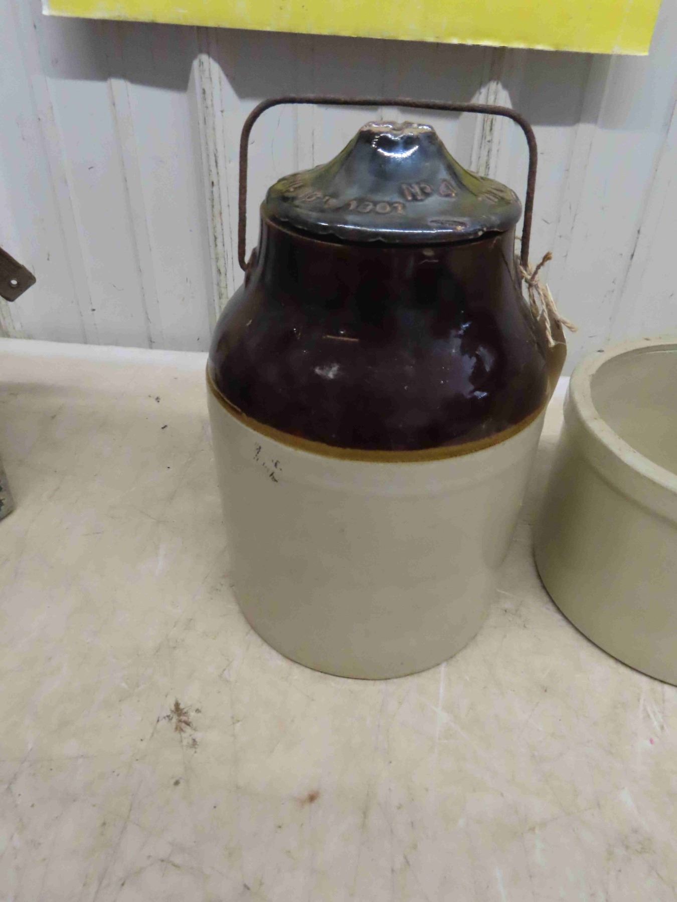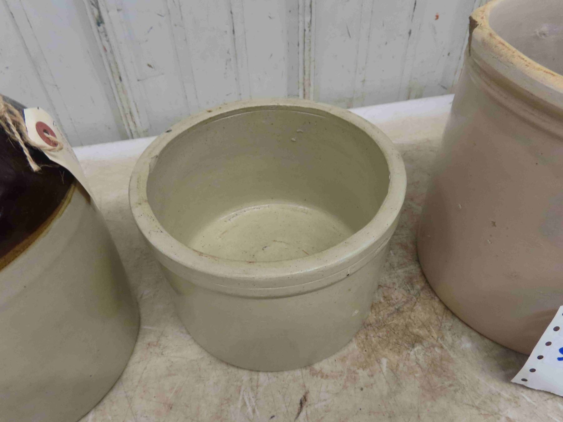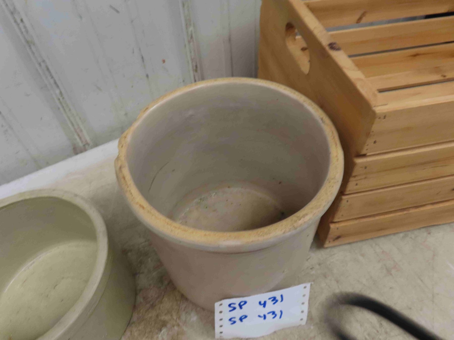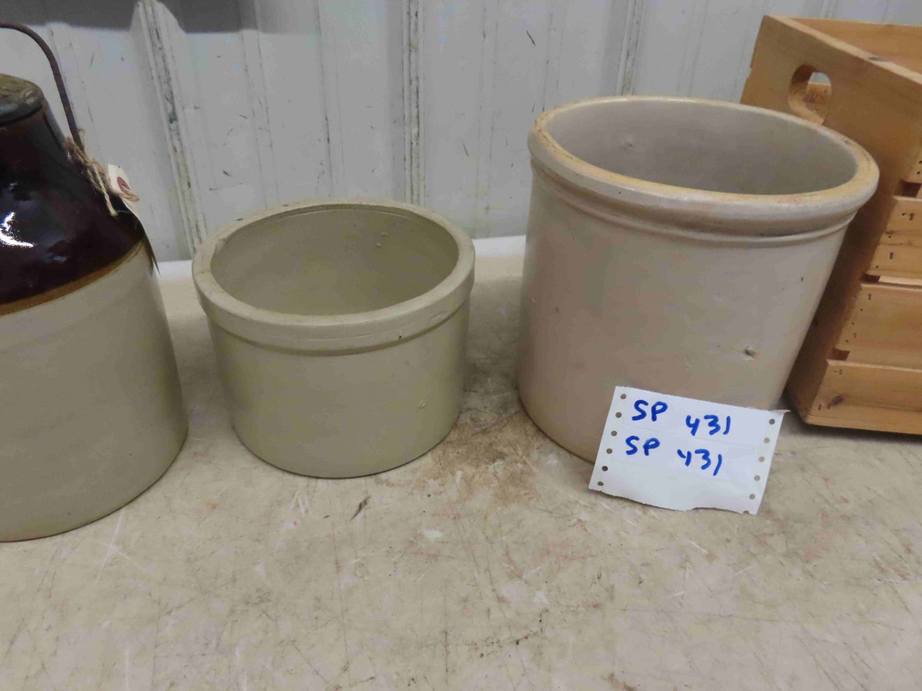Pickle Crock , 1/2 Gal Butter Crock , 1 Gal Crock (Has Chip) , Wood Crate