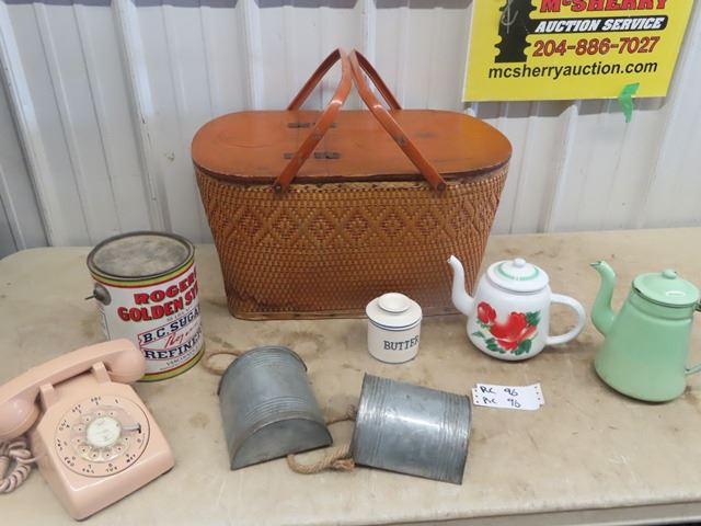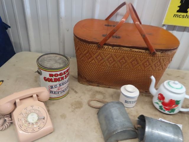 Picnic Basket, 2 Enamel Kettles, Honey Tin, & Rotary Phone