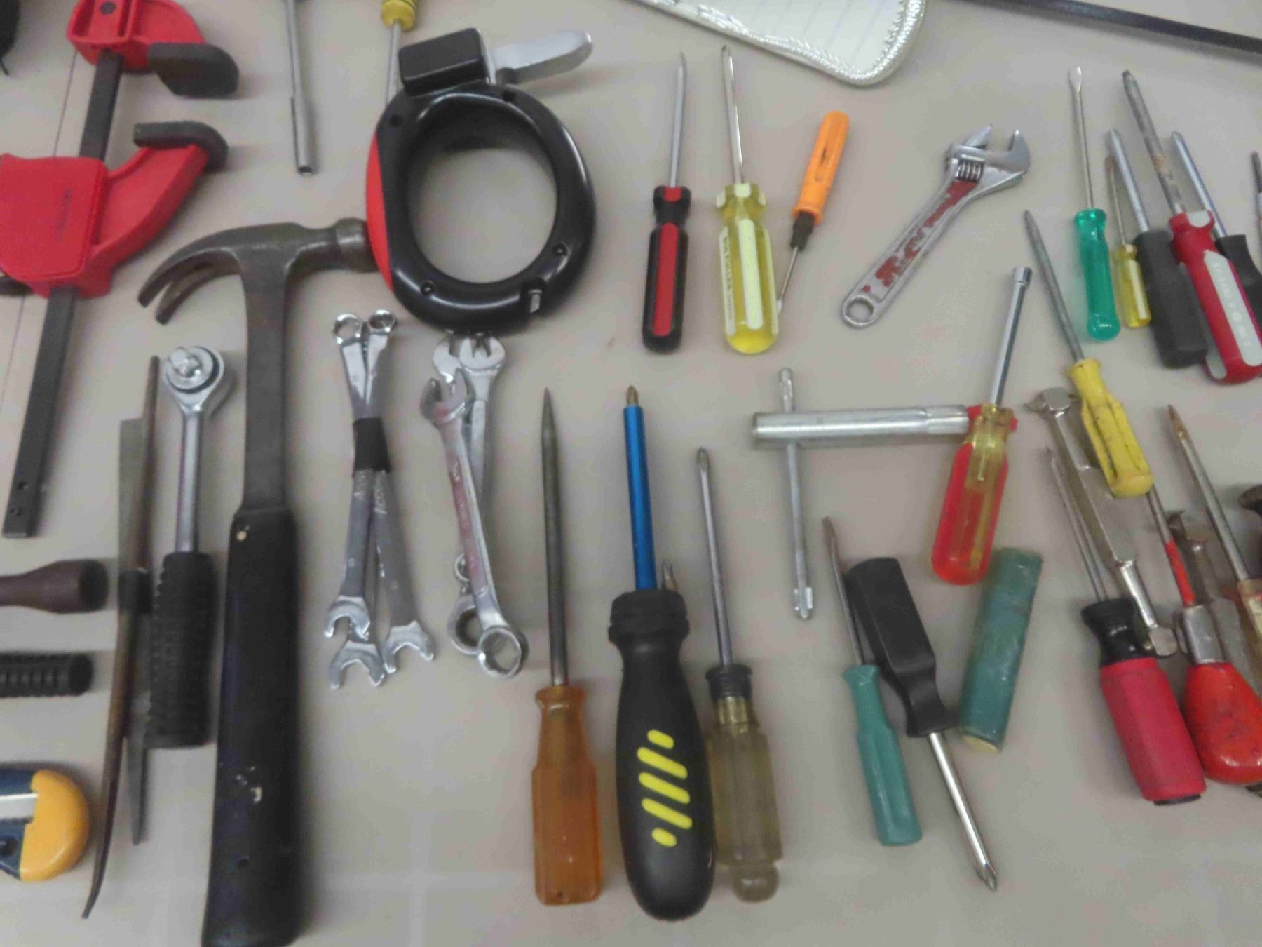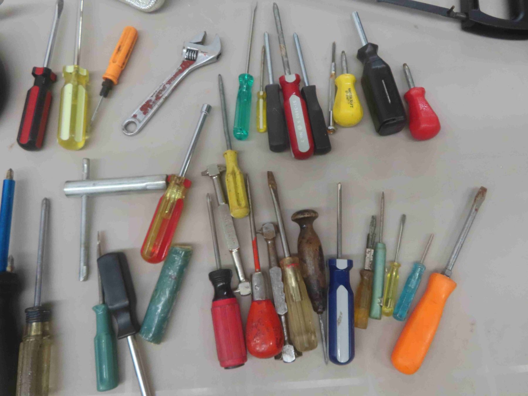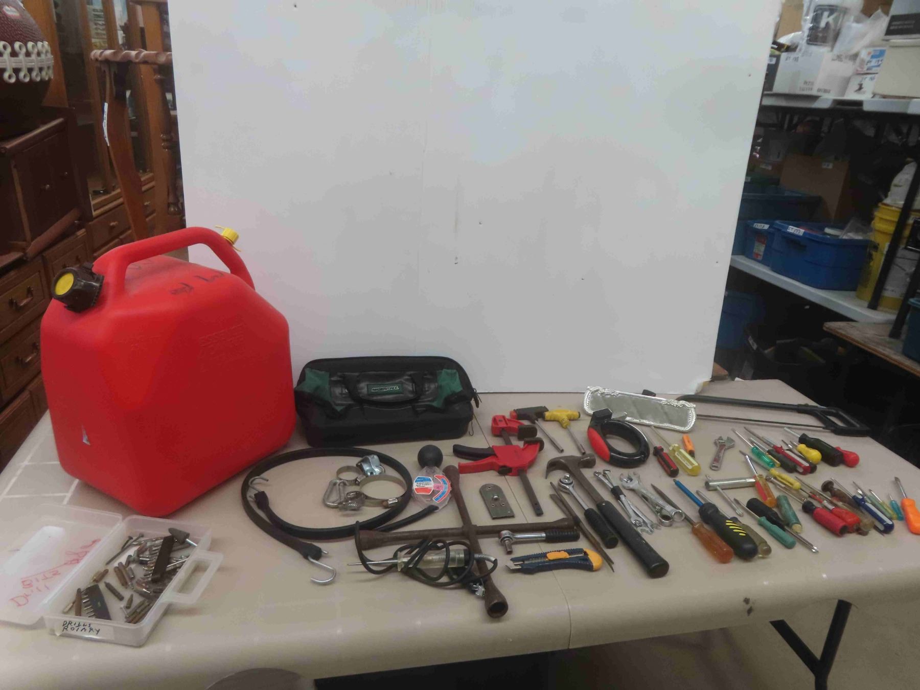 Plastic 5 Gallon Gas Container, Hack Saw, Screwdrivers, Clamp, Hammer & More