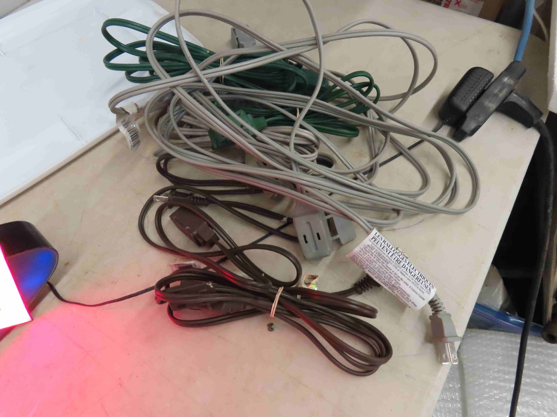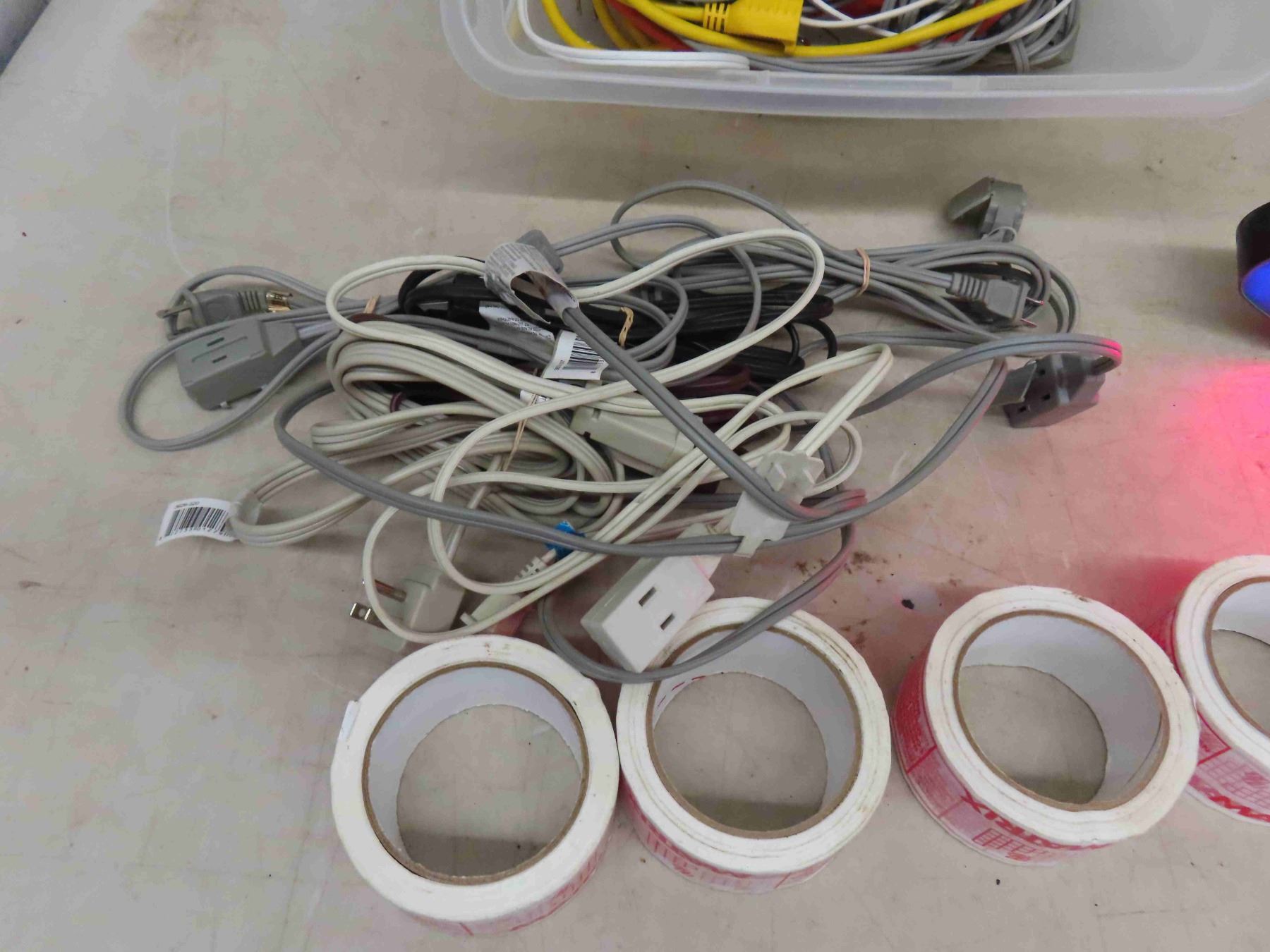 Plastic Bin with Many Extension Cords, LED Open Sign, Speciality Tape