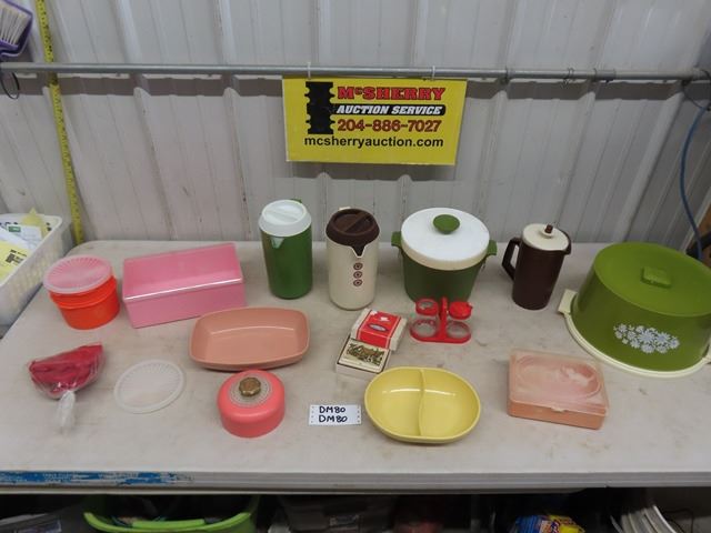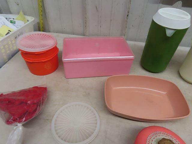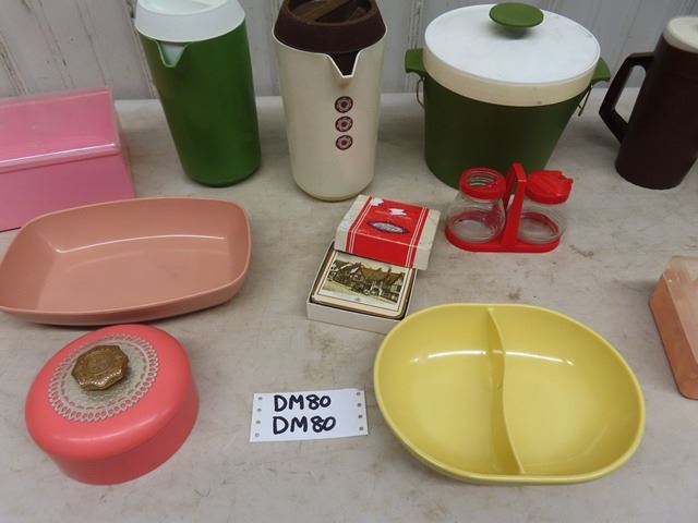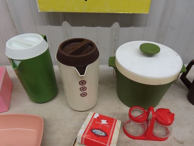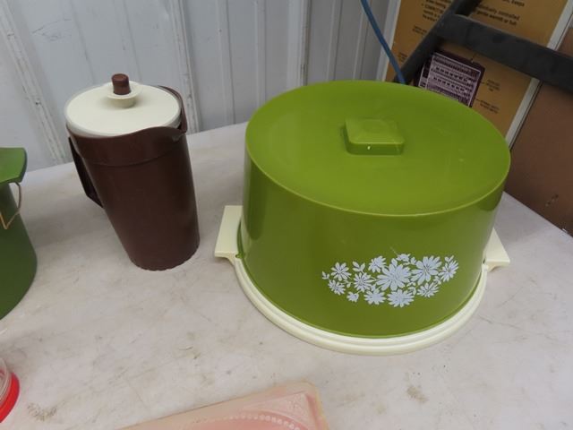Plastic Kitchen Ware ; Juice Jugs, Cake Dome, Melmac Bowls, Tupperware