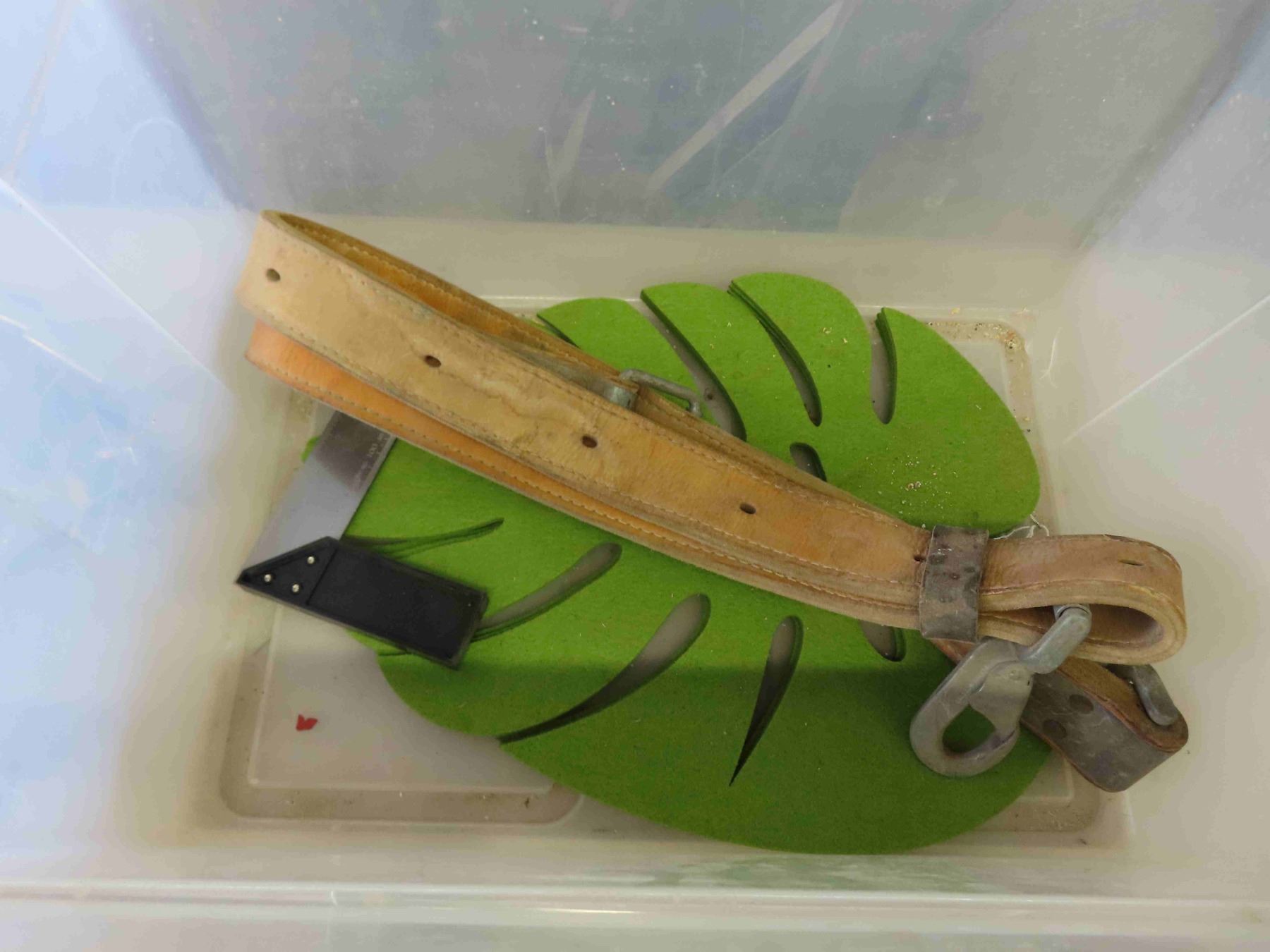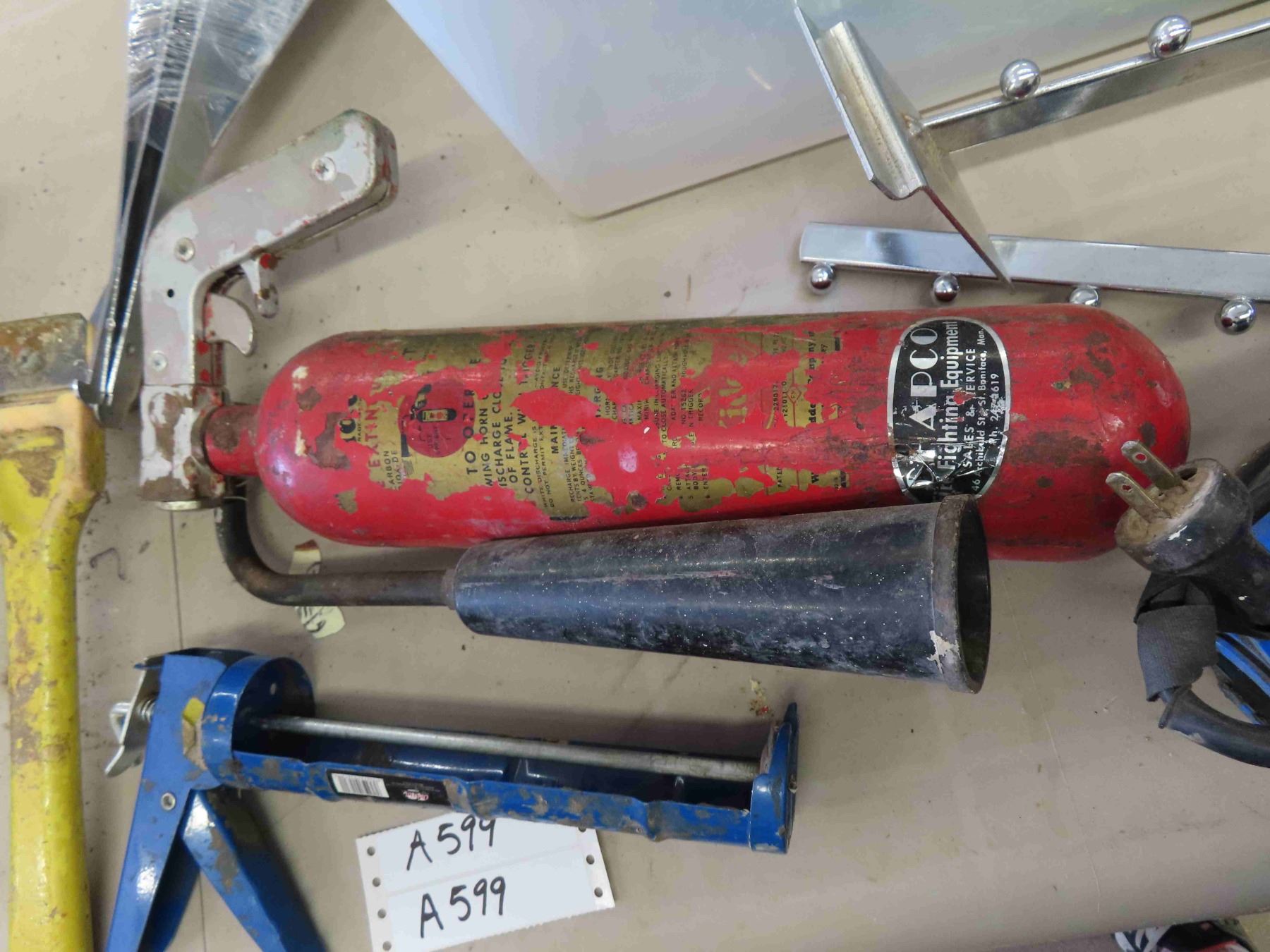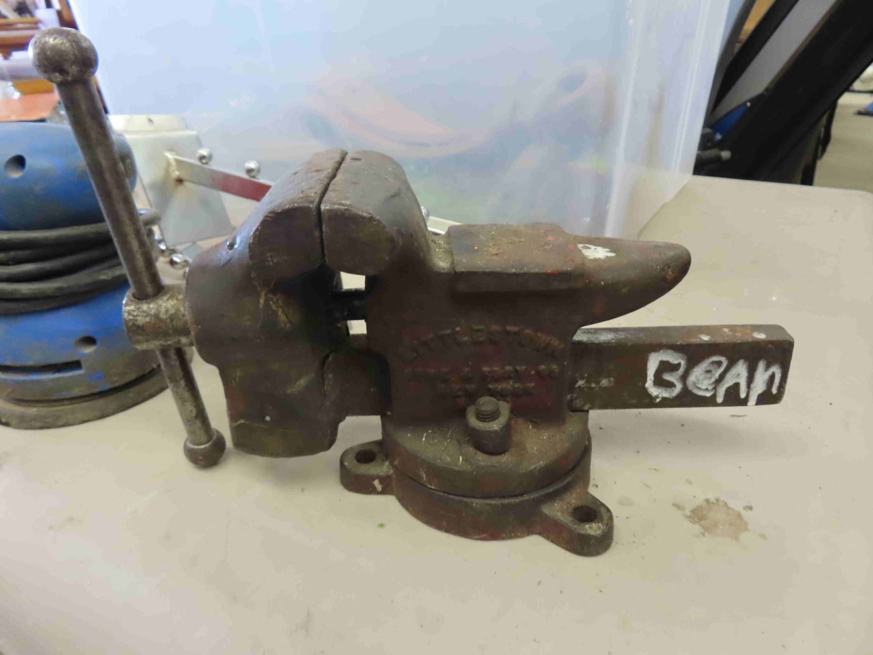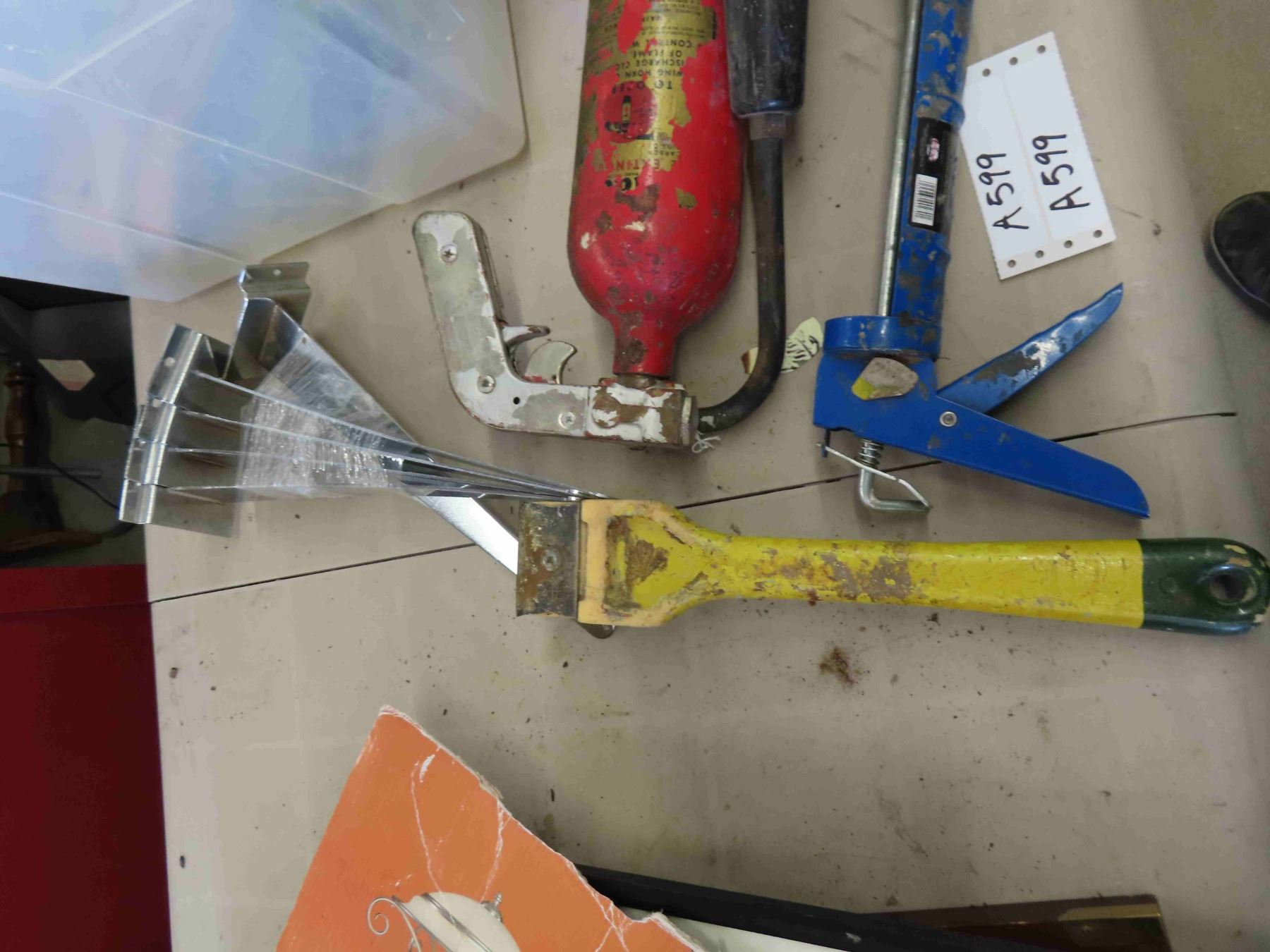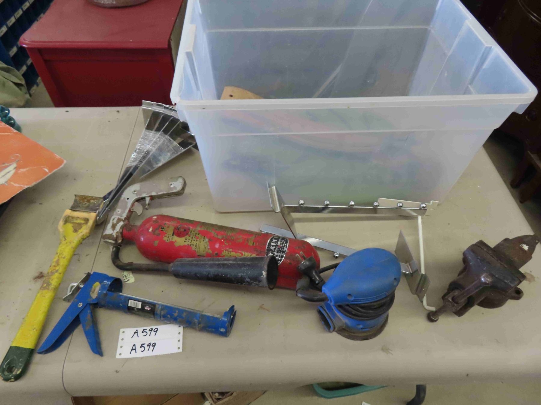 Plastic Tote with Small #112 Vice, Sander, Fire Extinguisher, Shelf Brackets, Leather Belt with 2 Hooks, Scraper, plus more