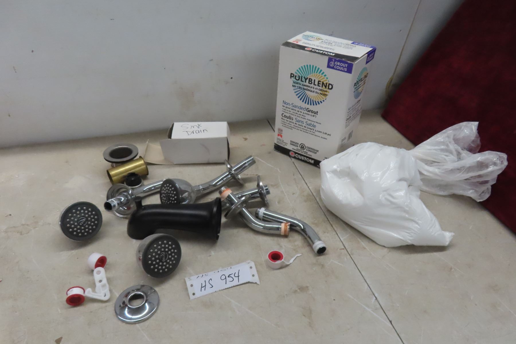 Plumbing Fixtures Sink Drain, Shower Head, Teflon Tape and Polyblend Non Sanded Grout 1/2 Bag