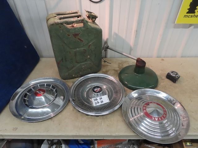 Porc Light Fixture, Military Metal Gas Can, & 3 Hubcaps