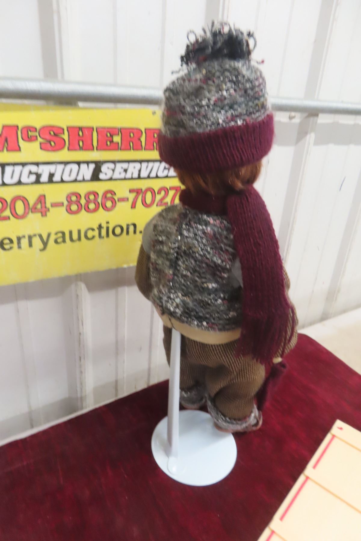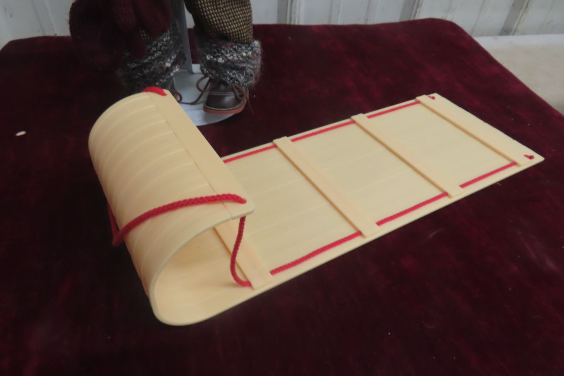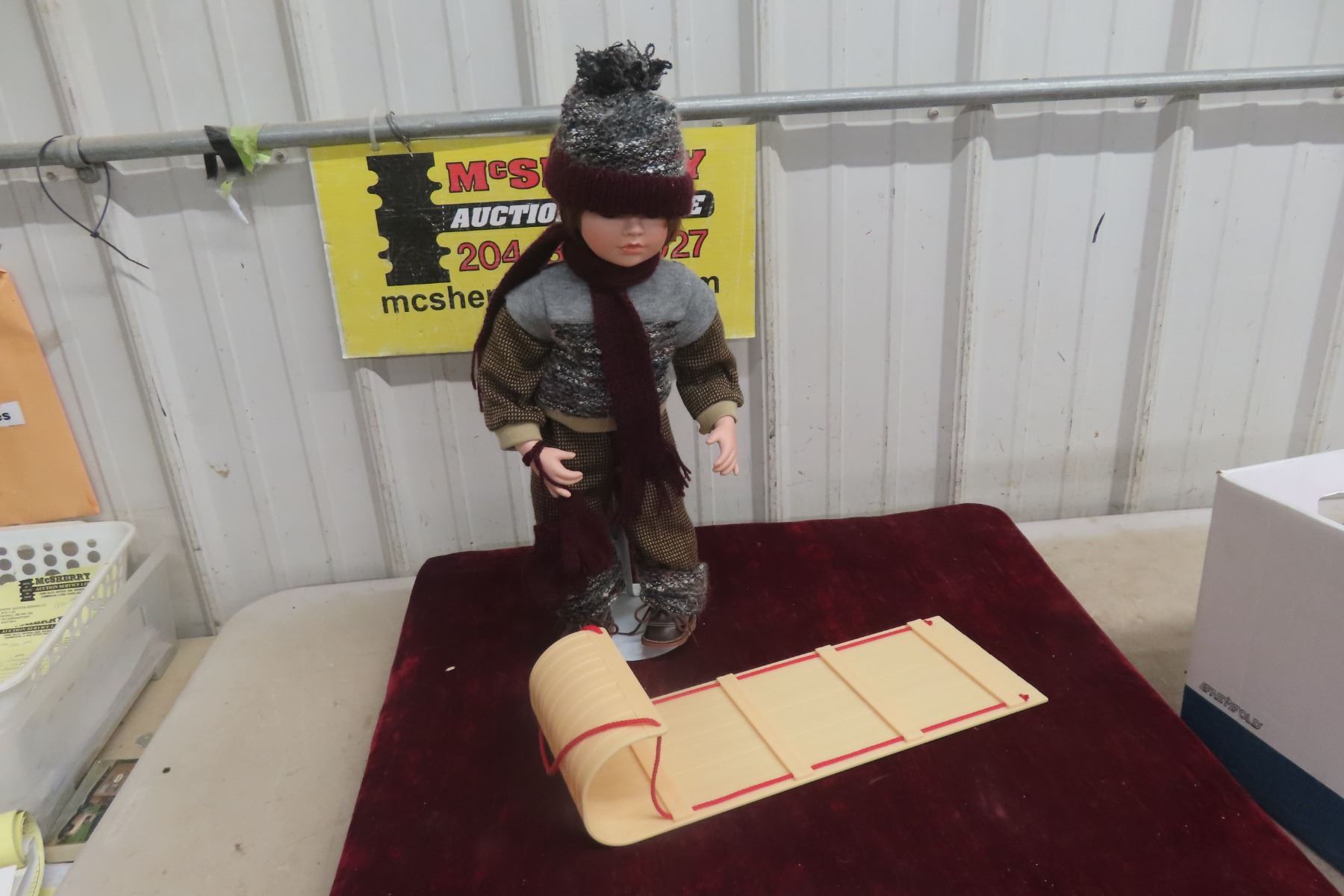 Porcelain Doll With Stand and Plastic Sleigh, Measuring 19 in. Tall.