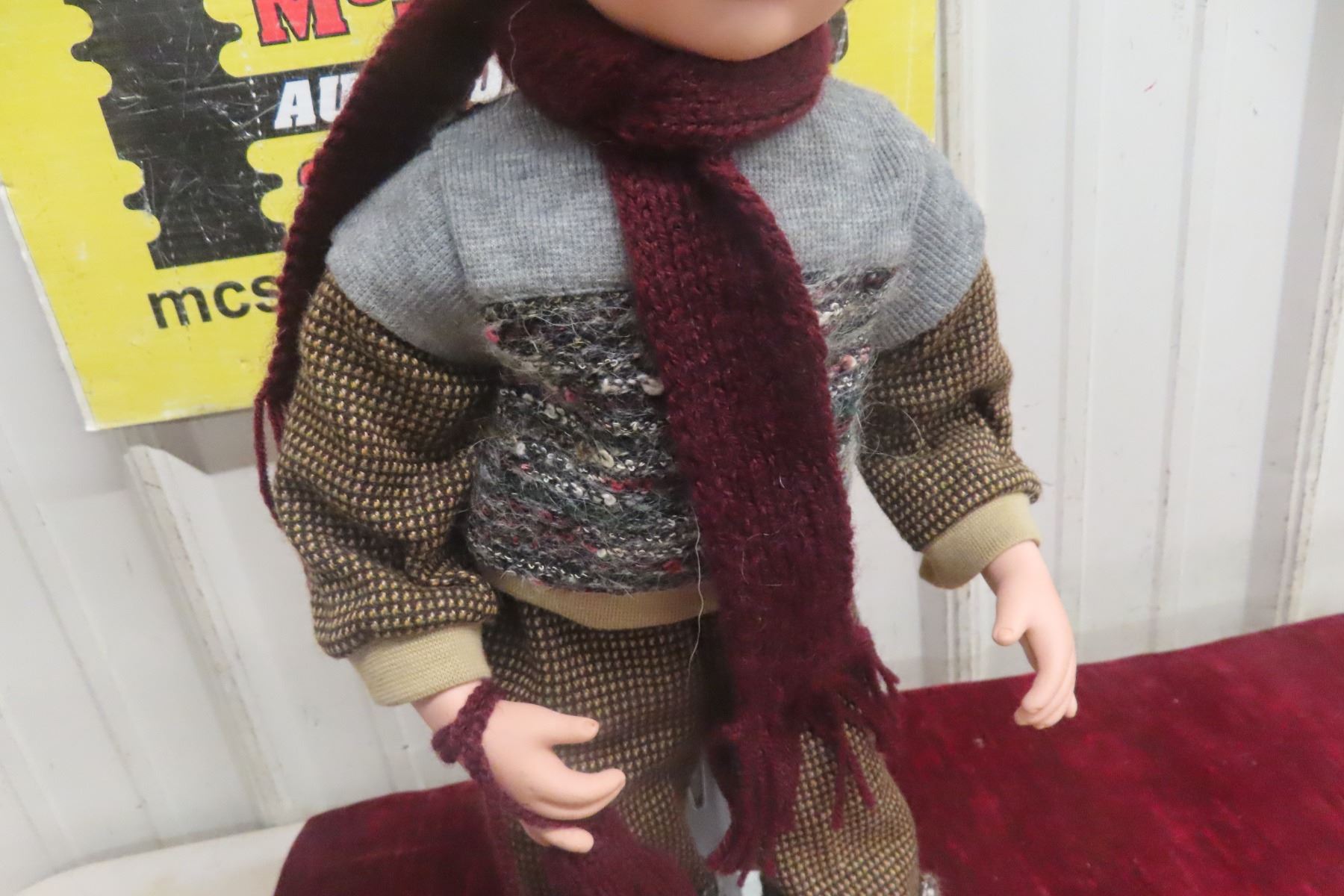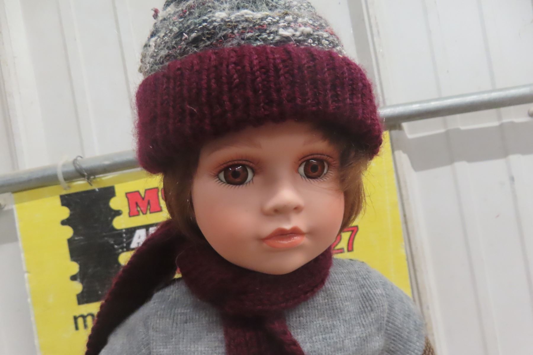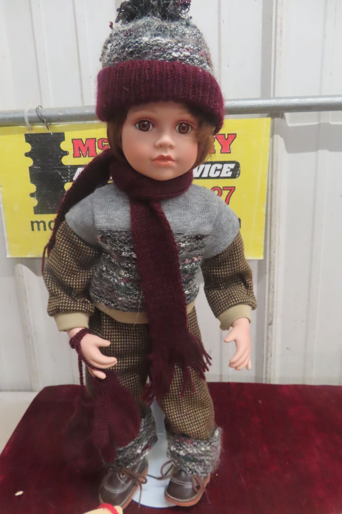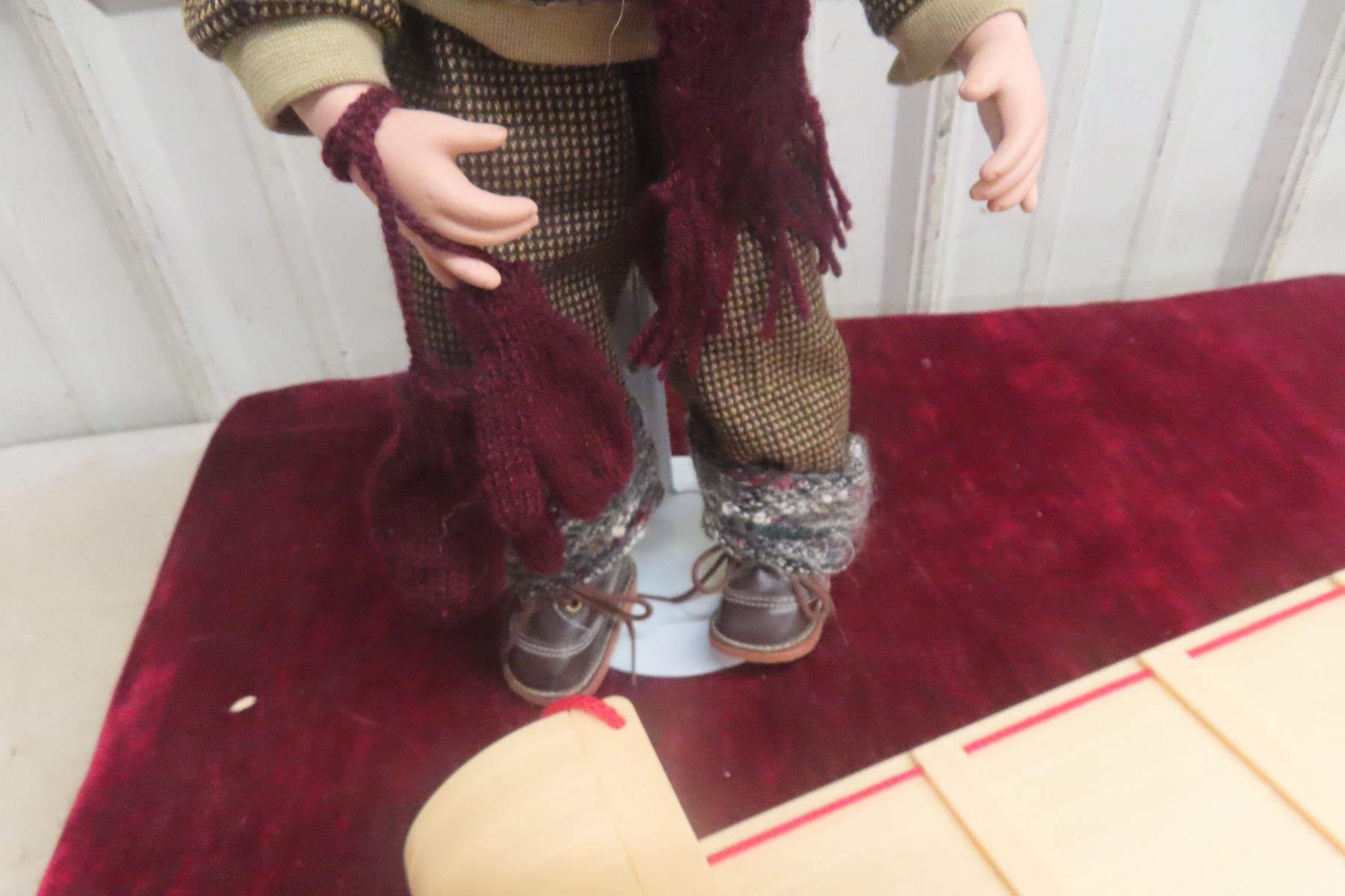 Porcelain Doll With Stand and Plastic Sleigh, Measuring 19 in. Tall.