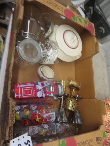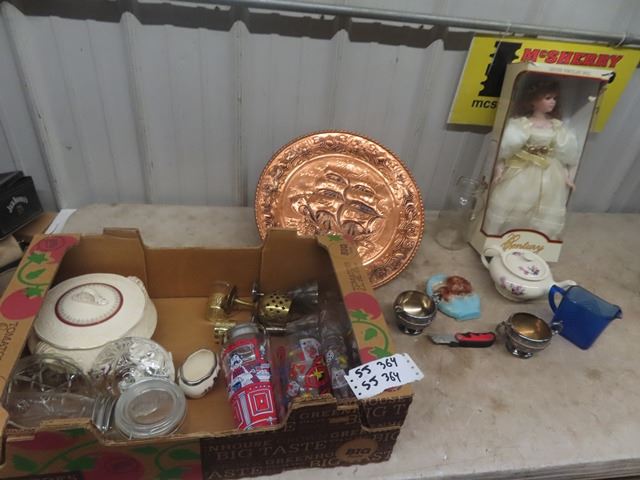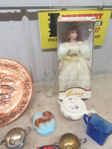 Porcelain Doll in Box, Bar Glassware, Chalkware plus more