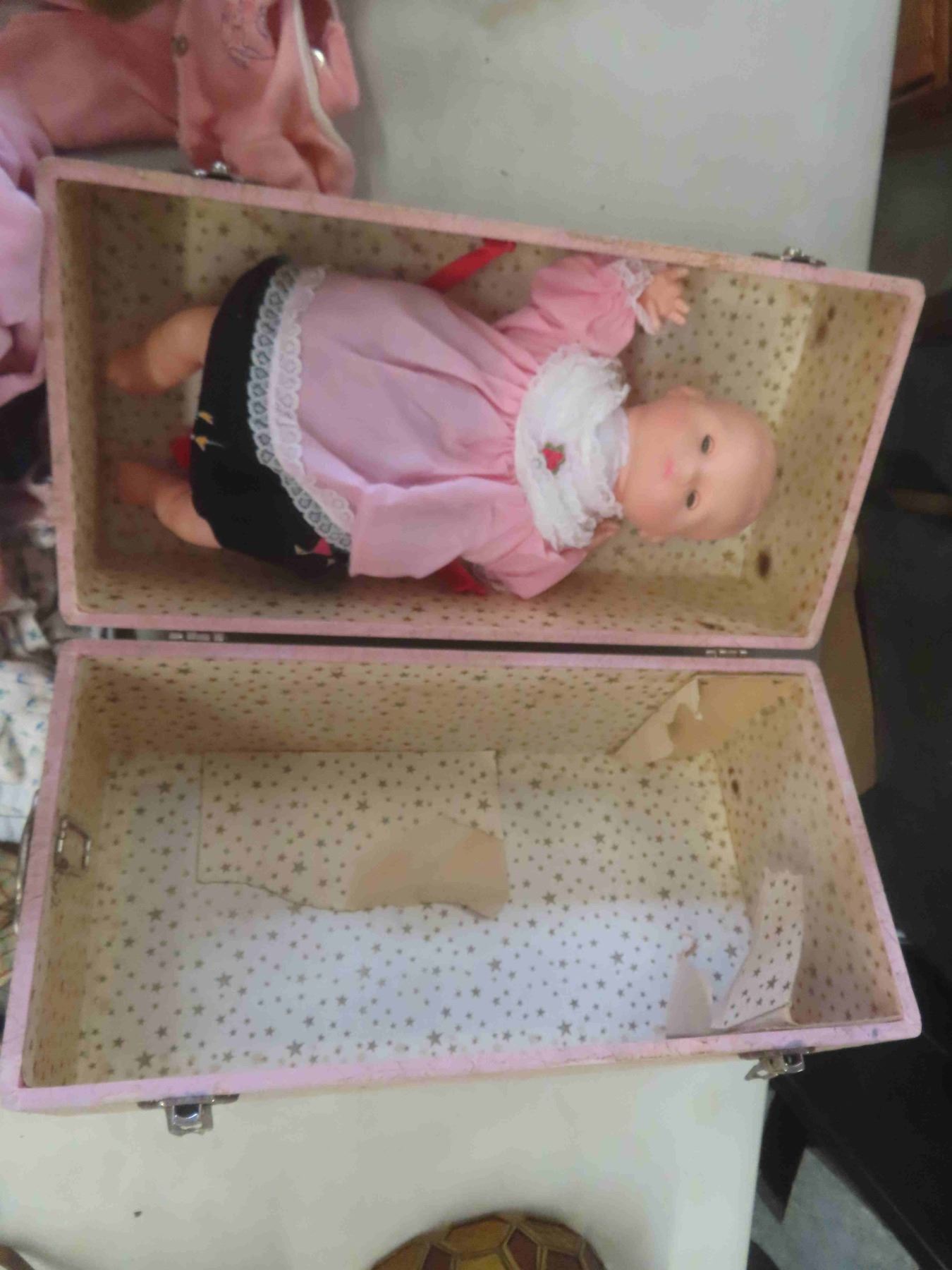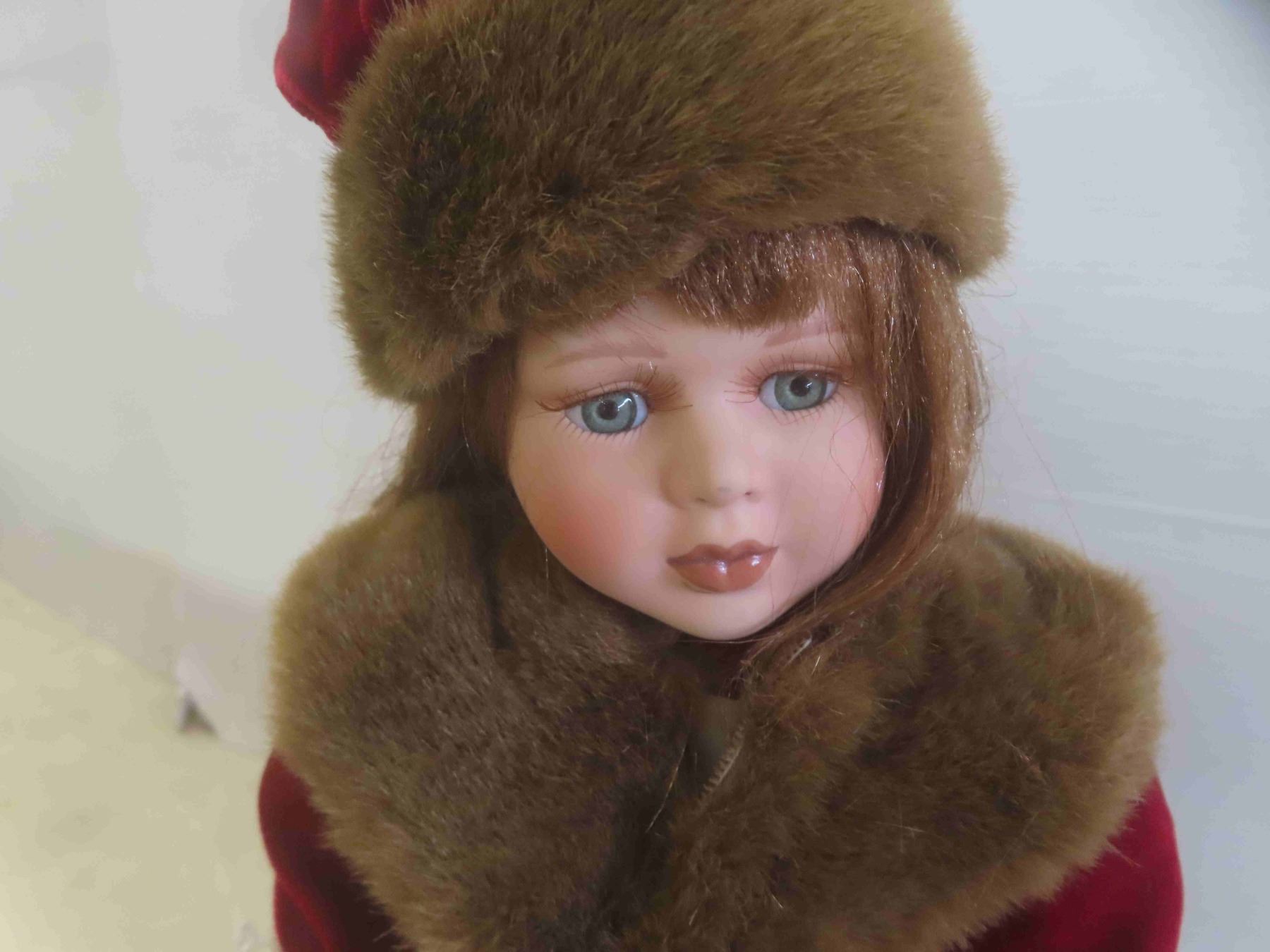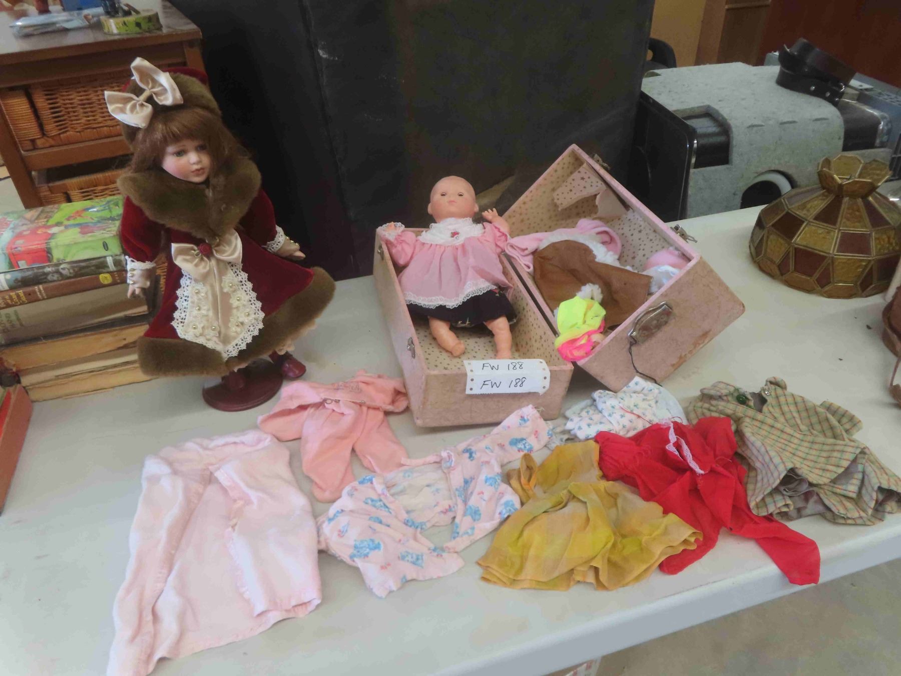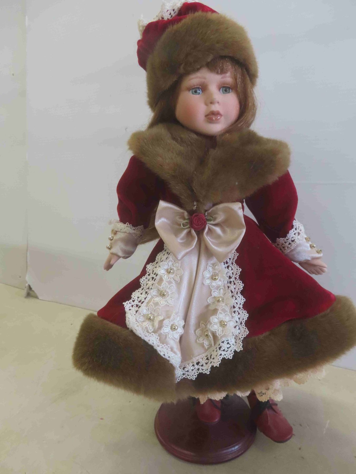 Porcelain Doll on Stand 17'' Tall , Doll Case 8'' x 8 1/2'' x 15 3/4'' , Doll Clothing