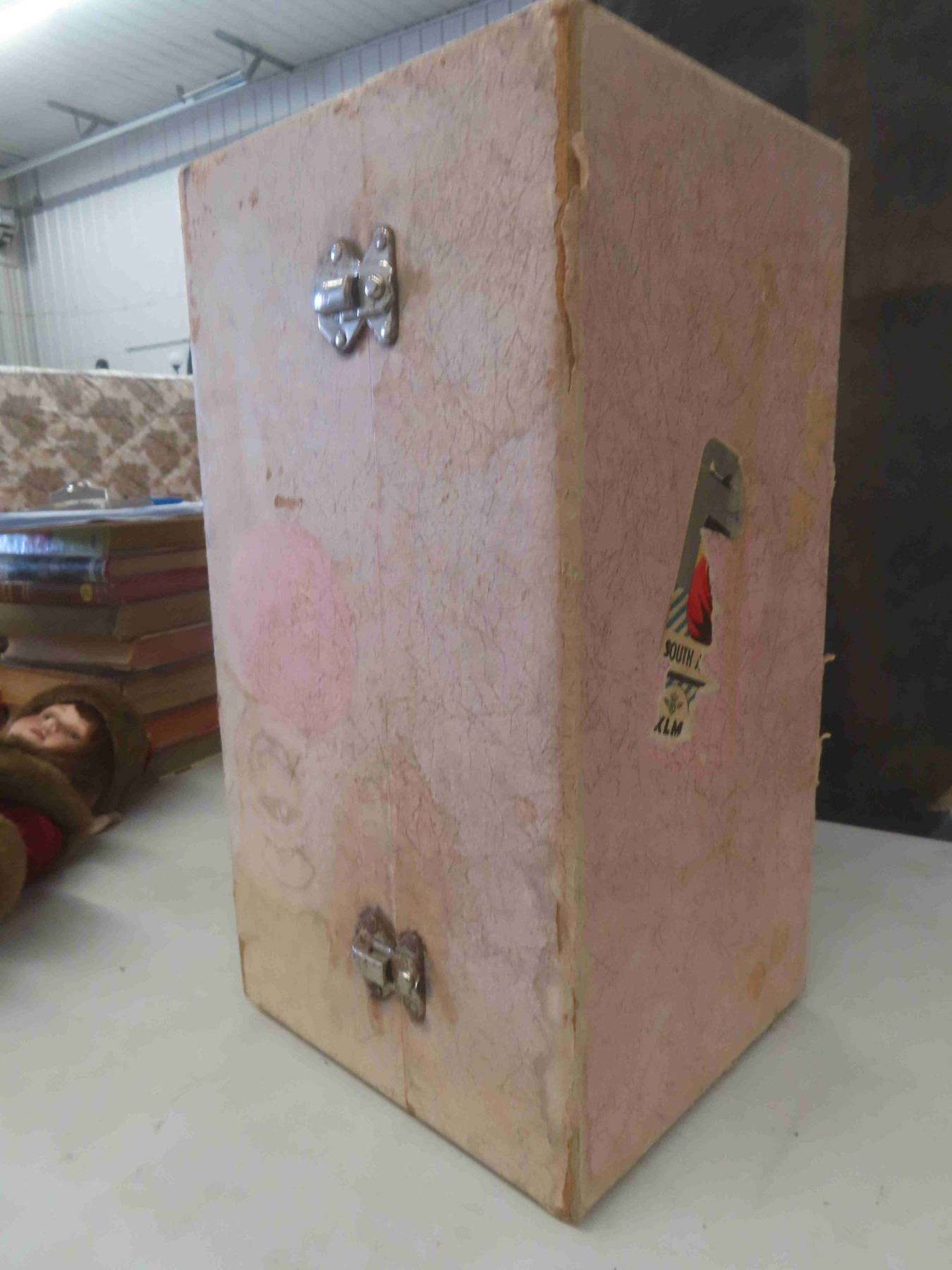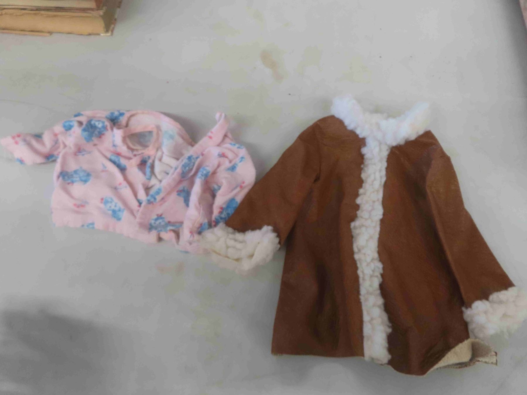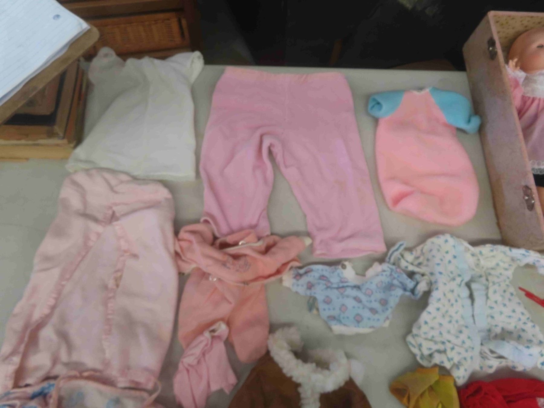 Porcelain Doll on Stand 17'' Tall , Doll Case 8'' x 8 1/2'' x 15 3/4'' , Doll Clothing