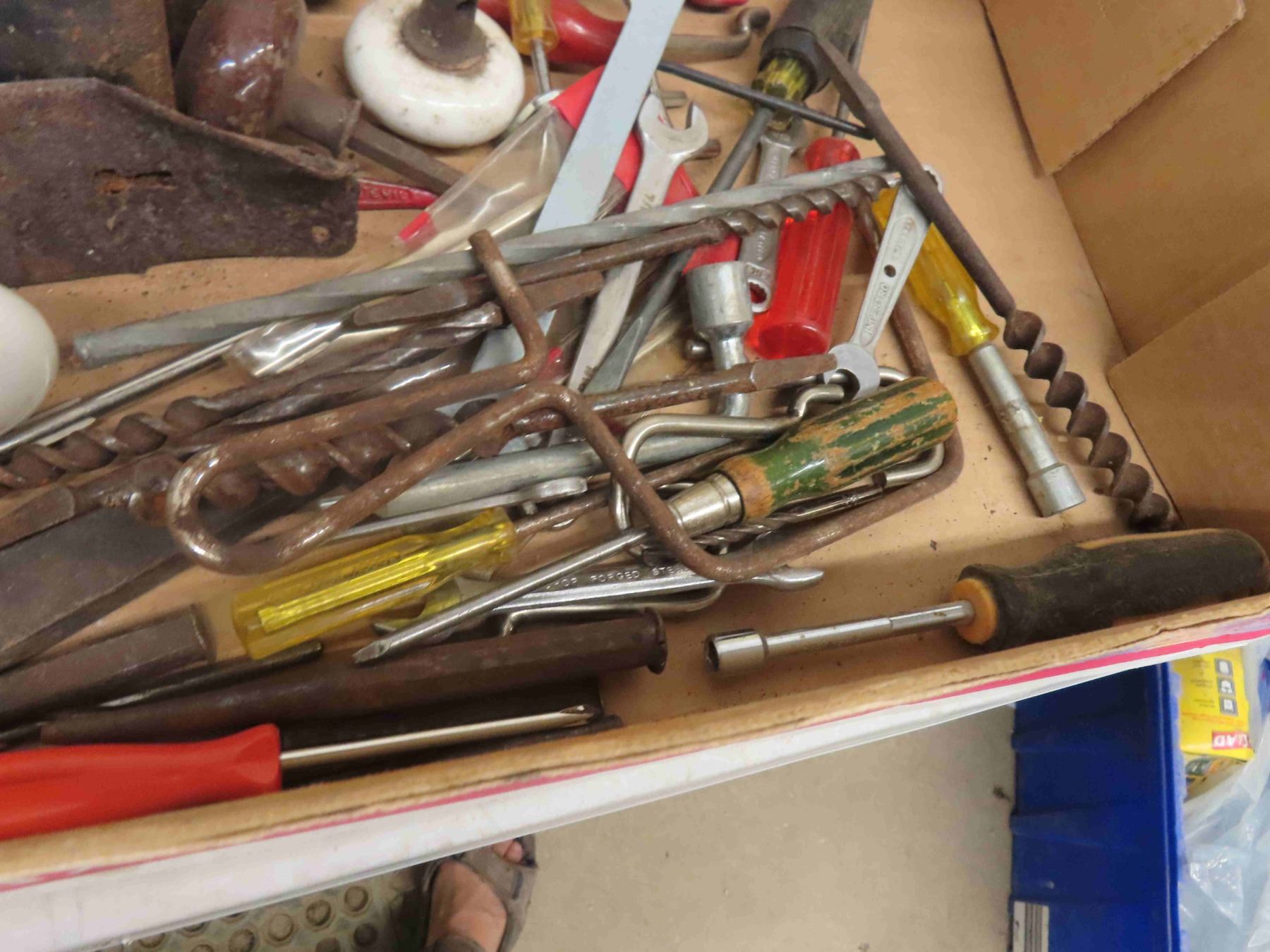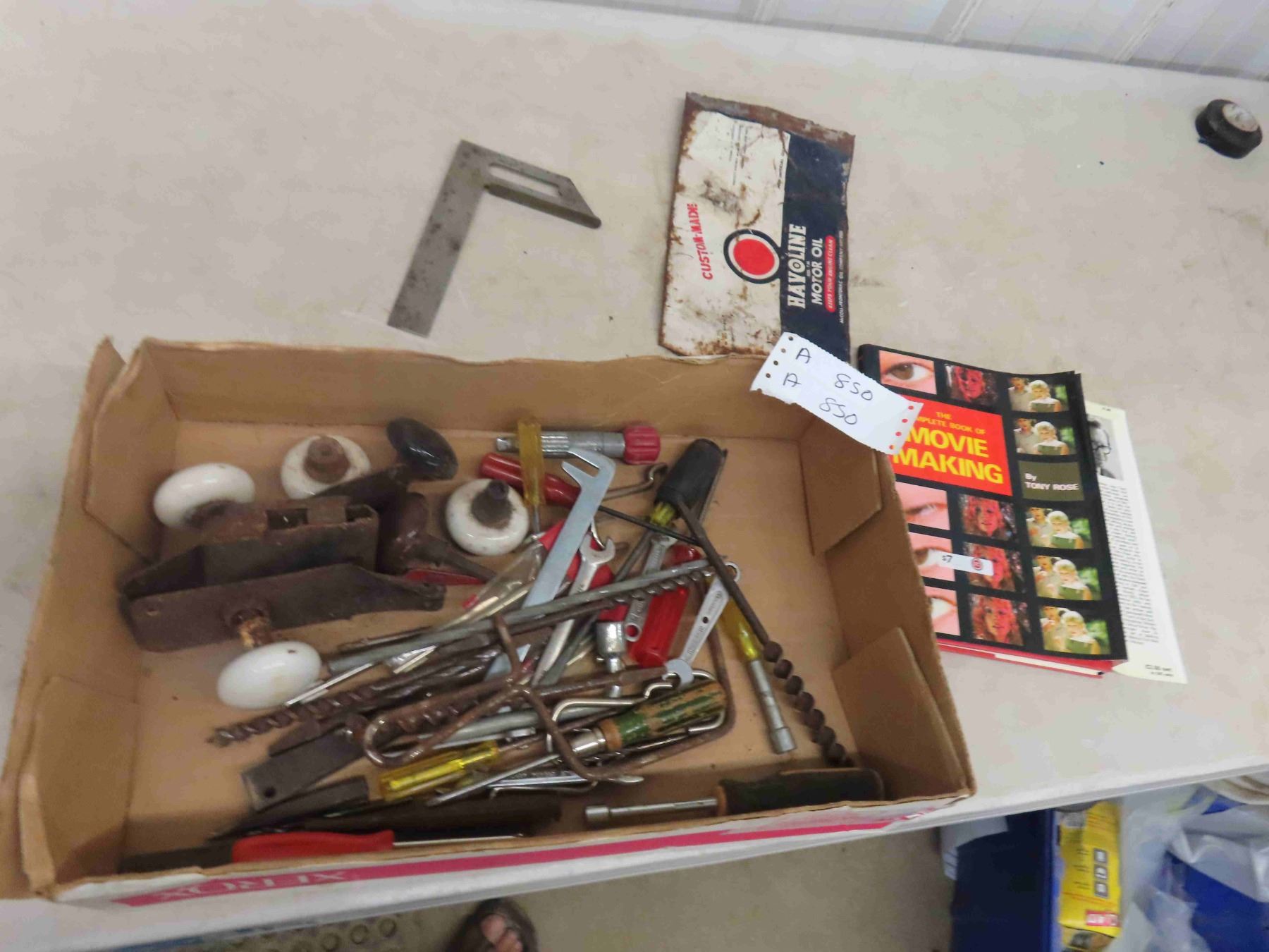 Porcelain Door Knobs, Odds n Ends of Tools, Flattened Oil Can