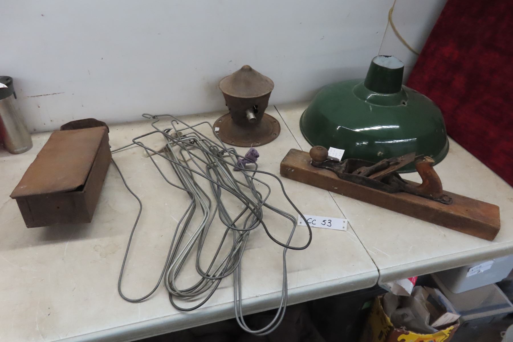 Porcelain Lamp Shade 18'' Diameter, Metal Storage Box, Planer and Sock Stretchers