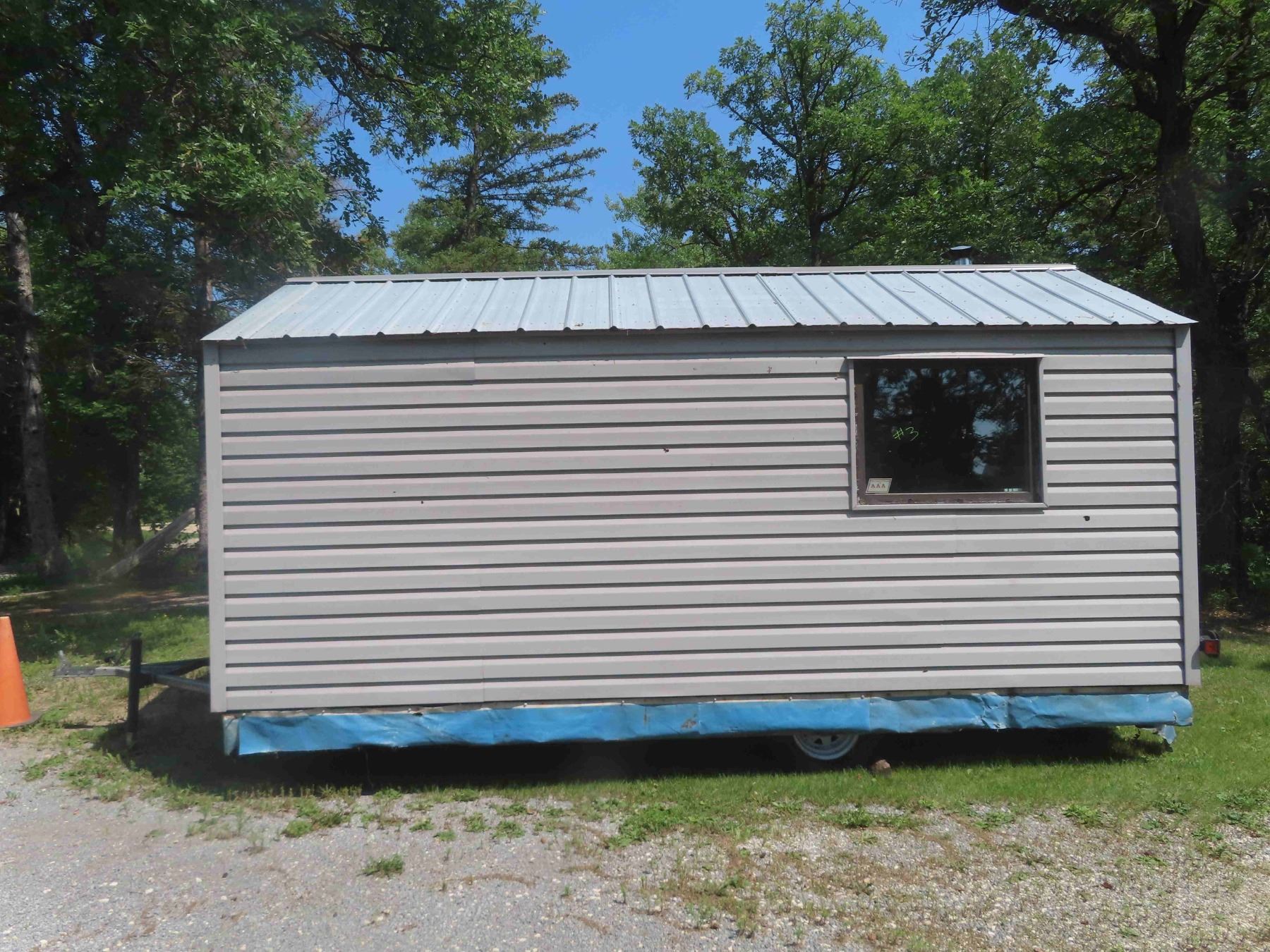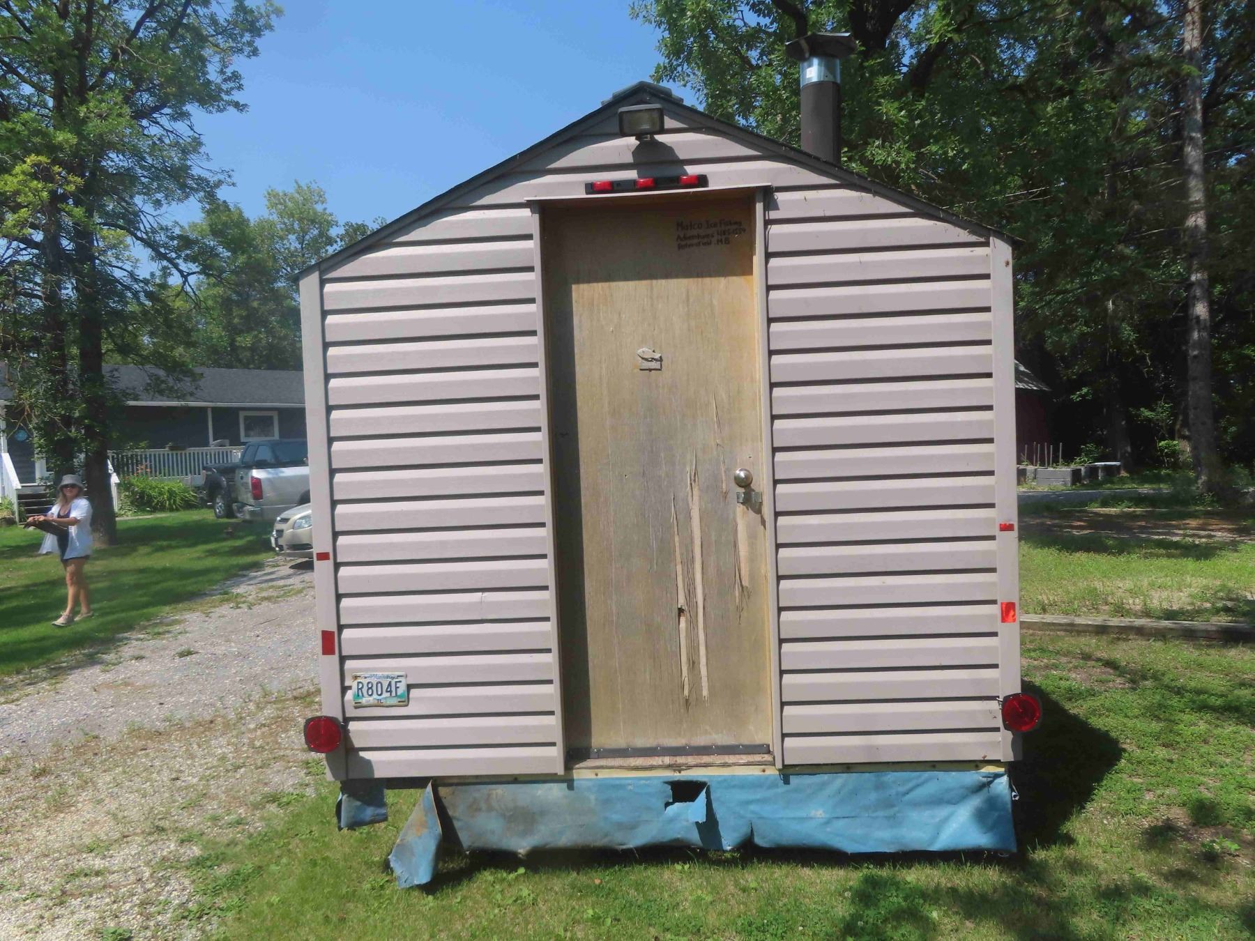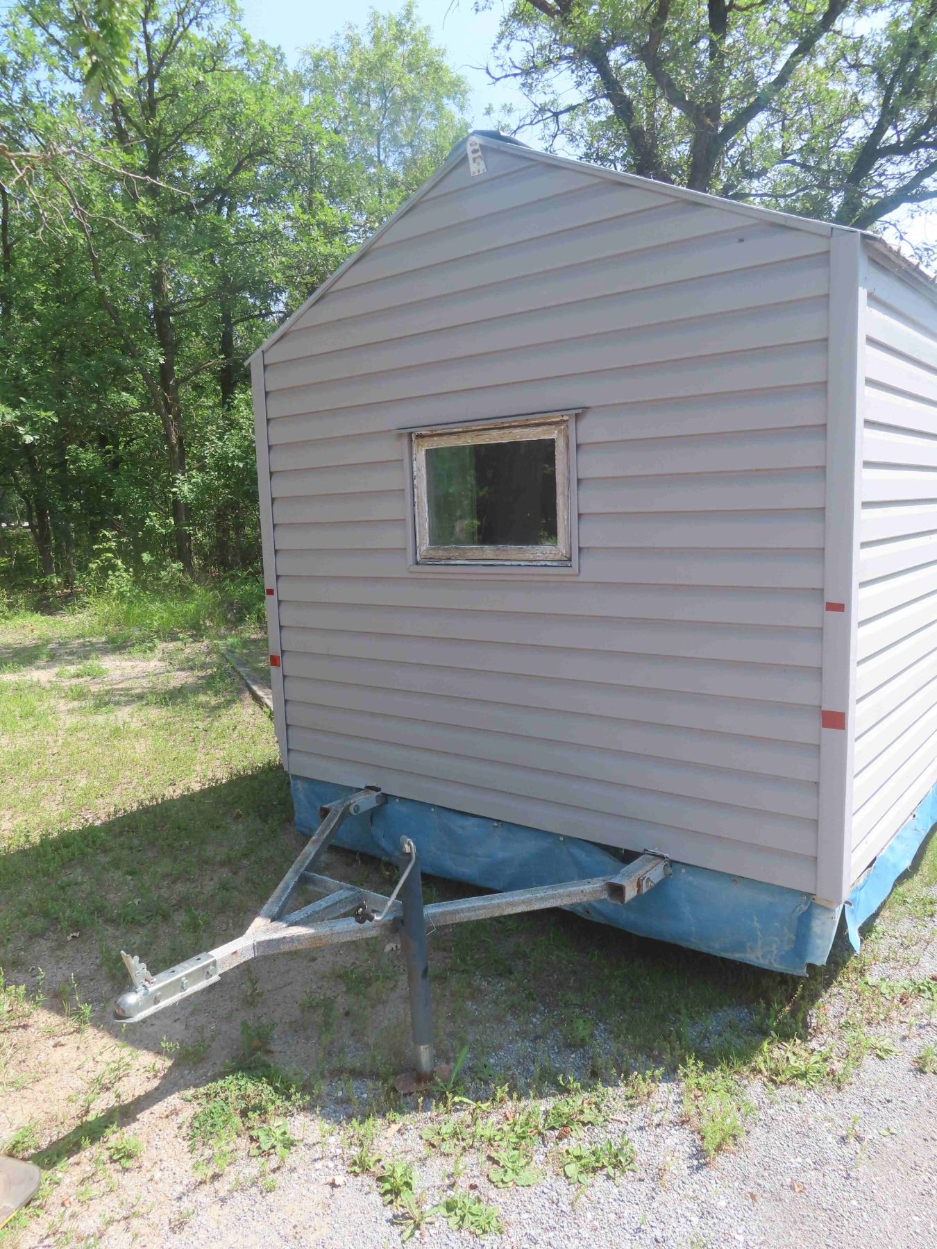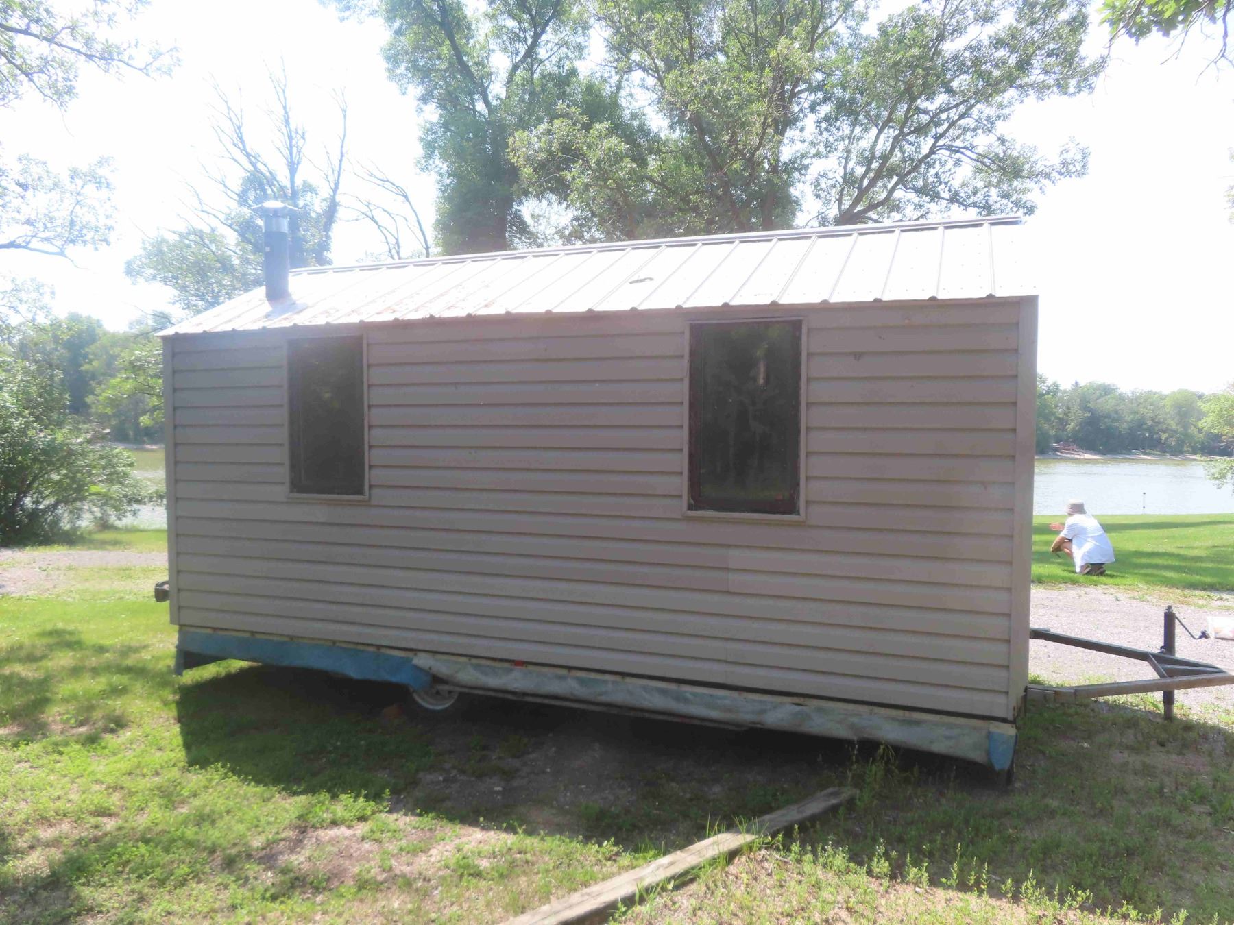 Portable Steel Framed Insulated Ice Fishing / Hunting Shack with Sheet Metal Roof and Wood Heater 8' x 16' - Has Bumper Folding Hitch and Easy Removable Wheels for Placement Into Ice - Has TOD