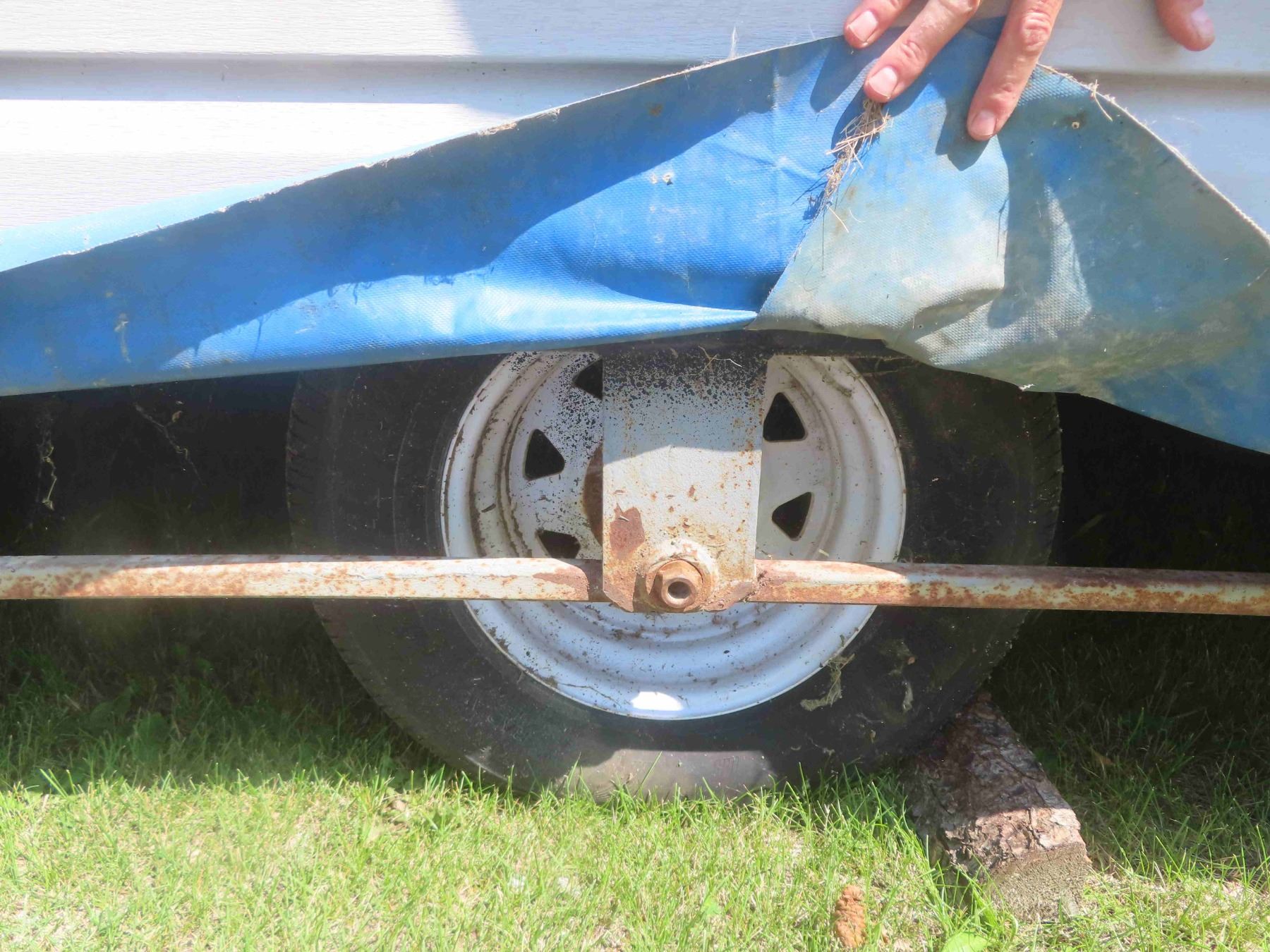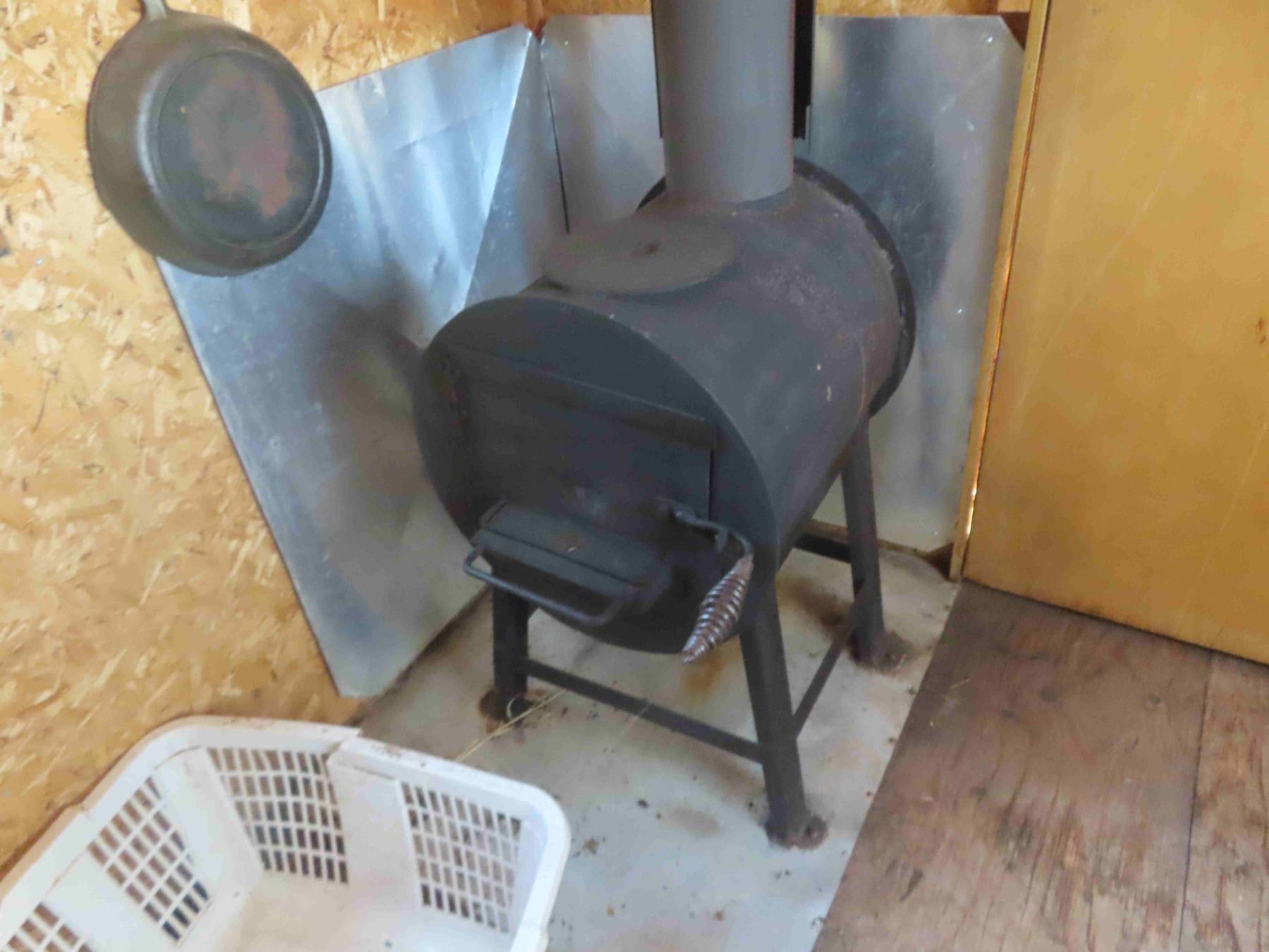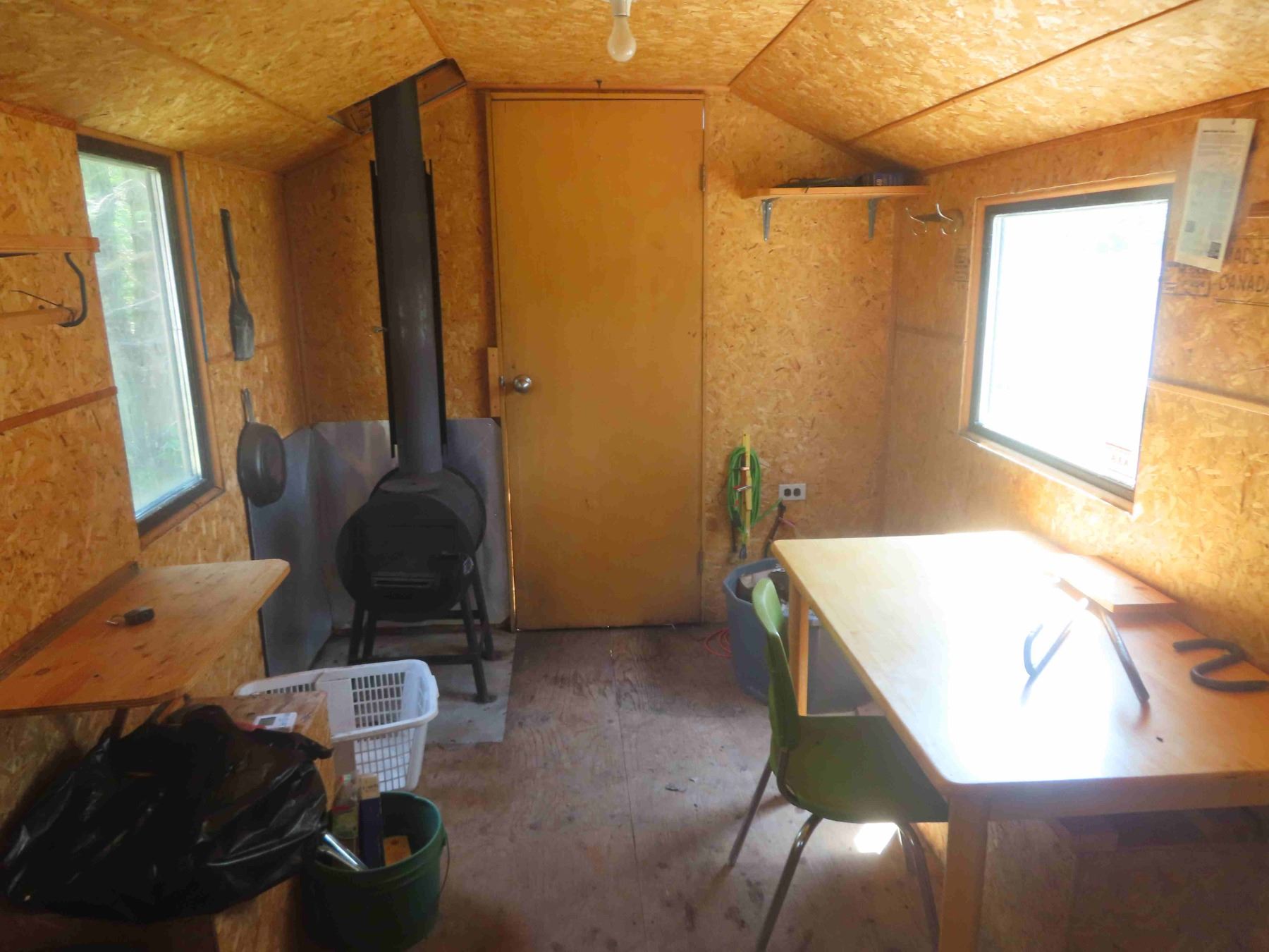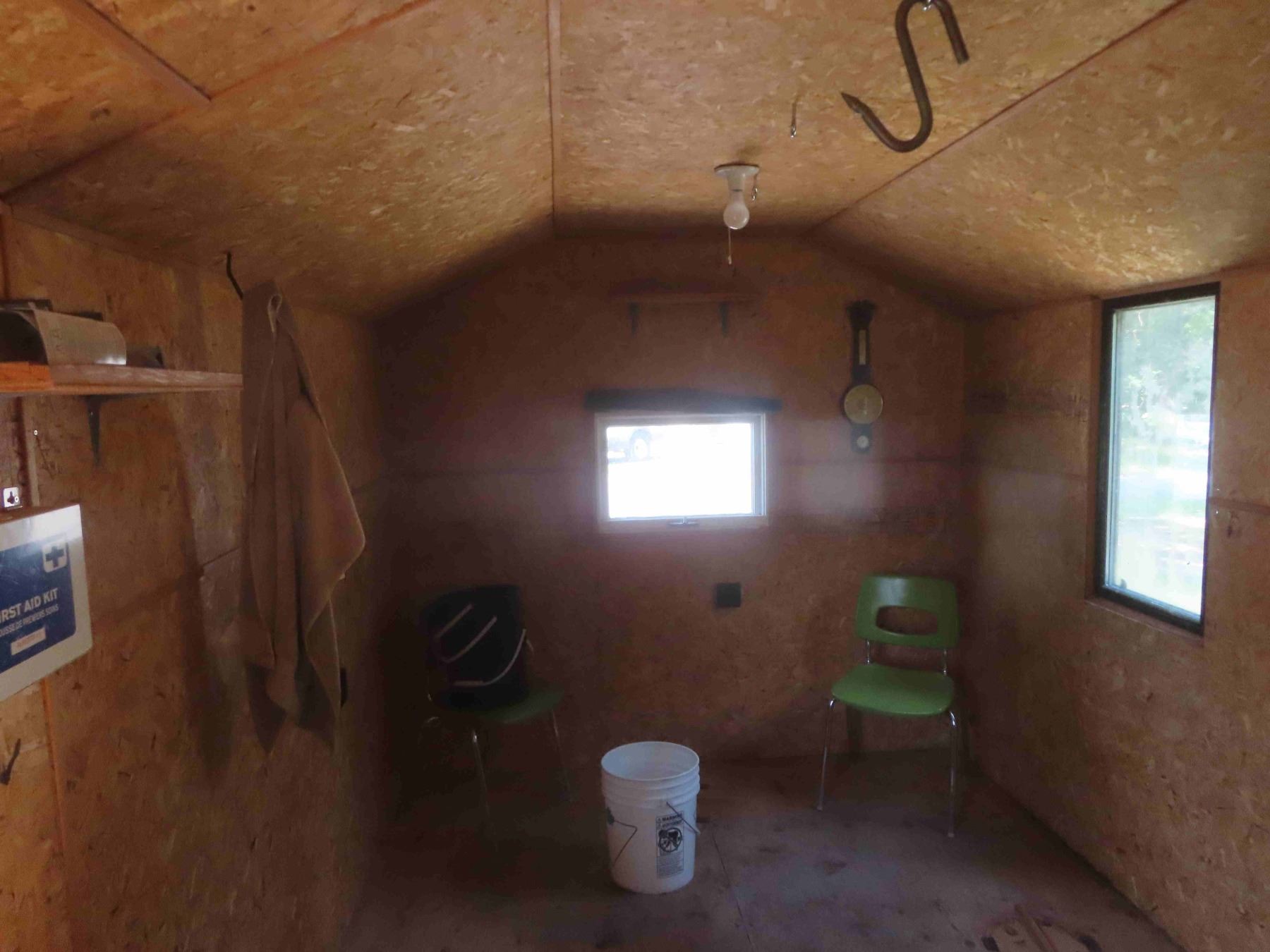 Portable Steel Framed Insulated Ice Fishing / Hunting Shack with Sheet Metal Roof and Wood Heater 8' x 16' - Has Bumper Folding Hitch and Easy Removable Wheels for Placement Into Ice - Has TOD