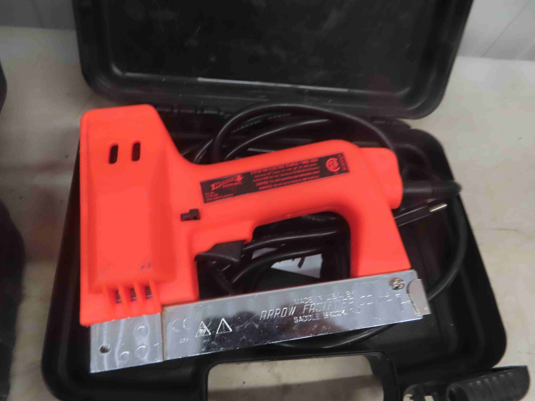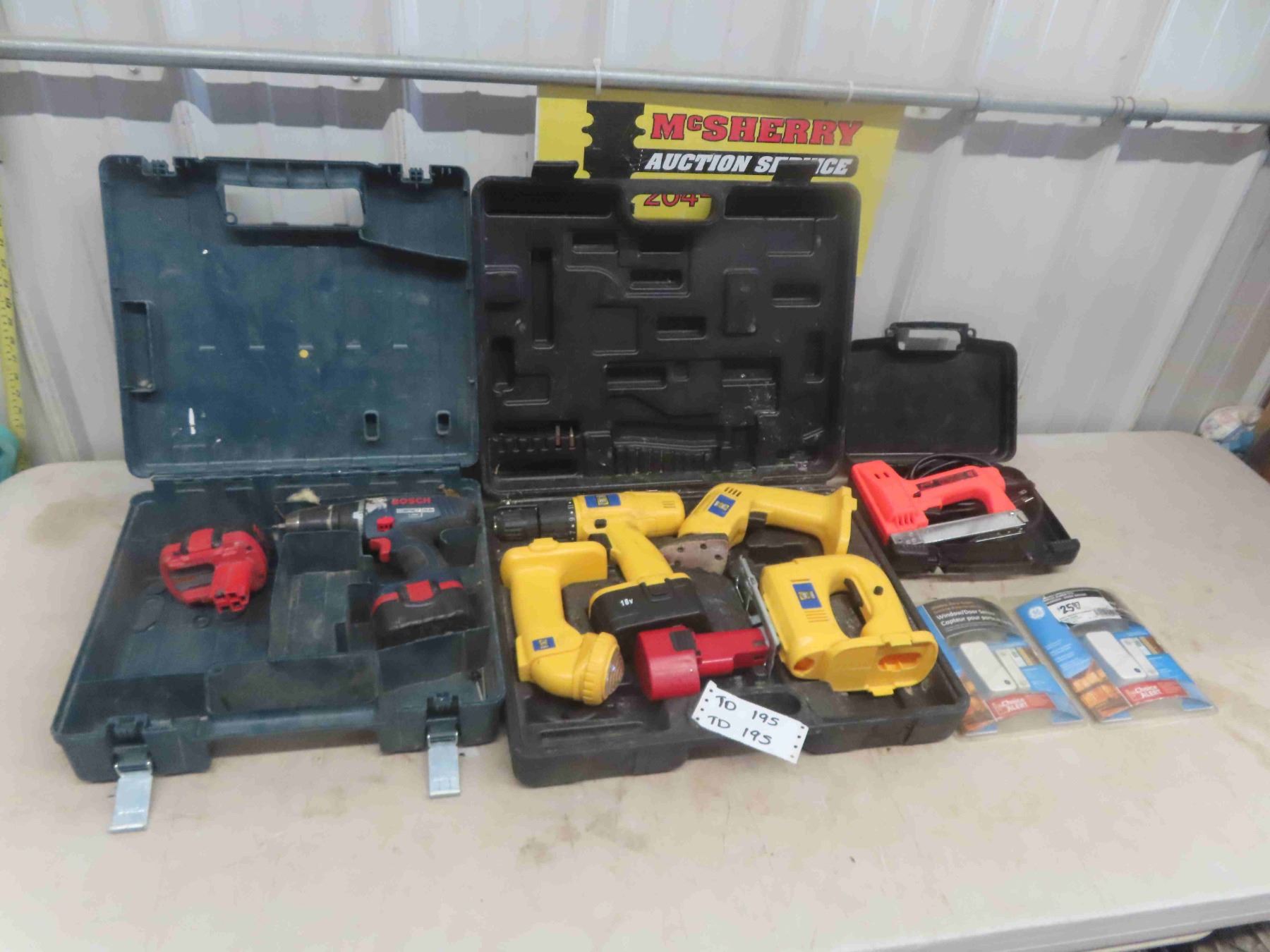 Power Electric Stapler, 2 Wireless Alert Sensors, Power Fist 18V Cordless Tool- No Charger, Bosch 14.4V Drill, 2 Batteries - No Charger, Untested