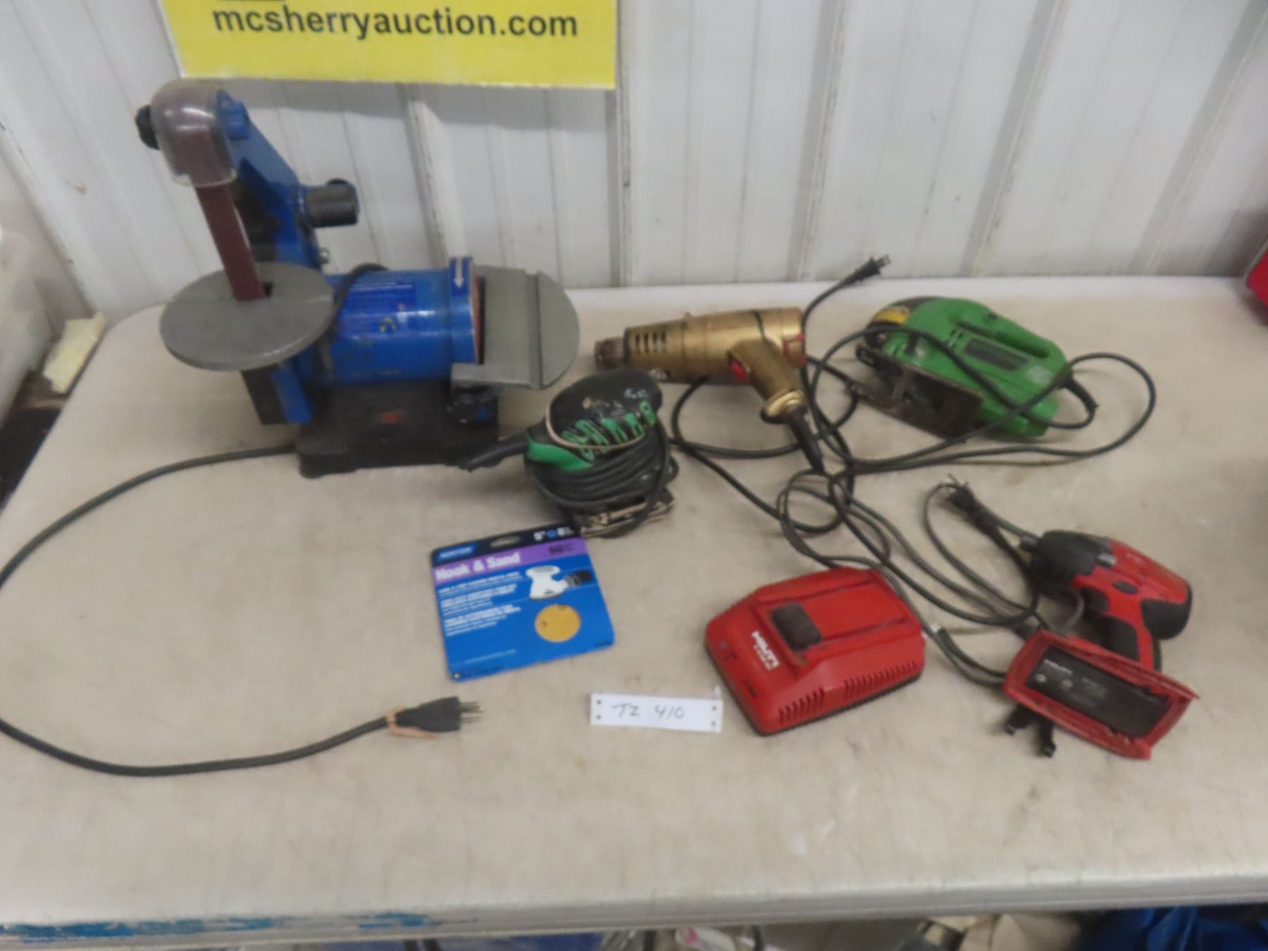 Powerfist Combination Belt & Disc Sander; Hilti Cordless Impact, Charger - No Battery; Power Tools: Skil Jigsaw; Hitachi Sander & Heat Gun