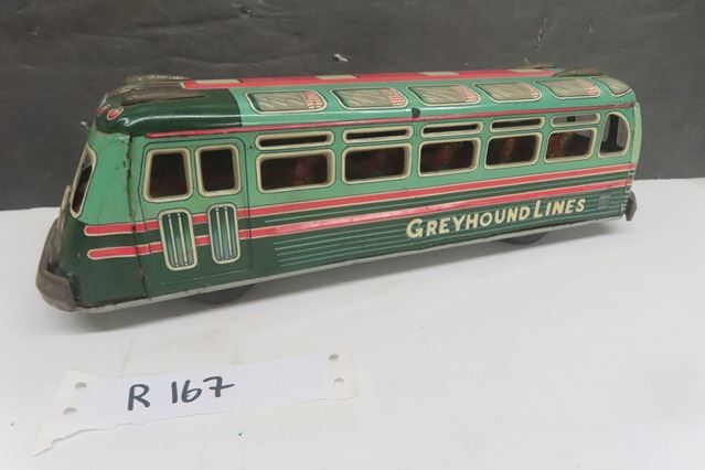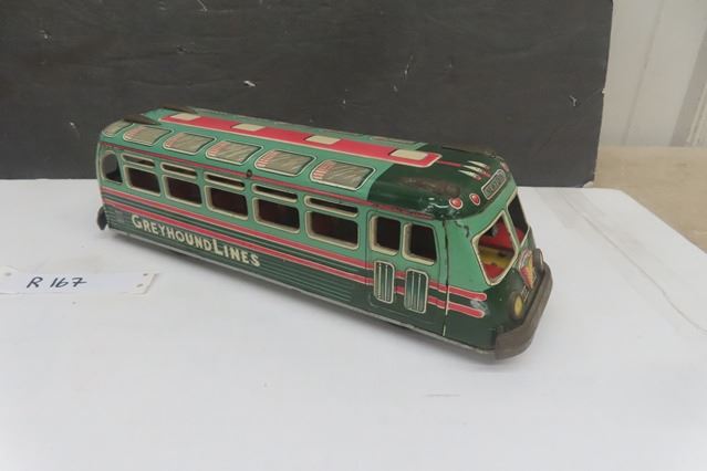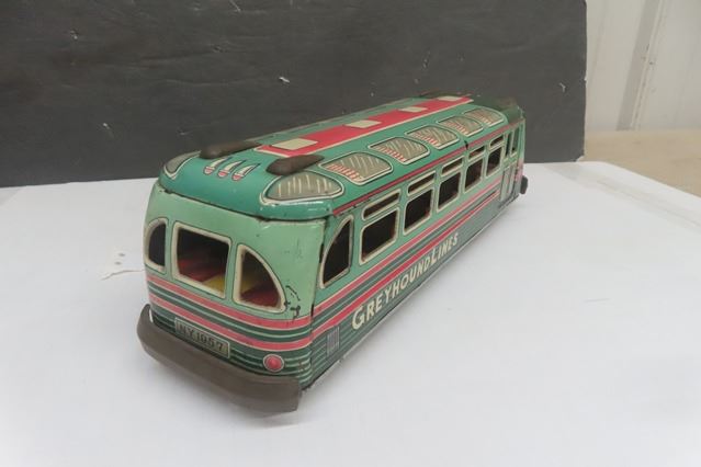 Pressed Tin Greyhound Lines Friction Toy Bus - Japan, Hodson 13'' Long
