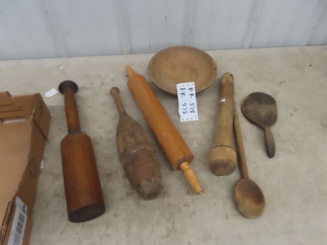 Primitive Wooden Bowls, Butter Paddle, Rolling Pin, Juggling Pin