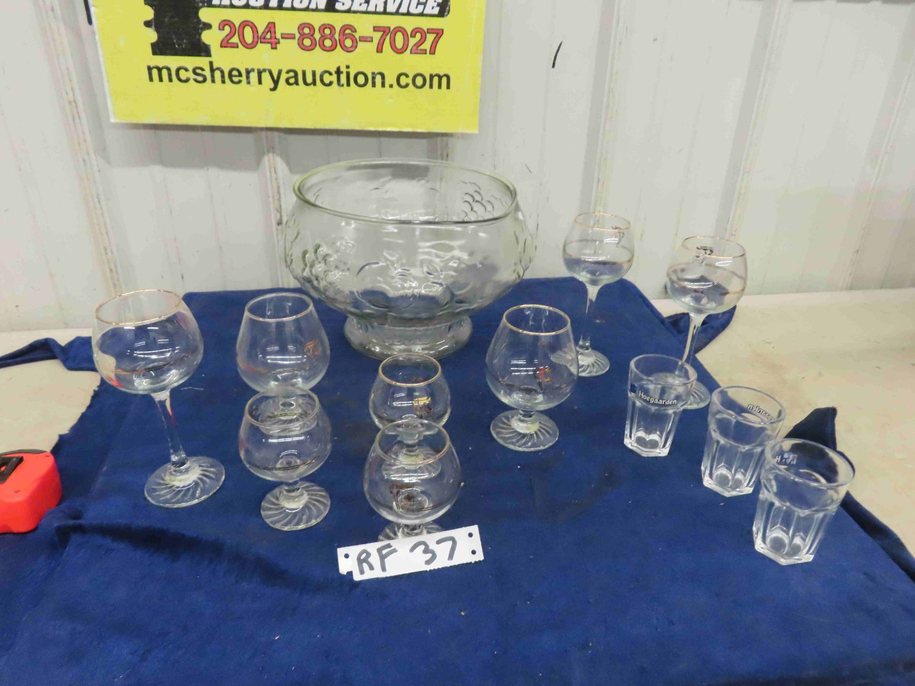 Punch bowl, 8 Wine Glasses, 4 Large Shooter Glasses