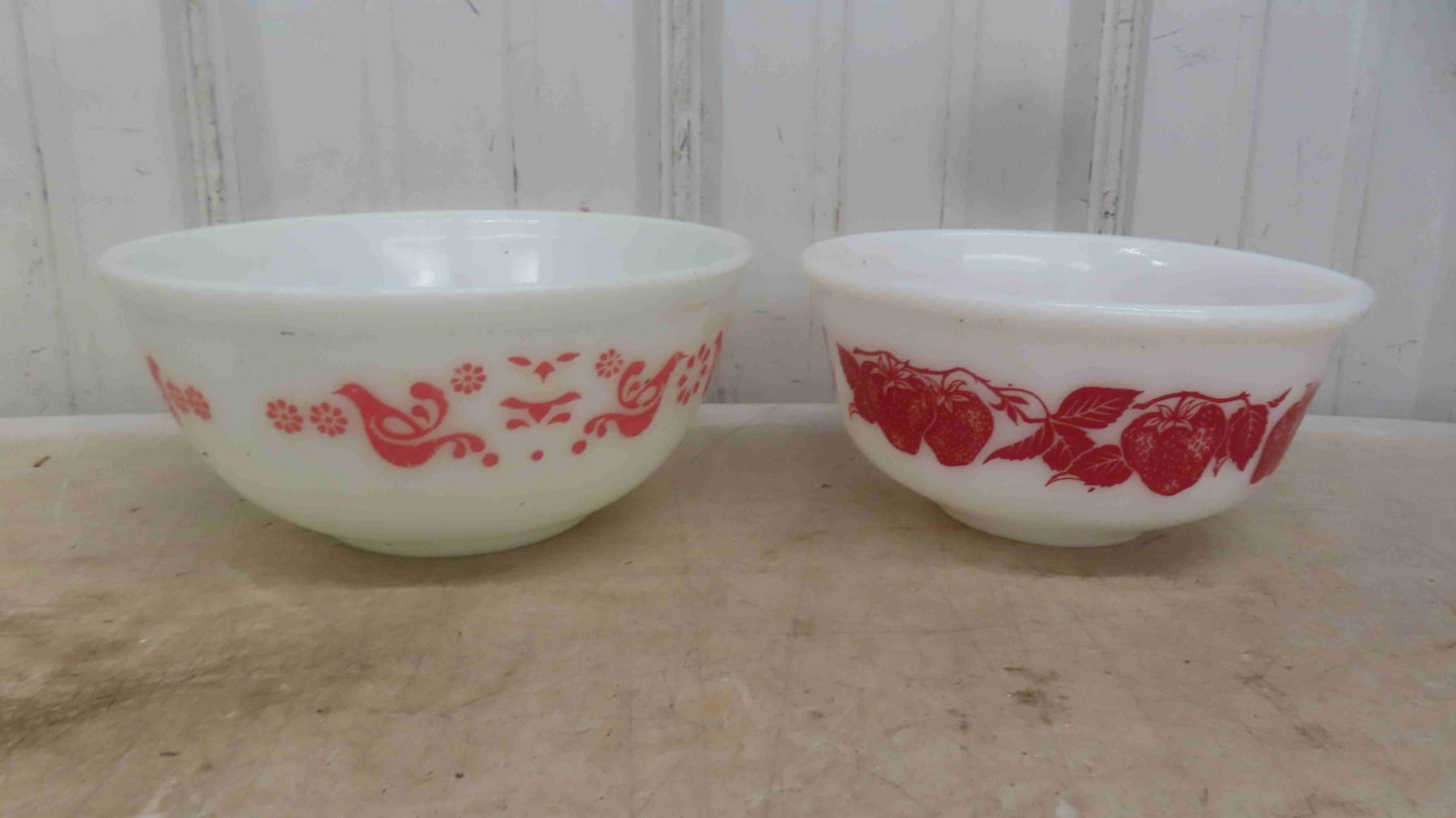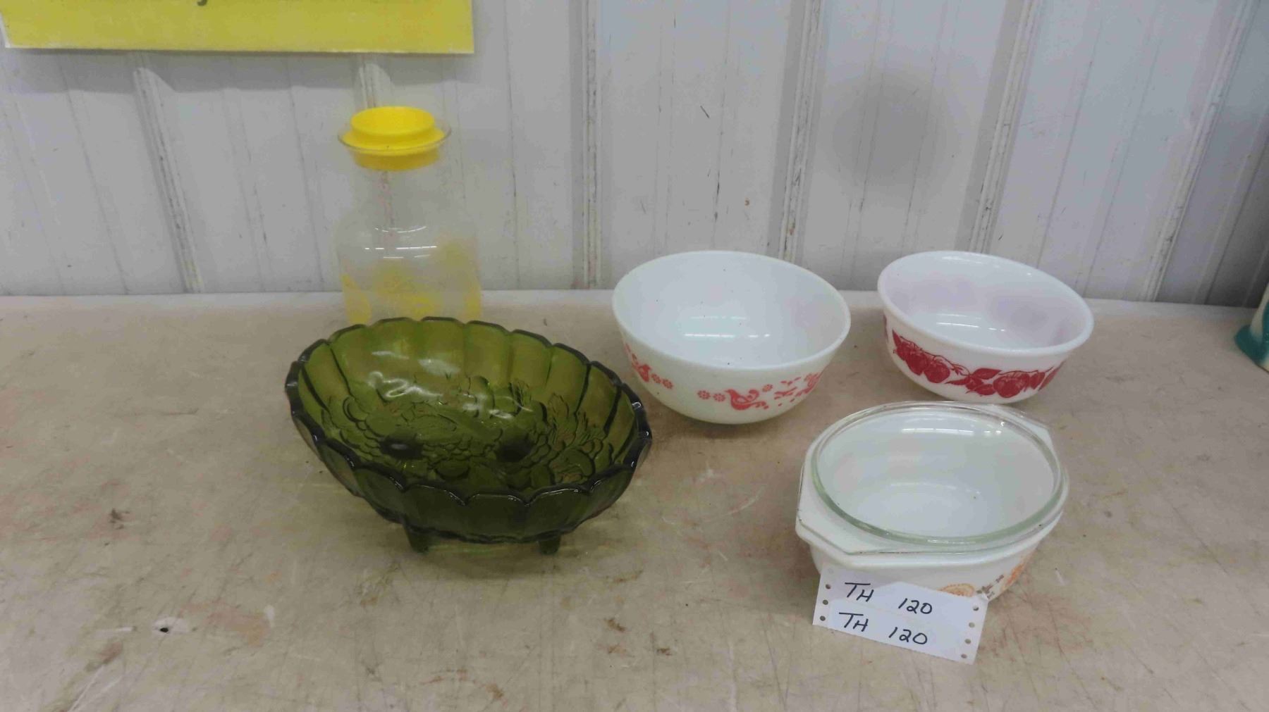 Pyrex: 2 Mixing Bowls, Casserole Dish with Lid , Juice Container, Green Glass Serving Bowl (Some Damage on Casserole Lid, See Photos)