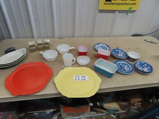 Pyrex Refridgerator Dish, Blue Willow, Spice Containers, 2 Medicine Hat Pottery Plates