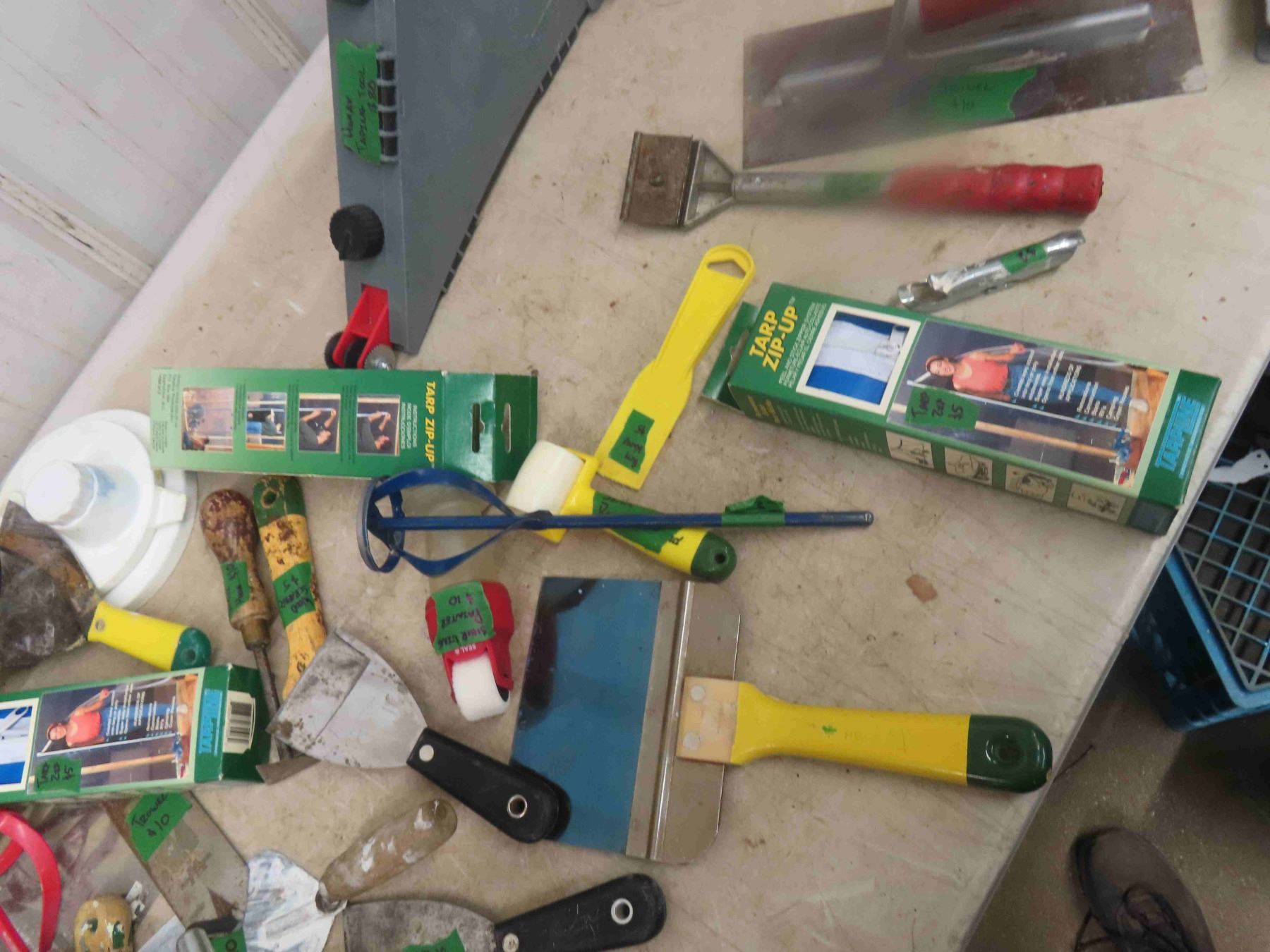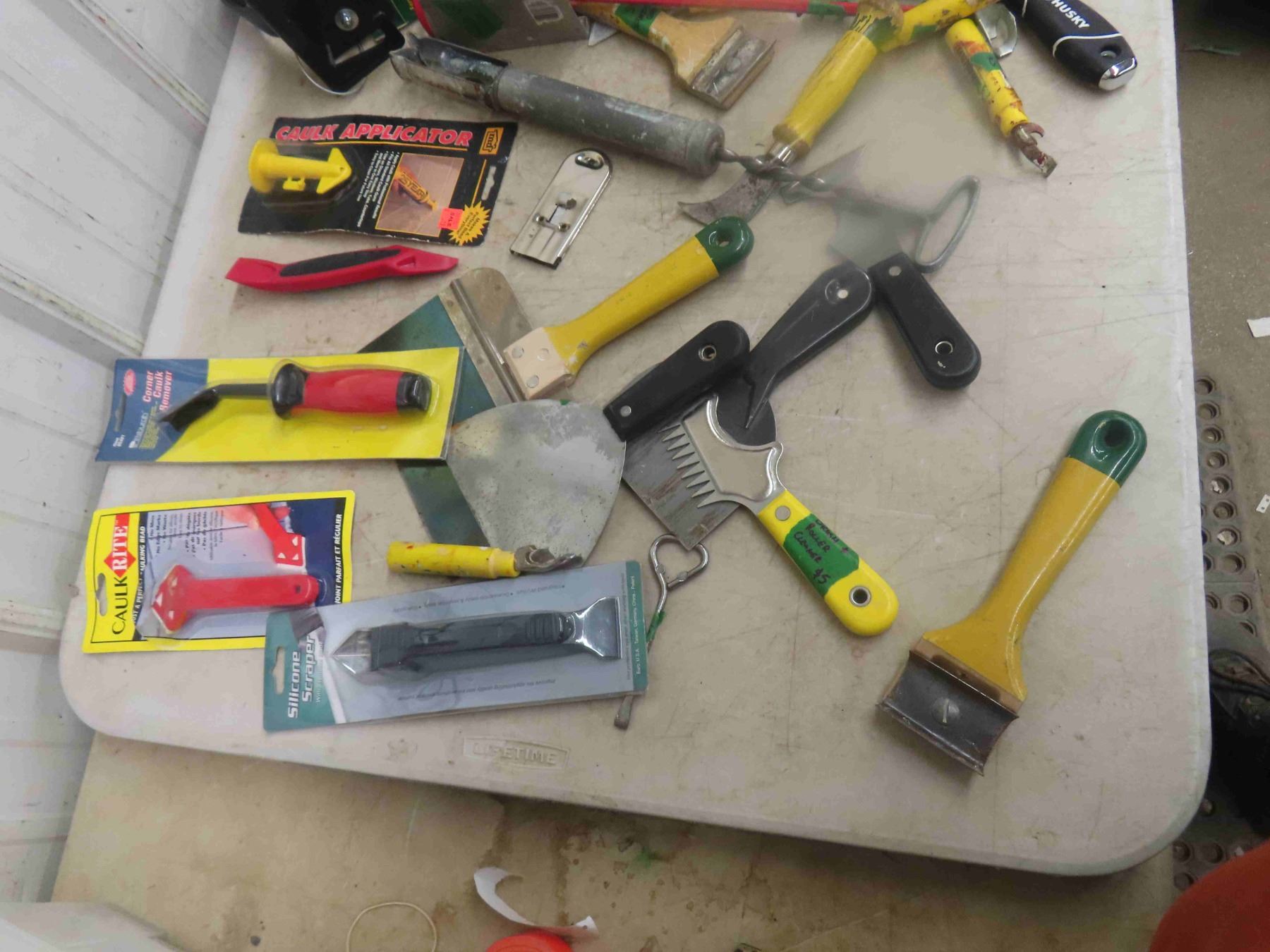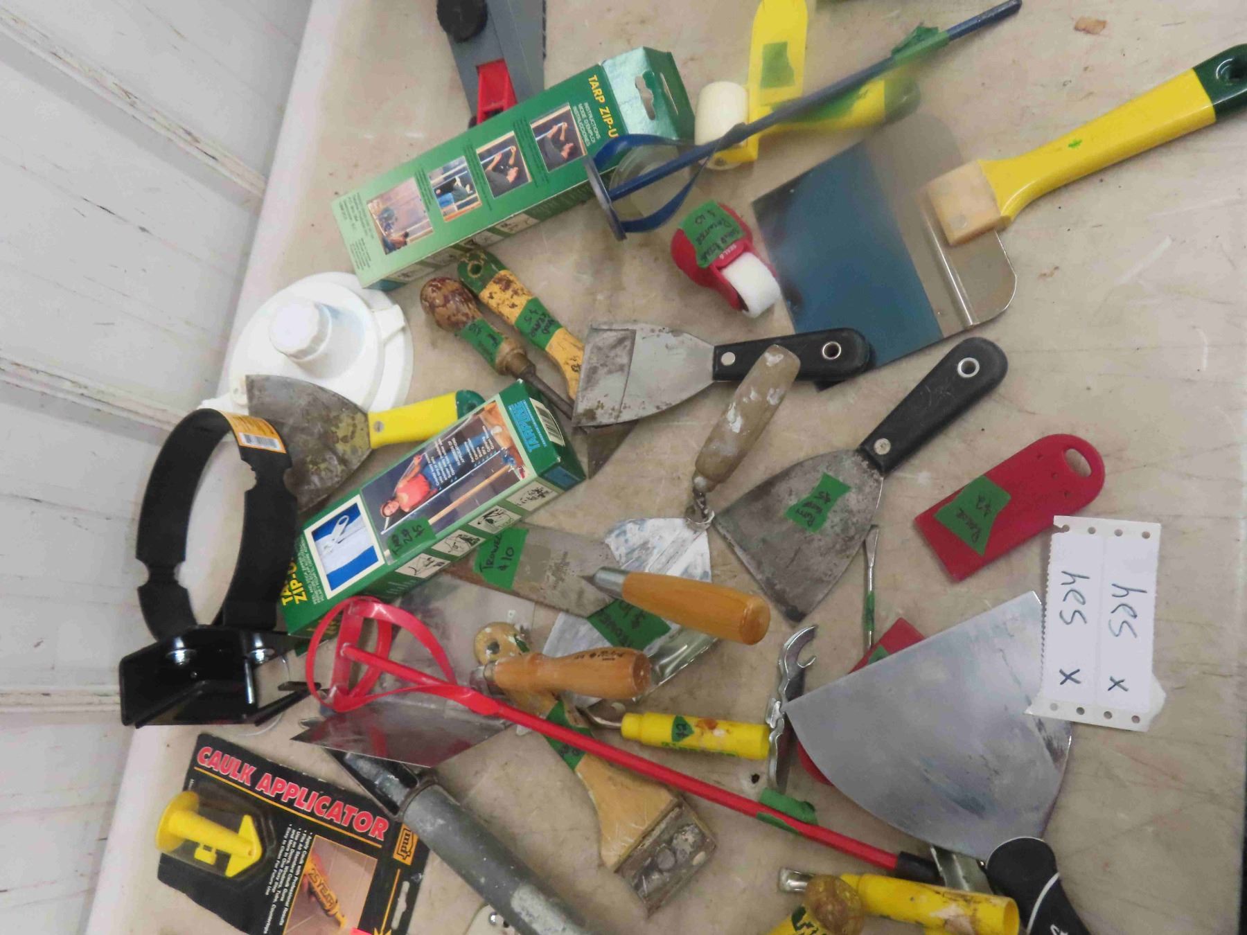 Quantity of Trowels + Scrapers, Paint Mixer, Brush Cleaner, Homax Taping Tool, Caulking Removers, plus more