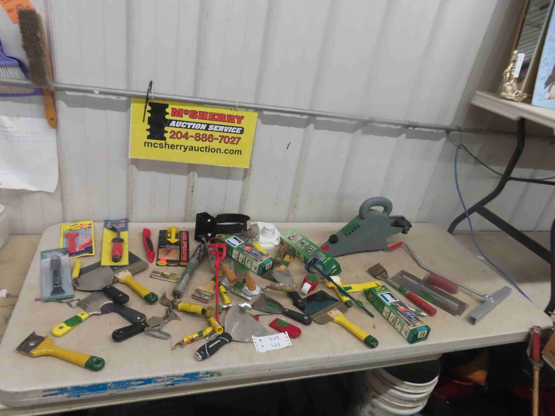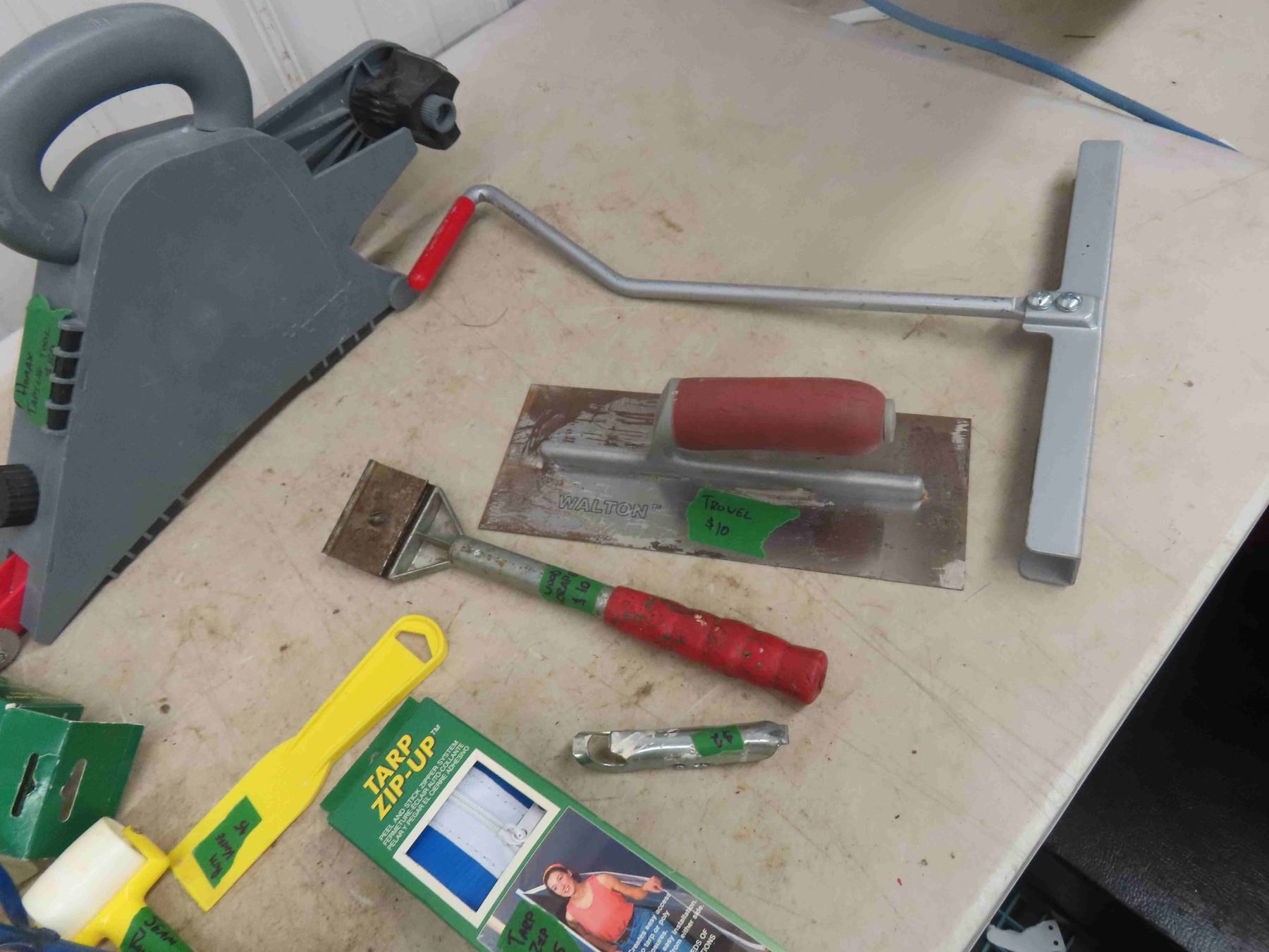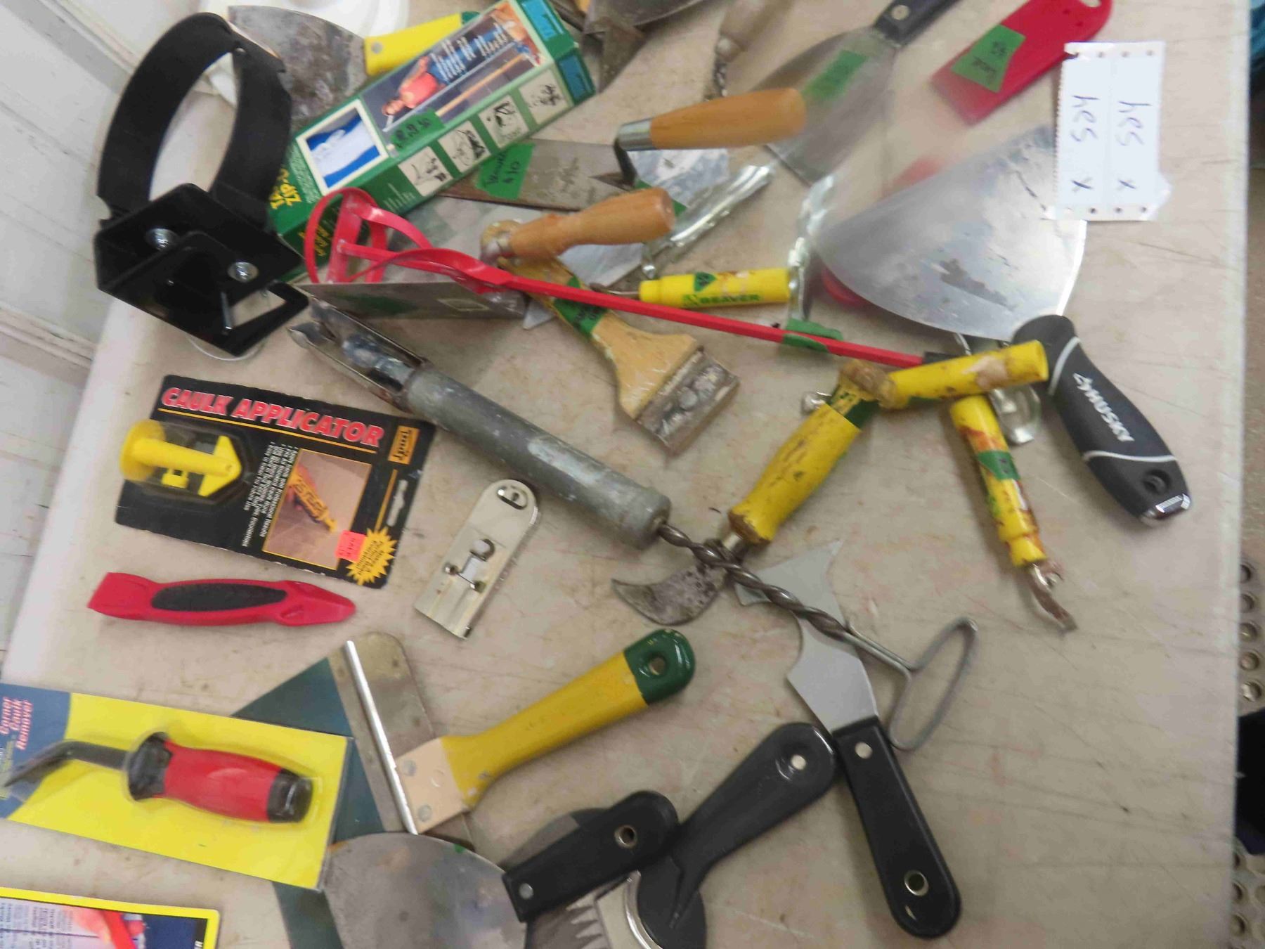 Quantity of Trowels + Scrapers, Paint Mixer, Brush Cleaner, Homax Taping Tool, Caulking Removers, plus more