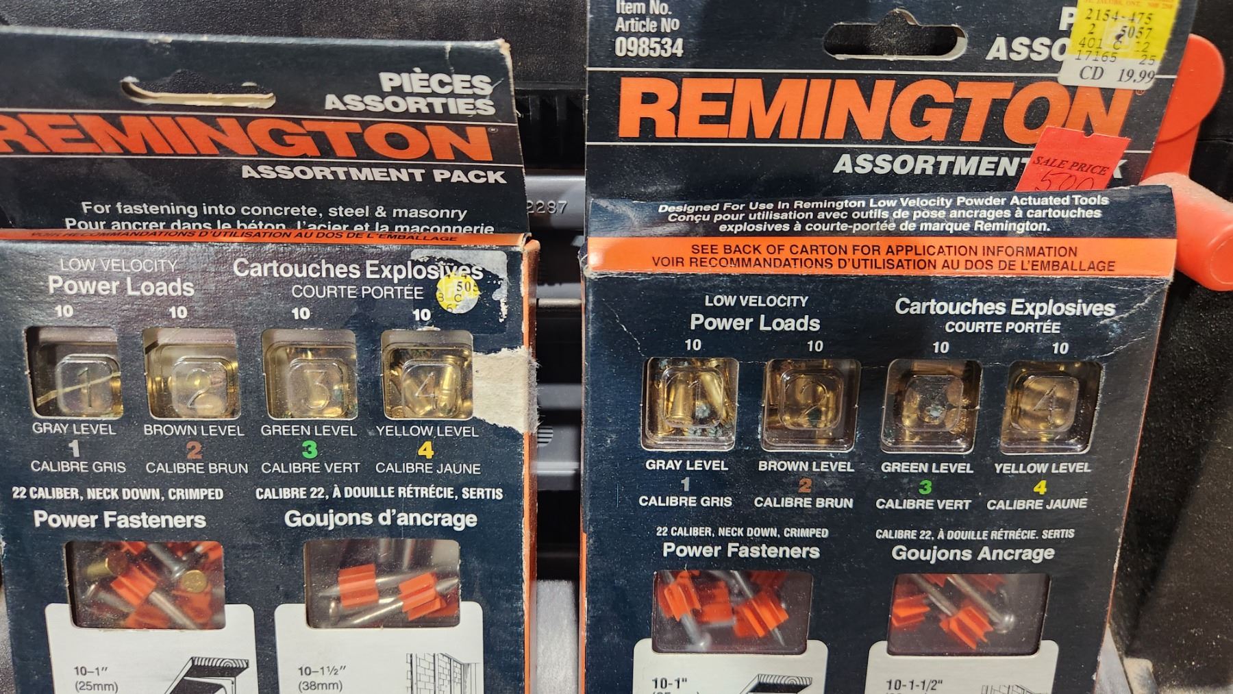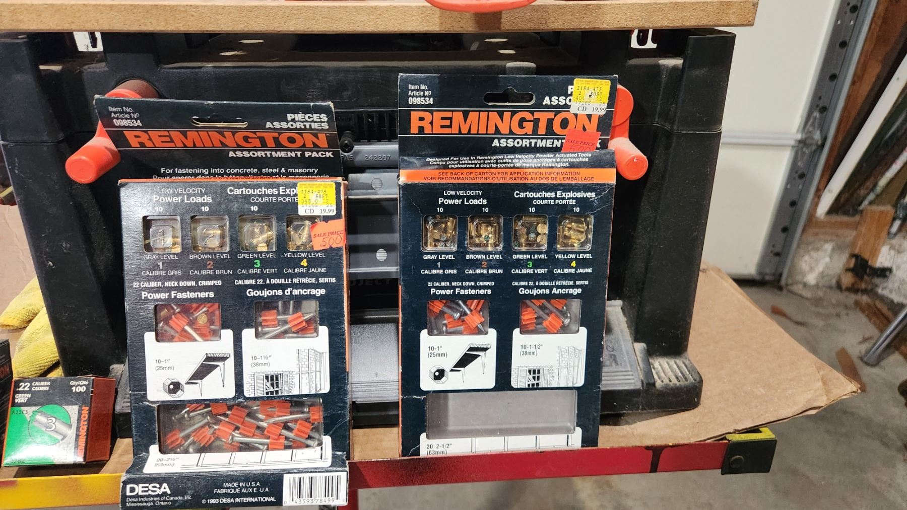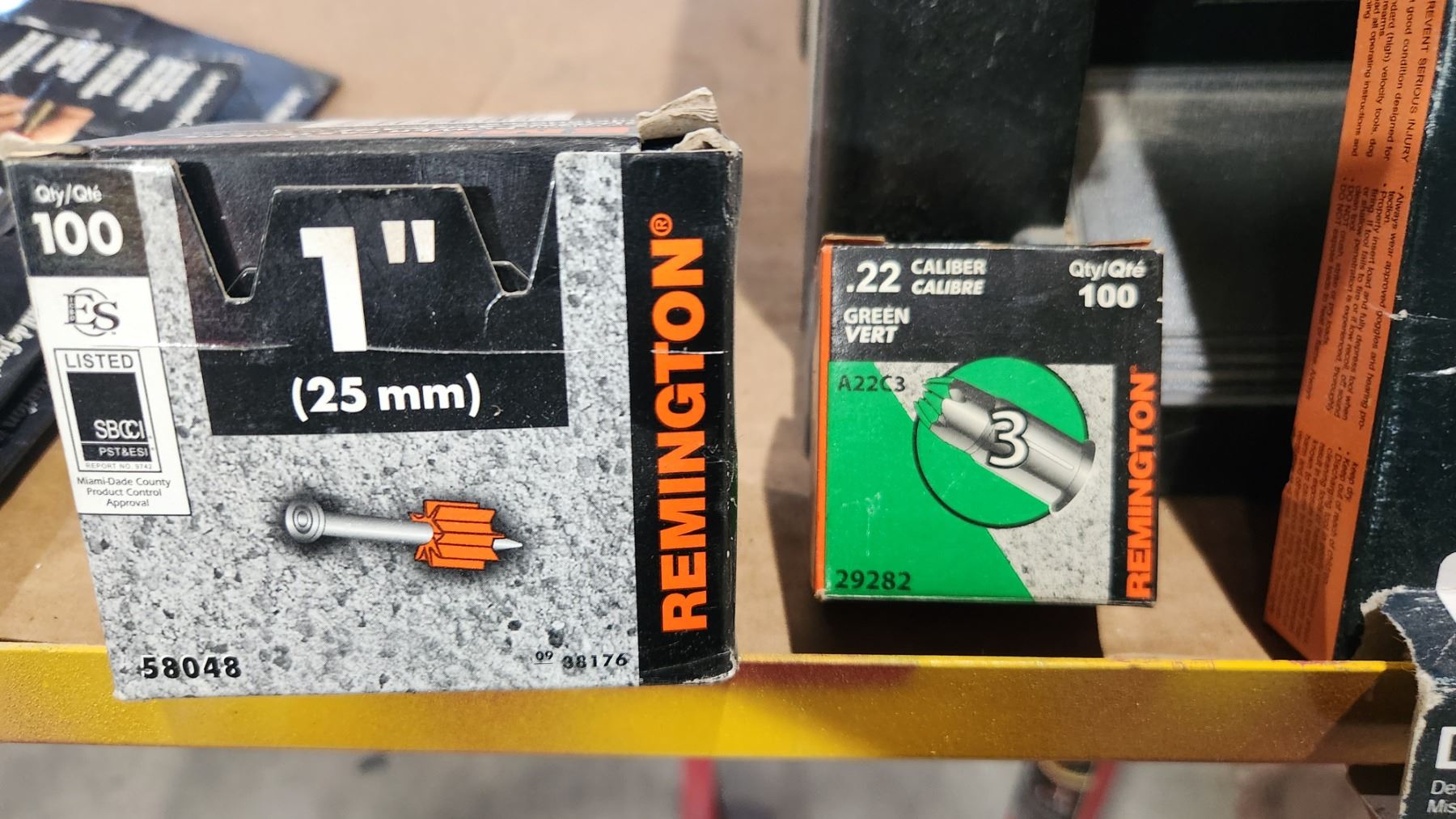 REMINGTON 47 POWER HAMMER C/W FASTENERS, APPROX 200 .22 SHOTS WITH WORKMATE TOOL BOX.