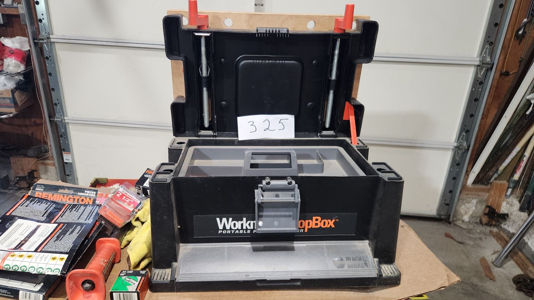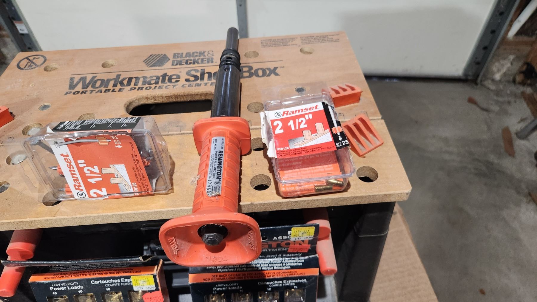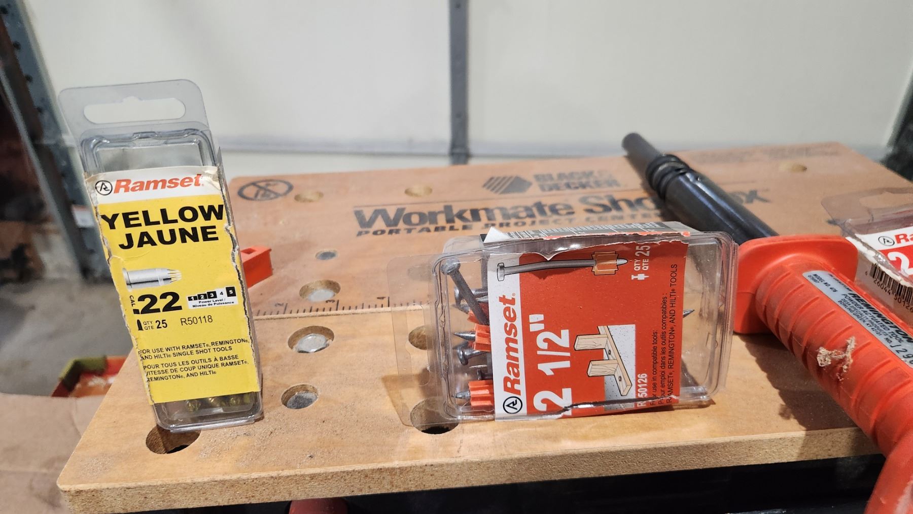 REMINGTON 47 POWER HAMMER C/W FASTENERS, APPROX 200 .22 SHOTS WITH WORKMATE TOOL BOX.