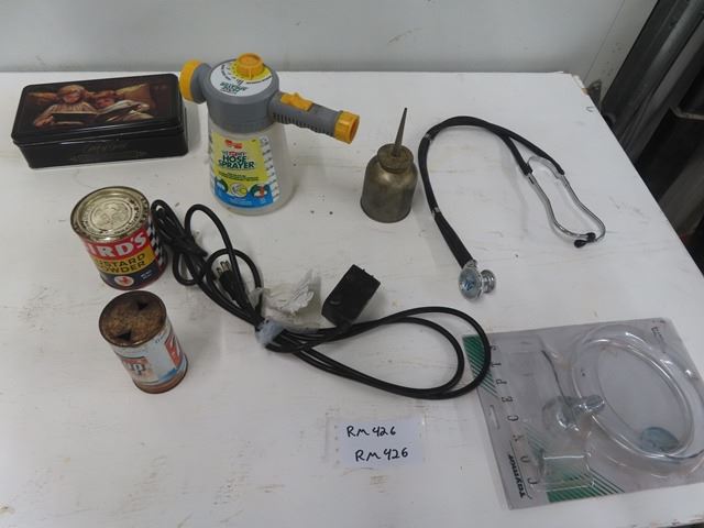 (RM) Vintage 7 UP and Custard Tins, Water Fountain Pump, Stethoscope, Wet Dry Hose Prayers Plus More!