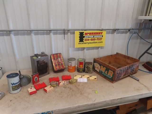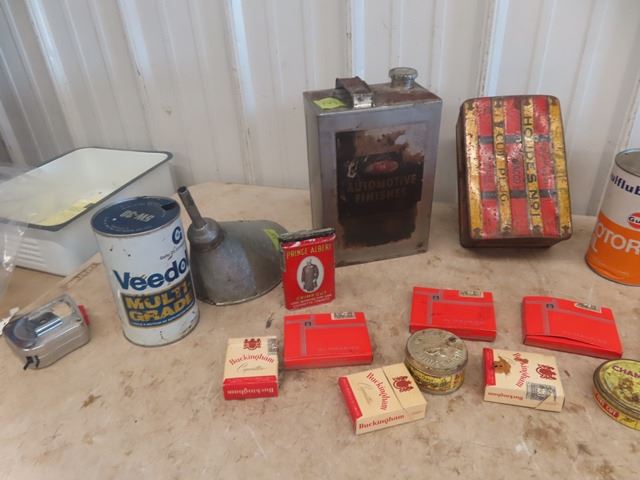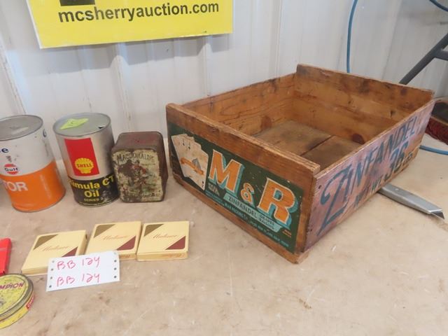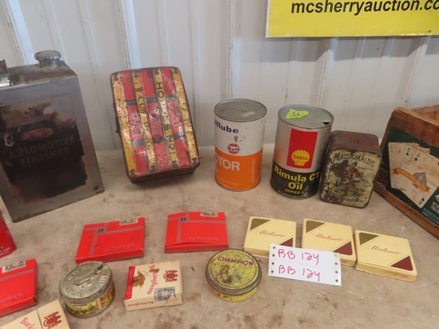Rare 2oz Log Cabin Tobacco Tin, Houdes, Champion, Vintage Cigarette Packs, Oil Tins, plus Wooden Cra
