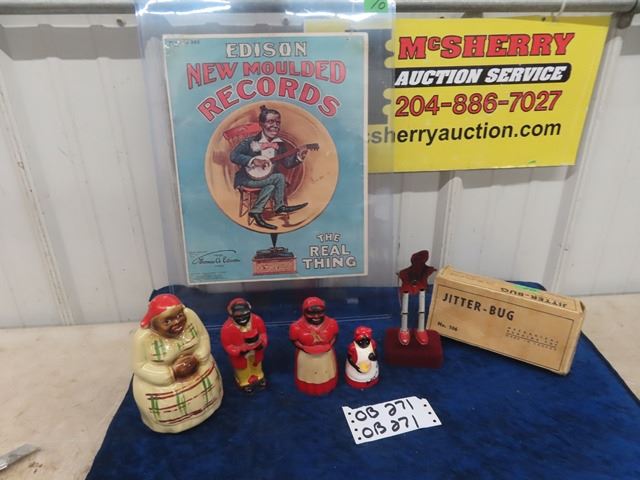 Rare Antique Black Americana Pottery String Holder, Antique Black S+P, Antique Tin Jitter Bug Toy with Original Box, Vintage Edison Advert Sign