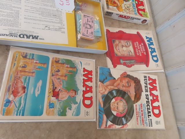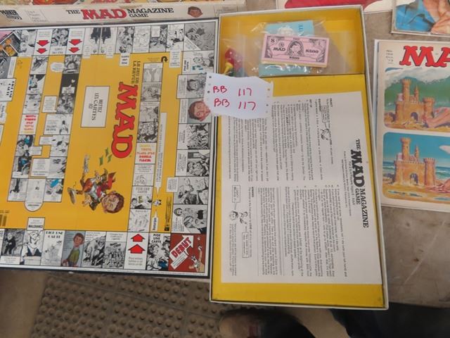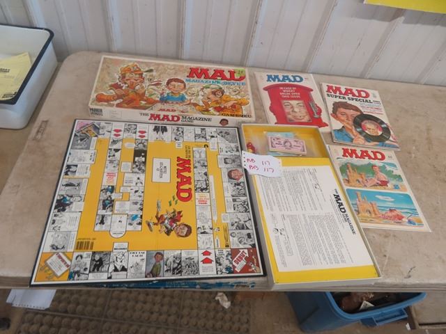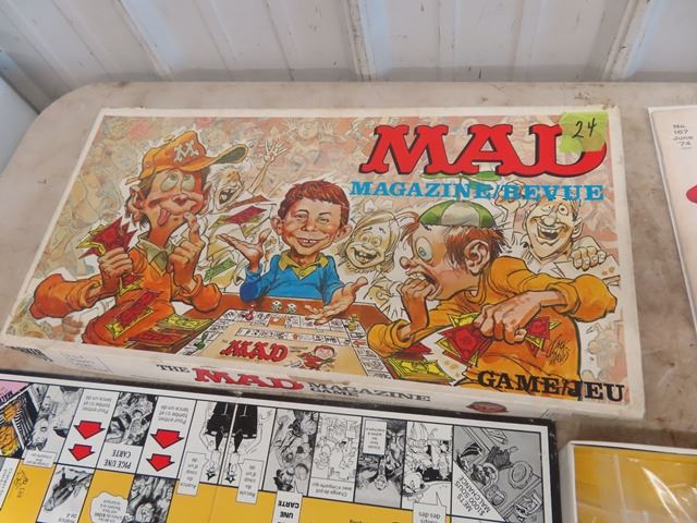 Rare English/French Version of MAd Magazine Board Game 1979 - Game Pieces Complete - Box has Corner Tear otherwie good condition & (3) 1970's Mad MAgazines