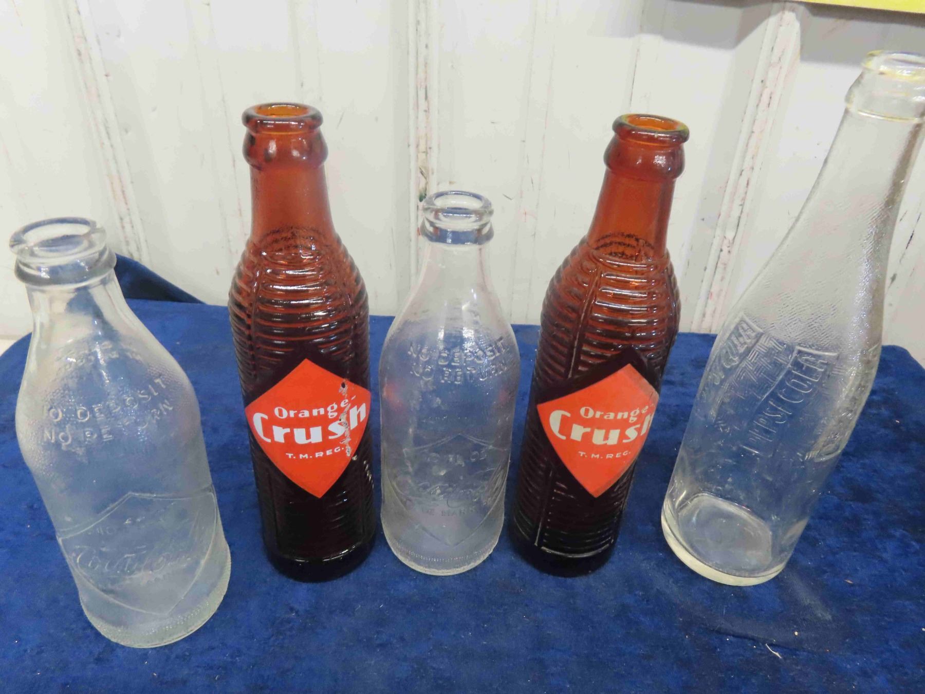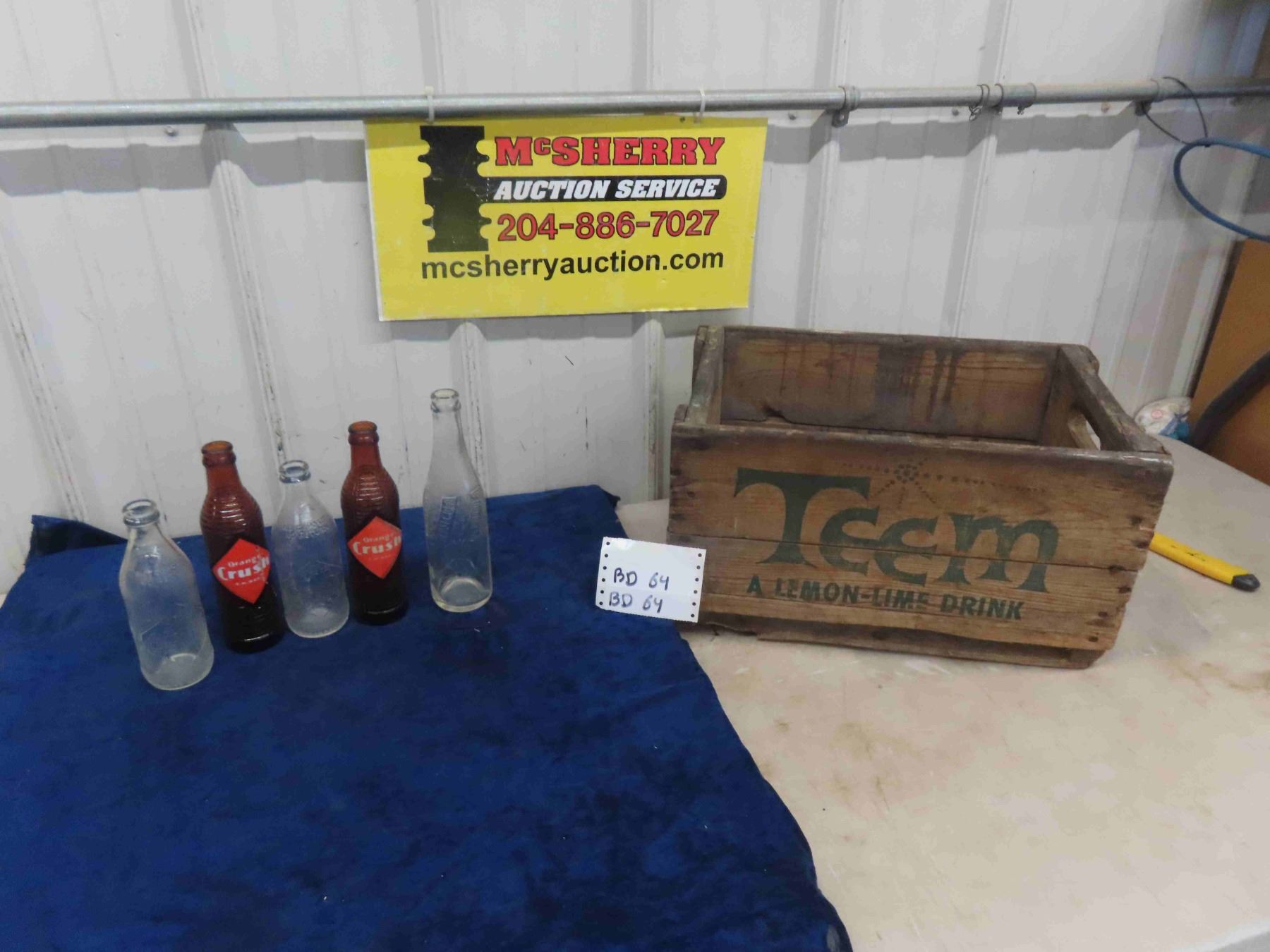 Rare Vintage Teem Lemon Lime Drink Wooden Crate + Vintage Coke, Pepsi, 2 Amber Orange Crush Bottles