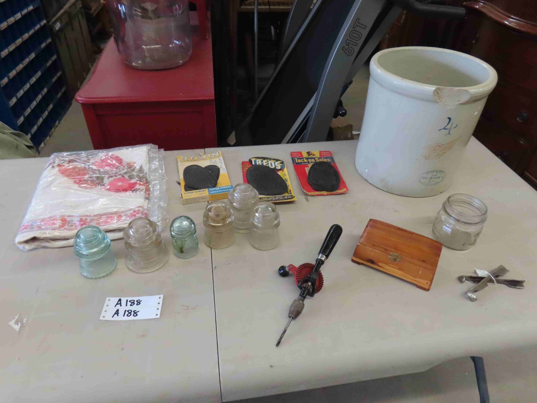 Red Wing 4 Gal Crock, Table Cloth, Rubber Soles on Cards, Insulators, Wooden Box, Hand Drill
