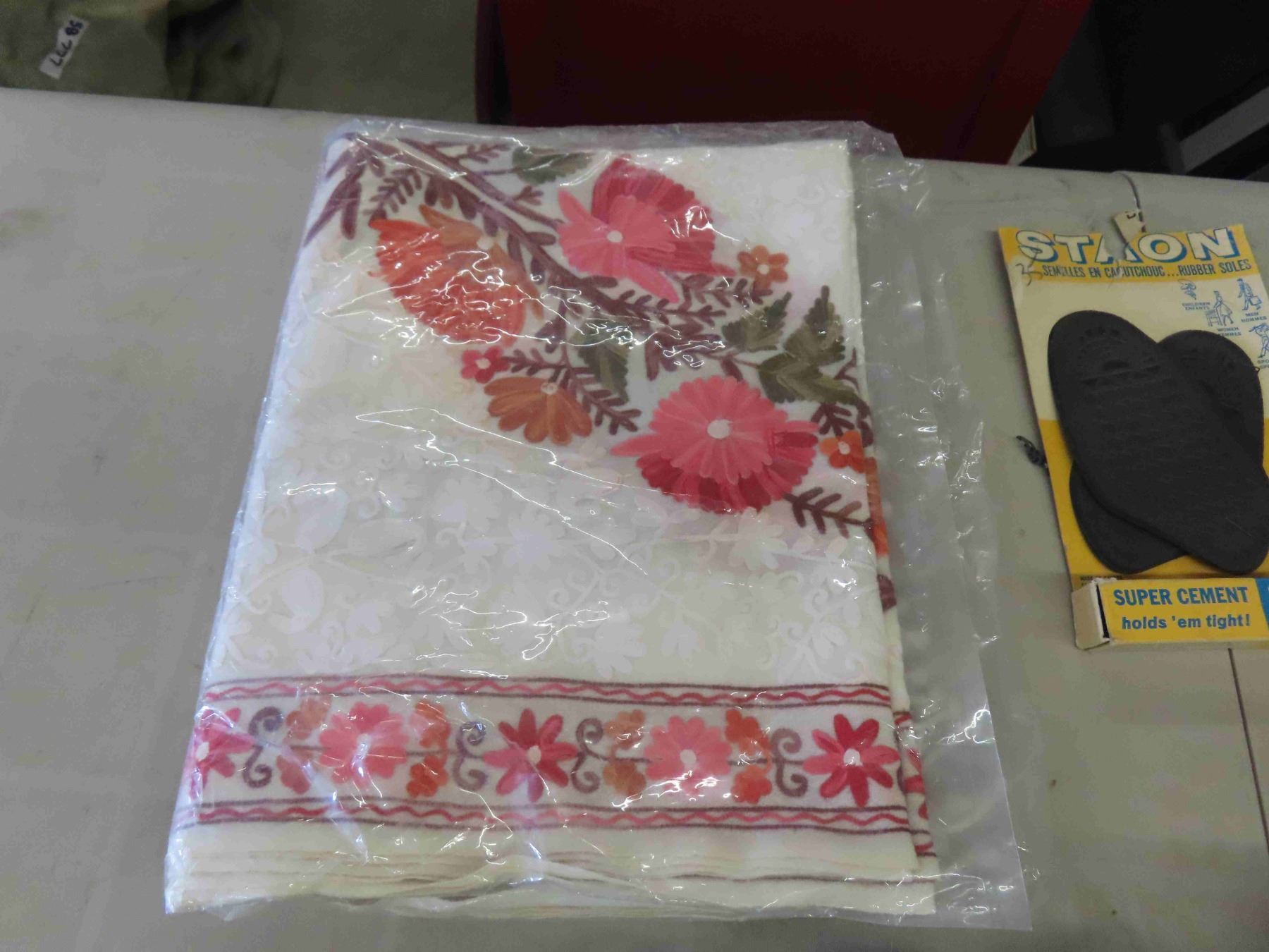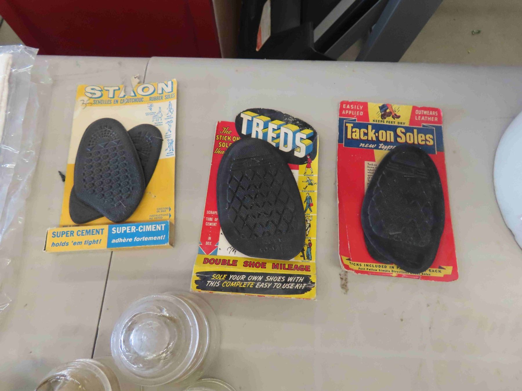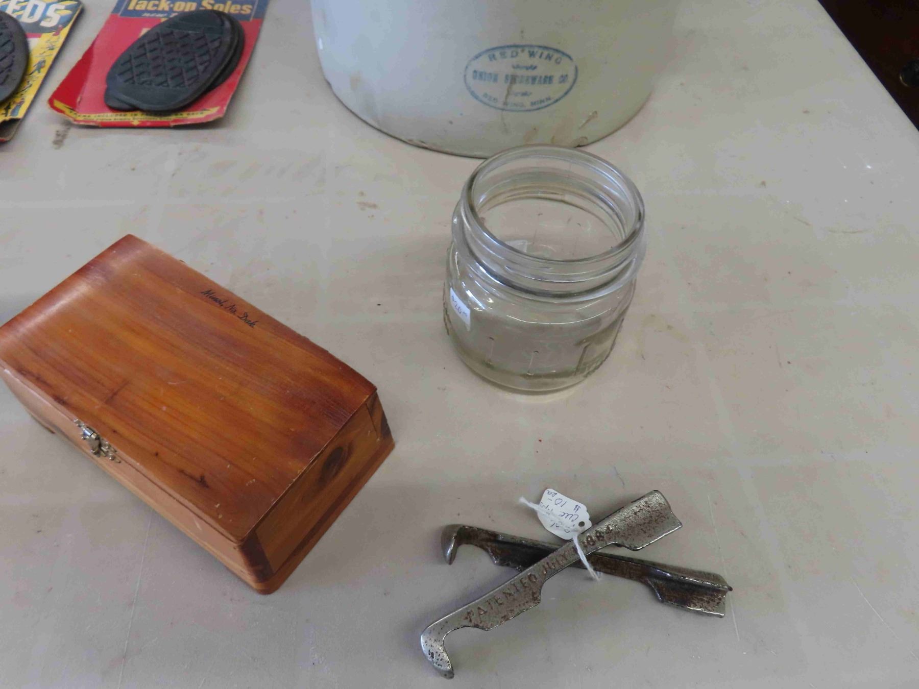 Red Wing 4 Gal Crock, Table Cloth, Rubber Soles on Cards, Insulators, Wooden Box,