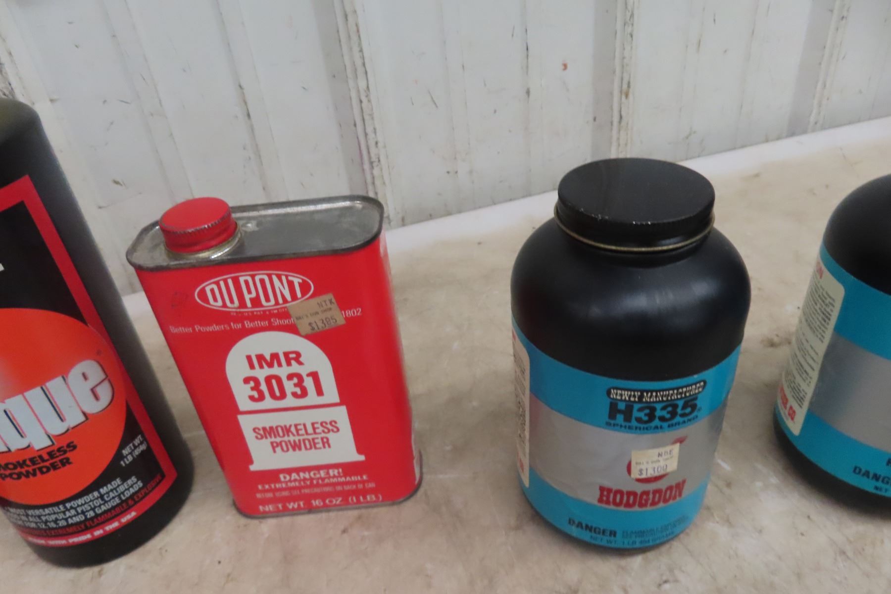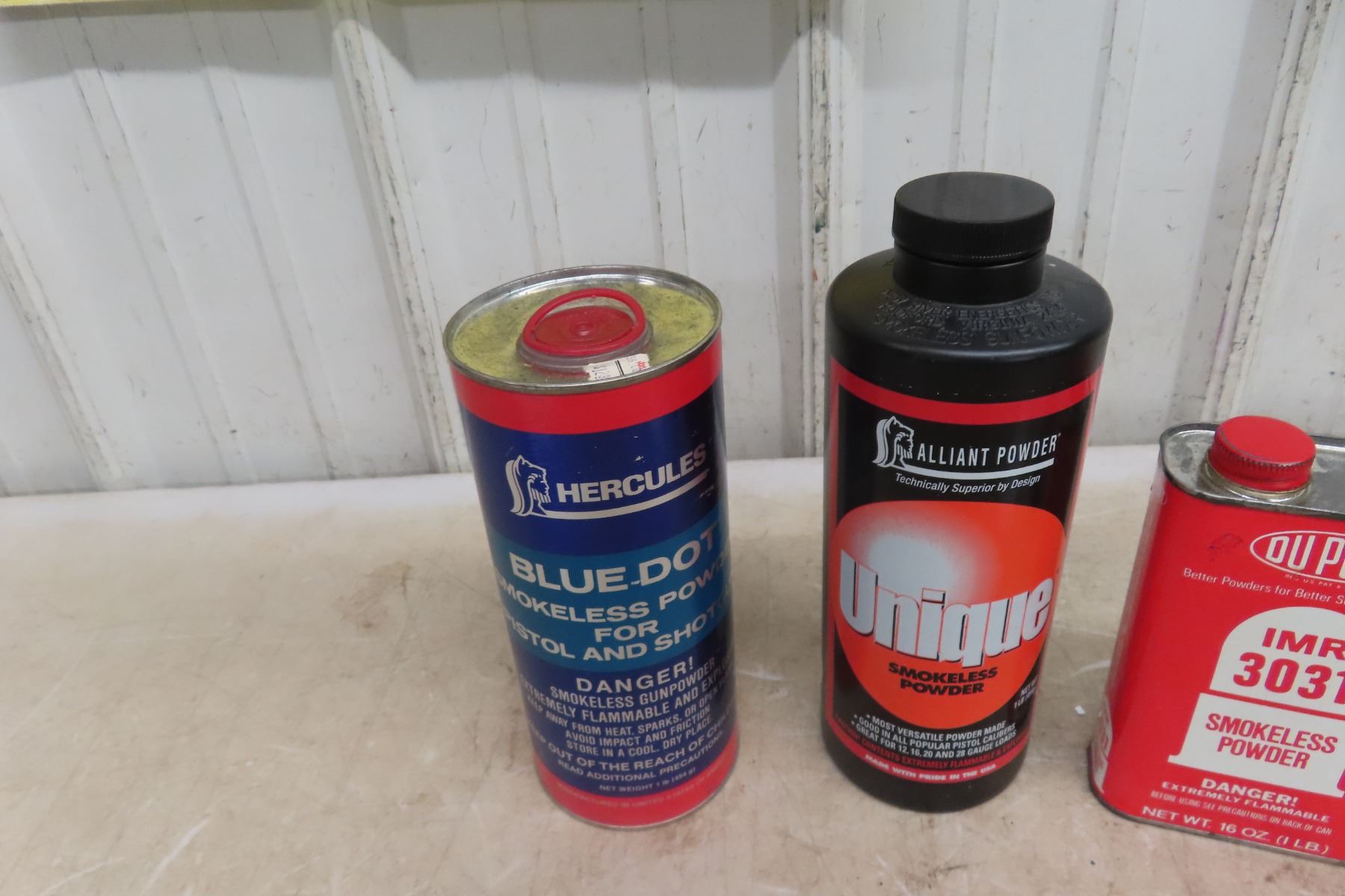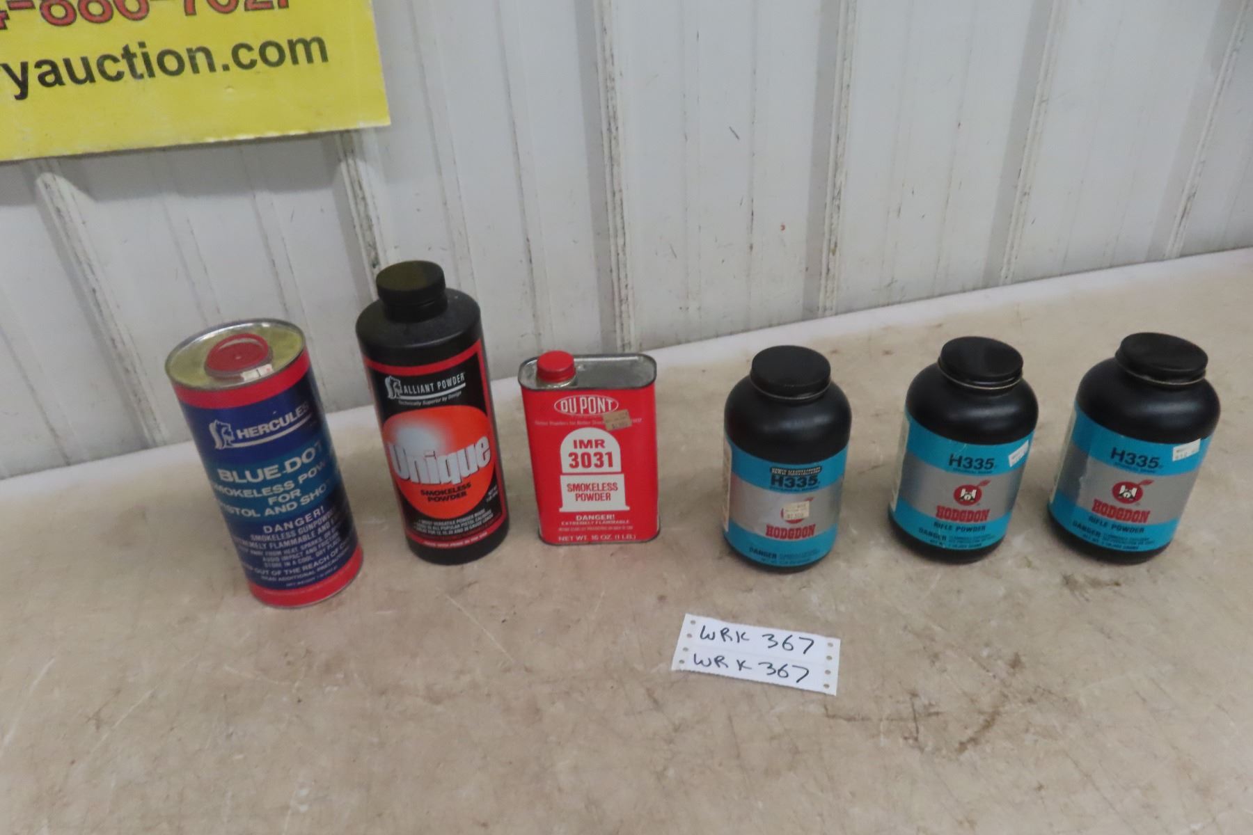 Reload Powders- H335 ( 3 Full Containers ), Unique Smokeless Powder( 1 Container) , Blue Dot Smokeless Powder for Pistol and Shot Gun ( Half Container), IMR 3031 Smokeless Powder *** Use at Own Risk*** **** Must Have Pal, MUST PRESENT PAL WHEN PAYING INVOICE. WE DO NOT AND WILL NOT SHIP AMMO. IF YOU WIN AMMO YOU WILL BE RESPONSIBLE TO PAY FOR IT AND RESELL IT UNDER YOUR OWN CONSIGNMENT.