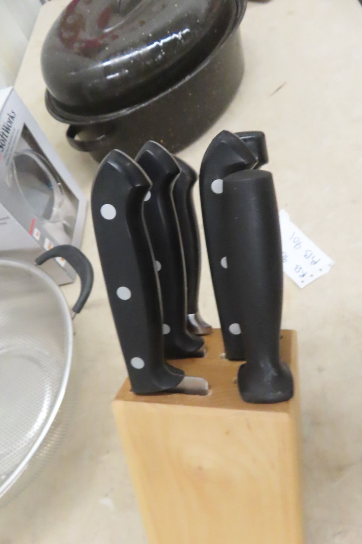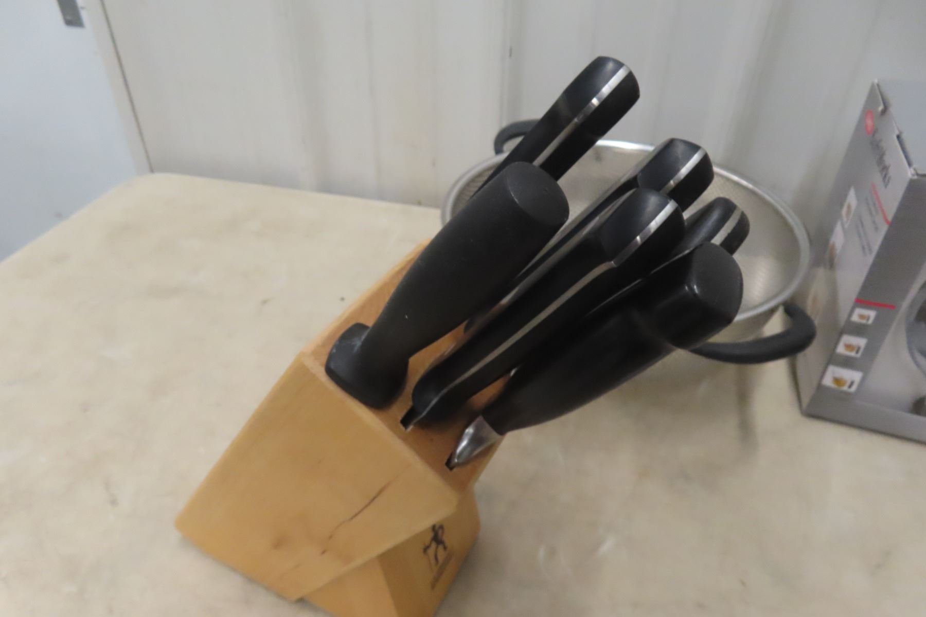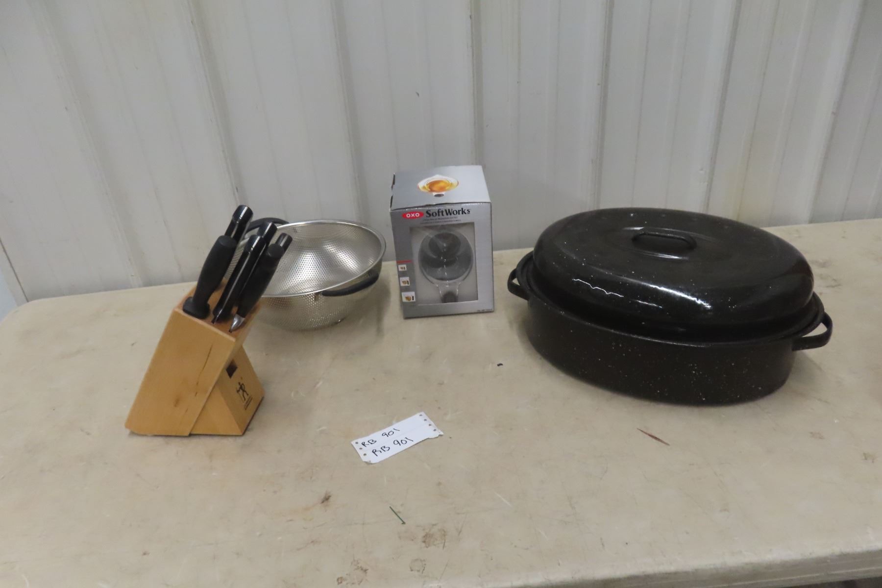 Roaster, Henckels Knife Set on Block, New Measuring Cup & Strainer
