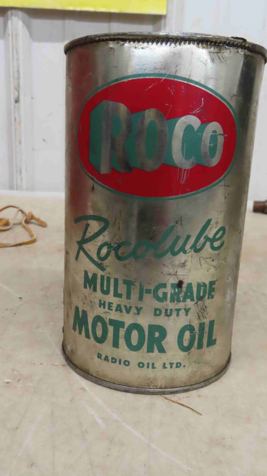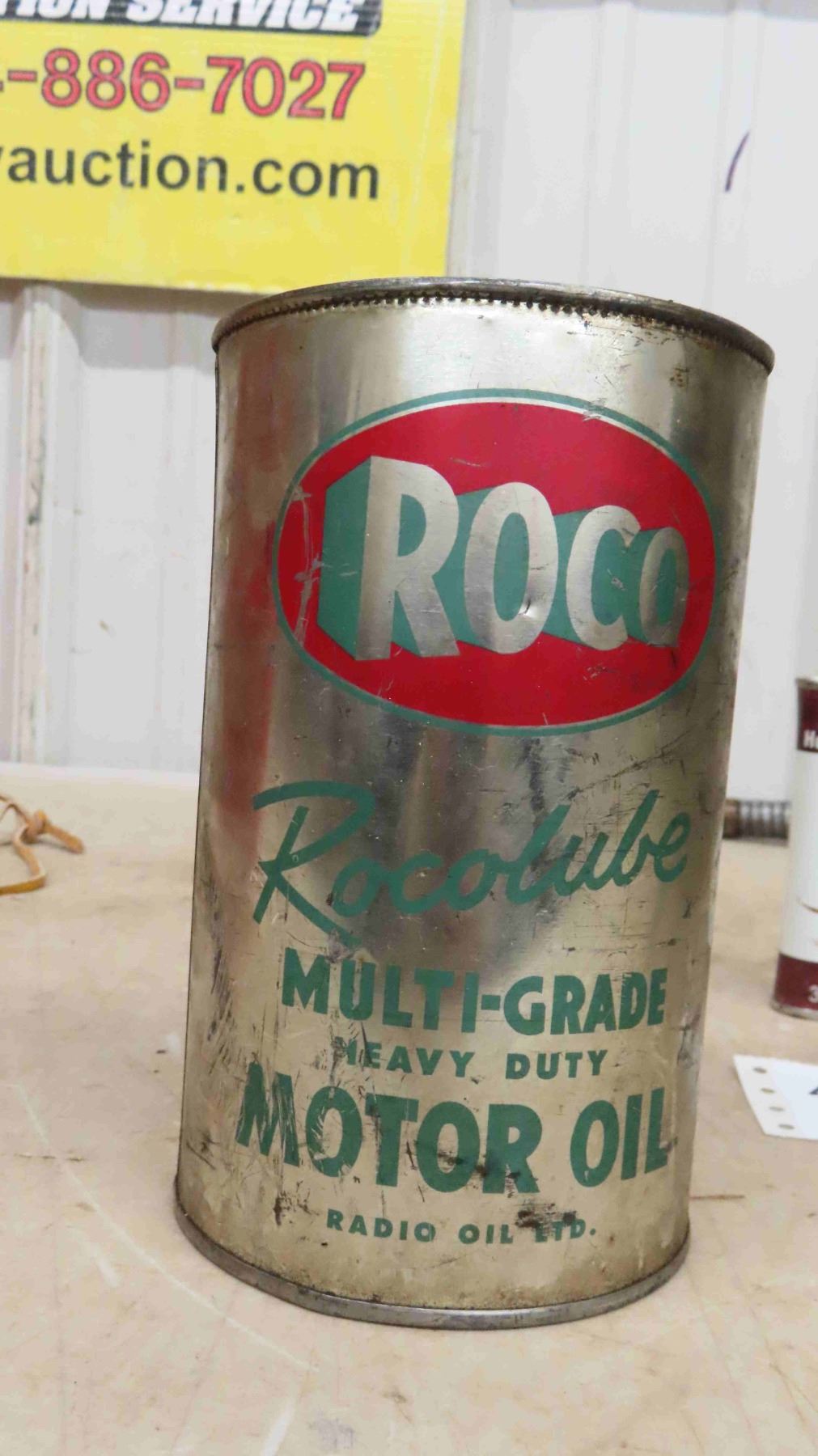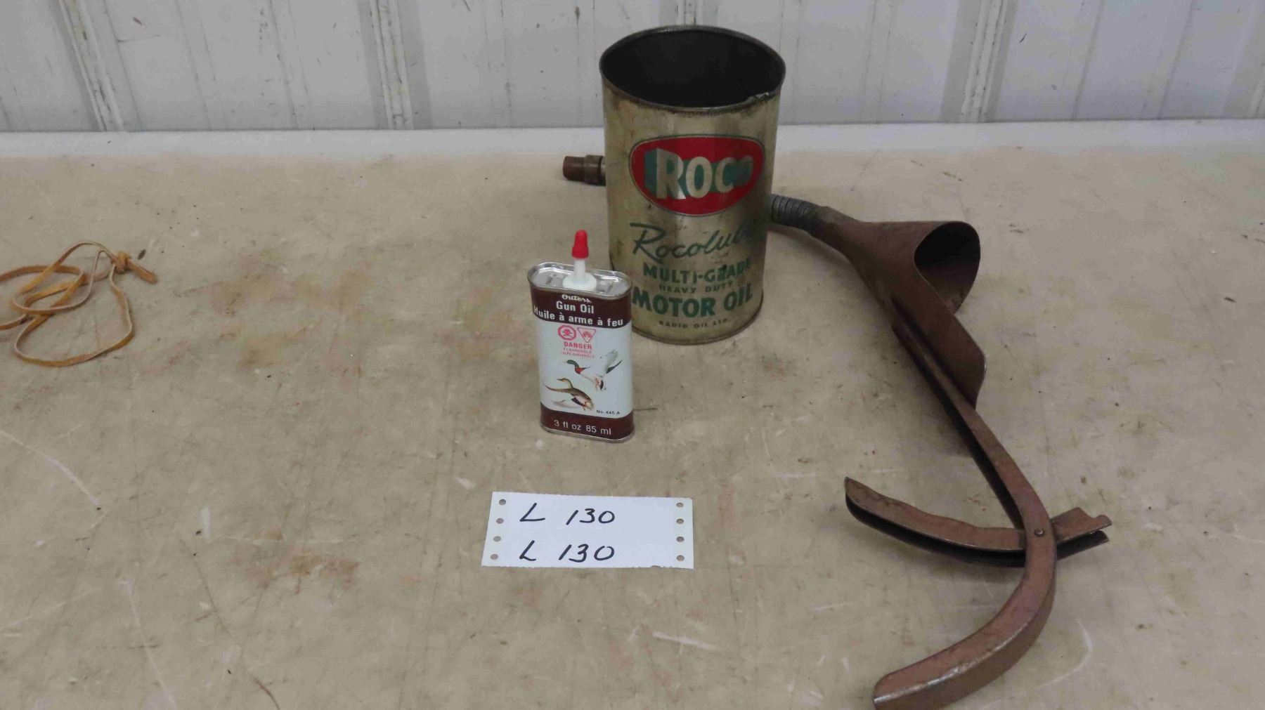 Roco Motor Oil Quart Tin, can of Gun Oil, Vintage Oil Funnel with Can Holder