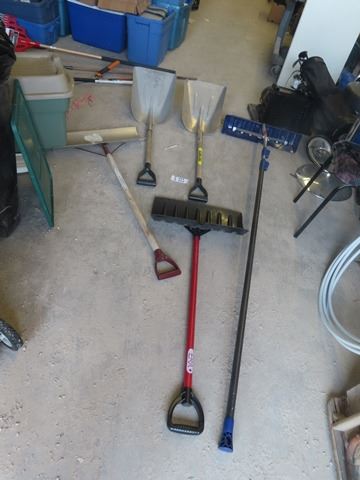 Roof Rake, 2 Push Shovels,& Alum Shovels