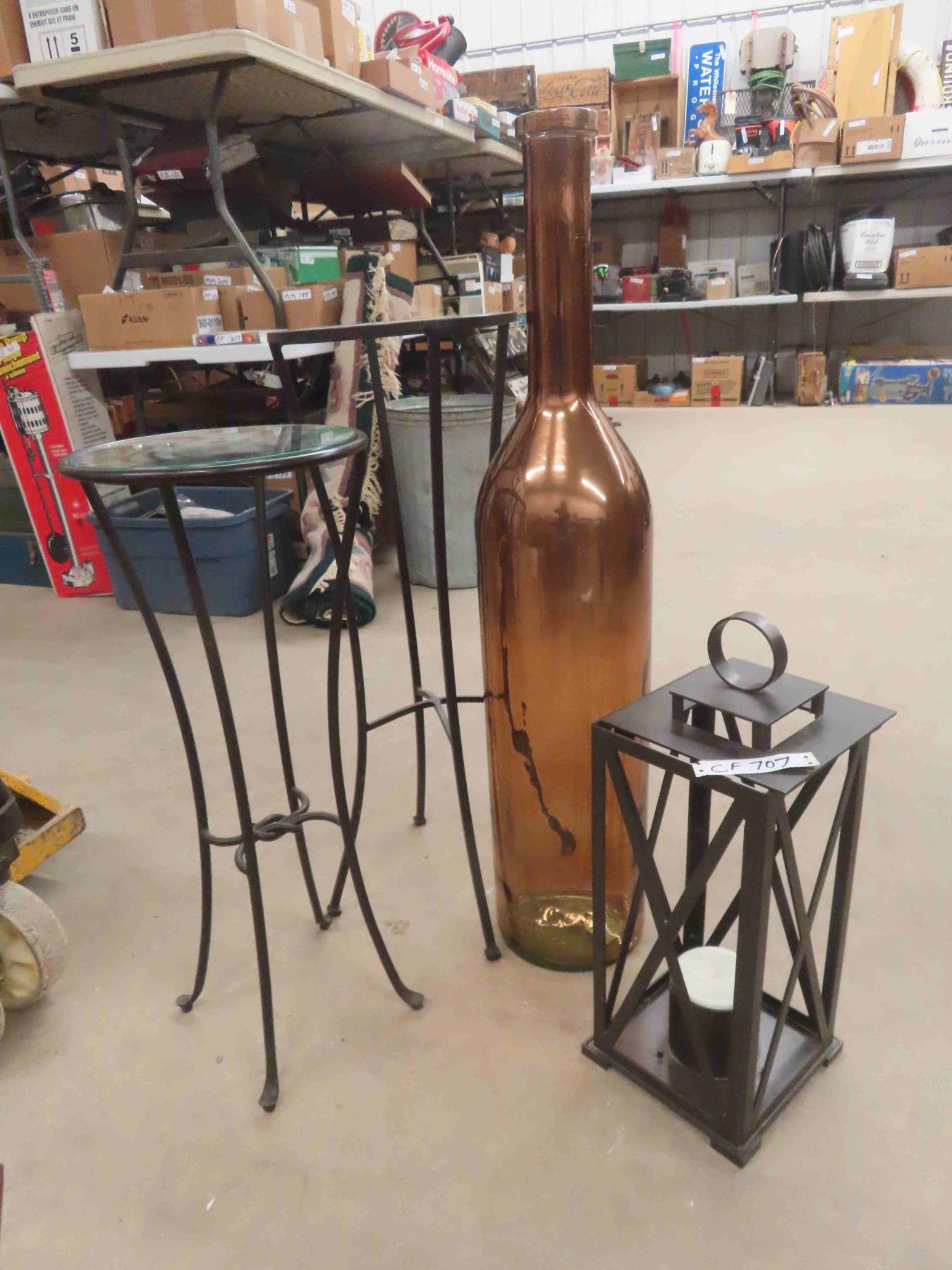 Room Décor : 40'' Glass Vase , Metal Lantern Style Candle Holder , 2 Glass Top Stands 32'' + 28'' Tall