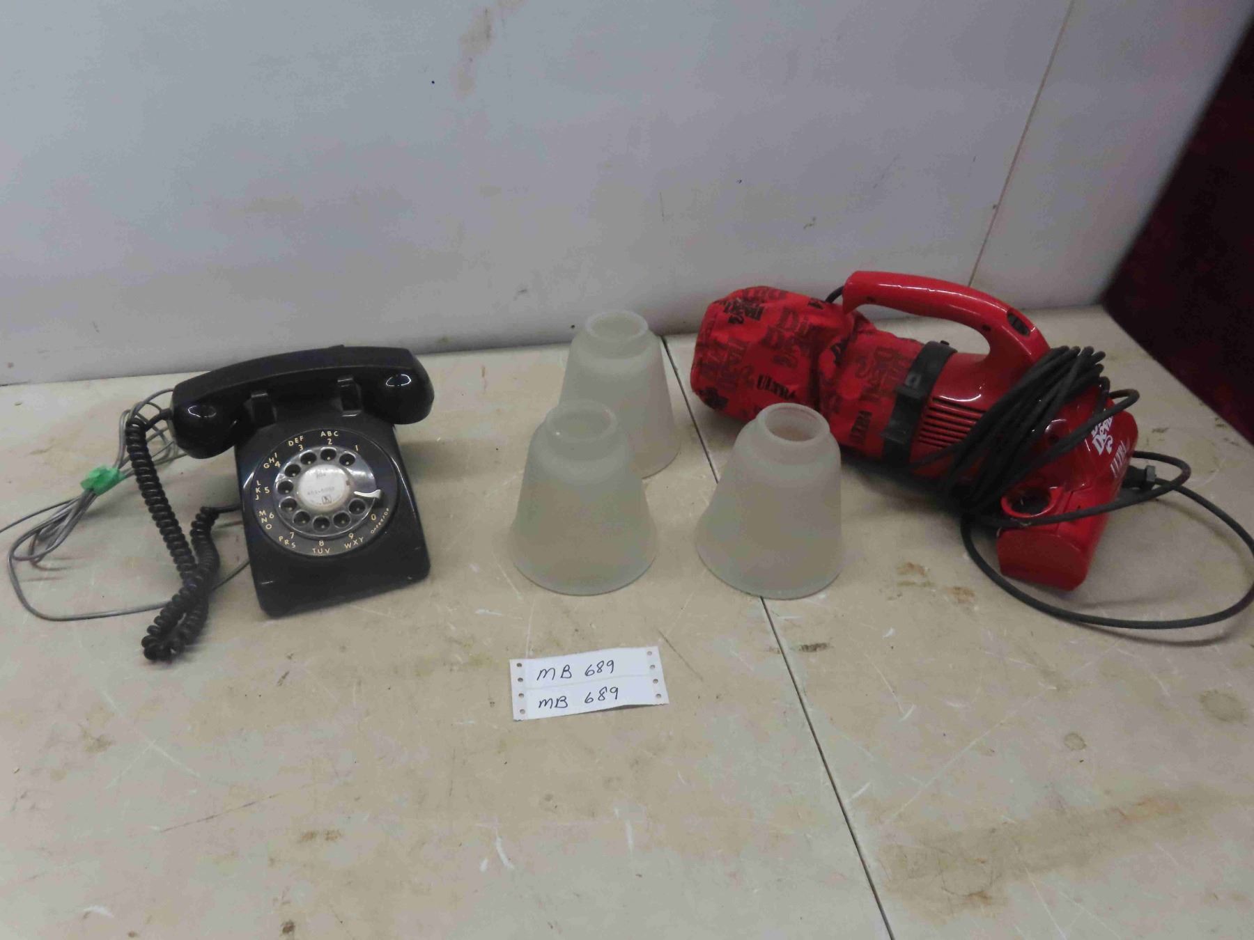 Rotary Desk Phone, Dirt Devil Small Electric Vacuum, 3 Glass Light Shades